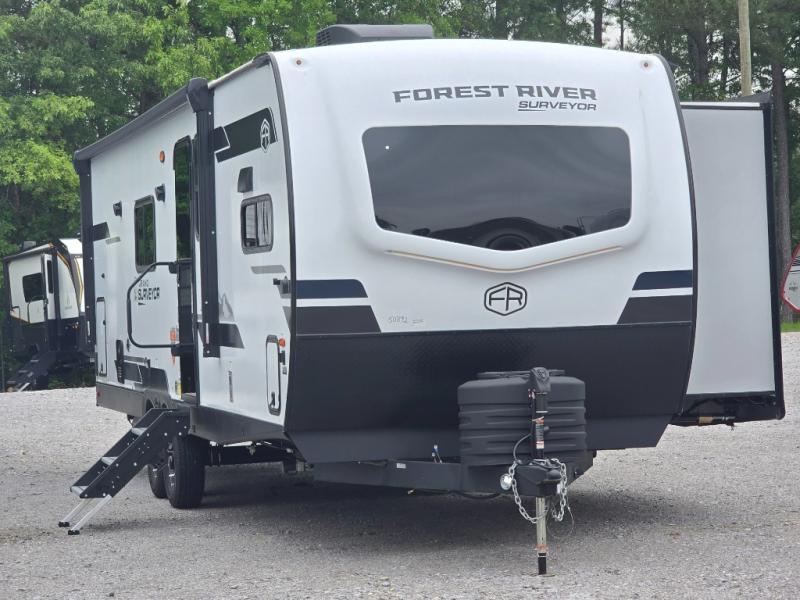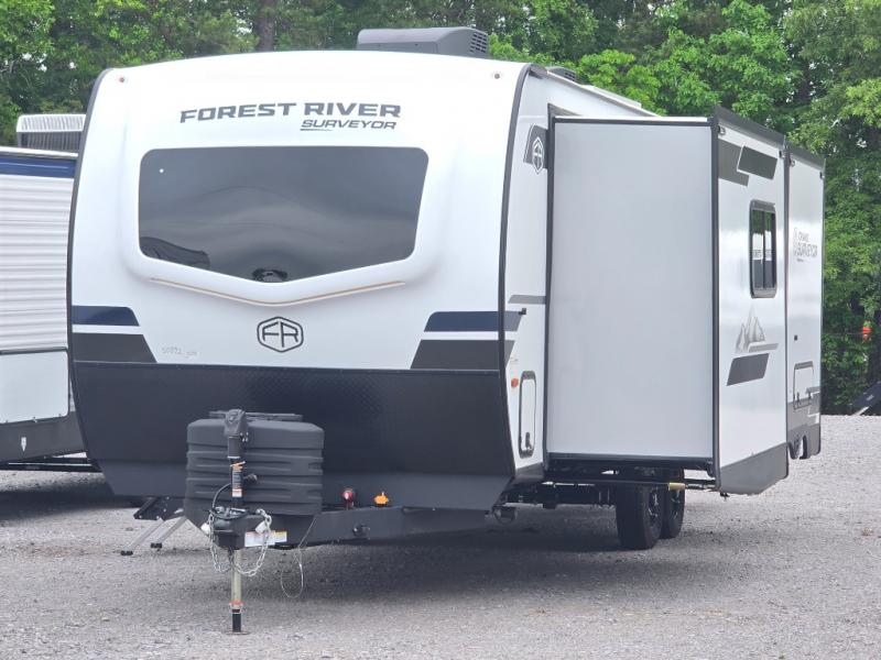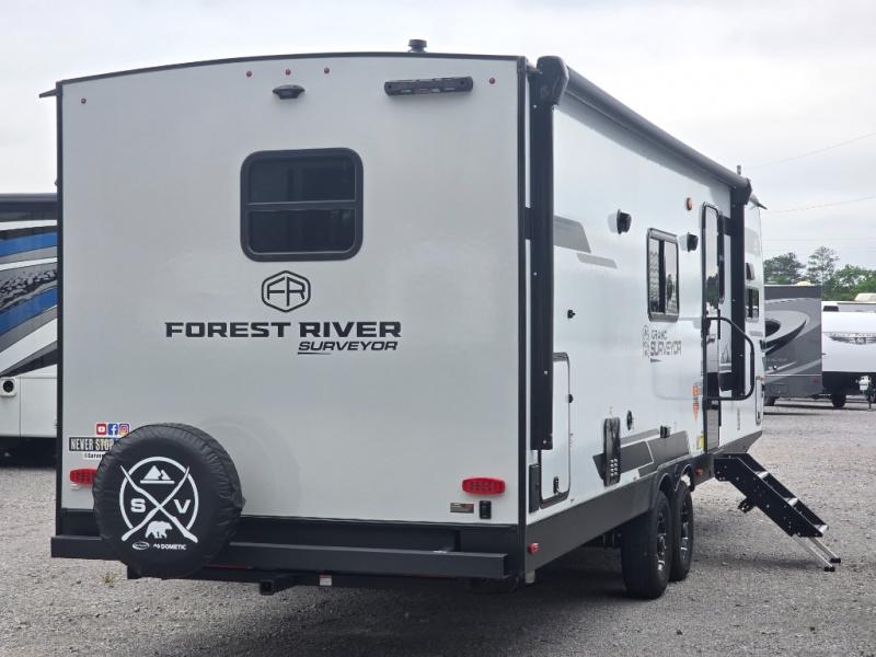 With any Grand Surveyor travel trailer by Forest River you will enjoy turn-key ready-to-go features and quality construction! Each model includes Azdel composite walls and a gel coated fiberglass front cap with an automotive style tinted windshield for a sleek look. There are friction hinge black glass entry door(s), an adjustable platform step with a night light, plus Goodyear tires and a power tongue jack for easy towing. The interior will have you feeling right at home with roller shades, residential faucets, sinks, and bathroom vanity, plus Surf(x) seamless countertops throughout. You can also plan for adventure with a 2" rear accessory and exterior spray port, and there are slam latch exterior baggage doors throughout to keep all your gear secure. Other stand-out features include a central vacuum system, a 200 watt solar panel with a 30 amp controller, a tankless water heater, carpet-free interiors, and the list goes on!