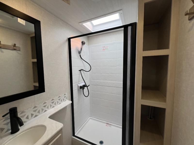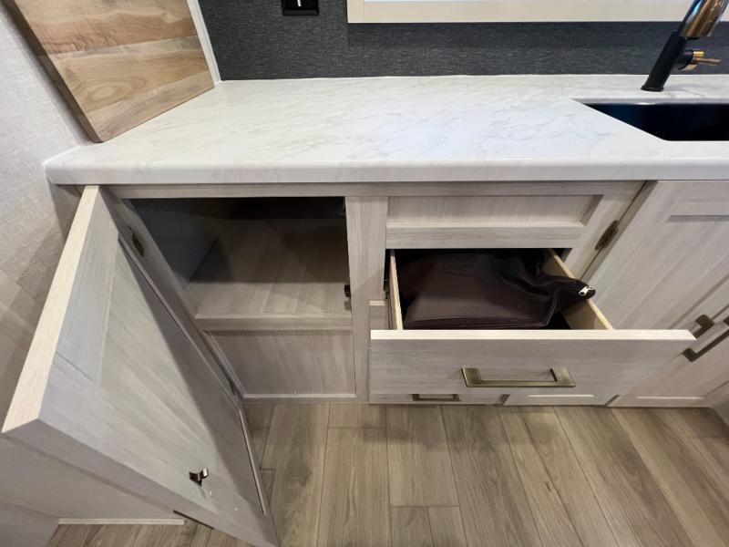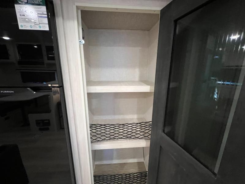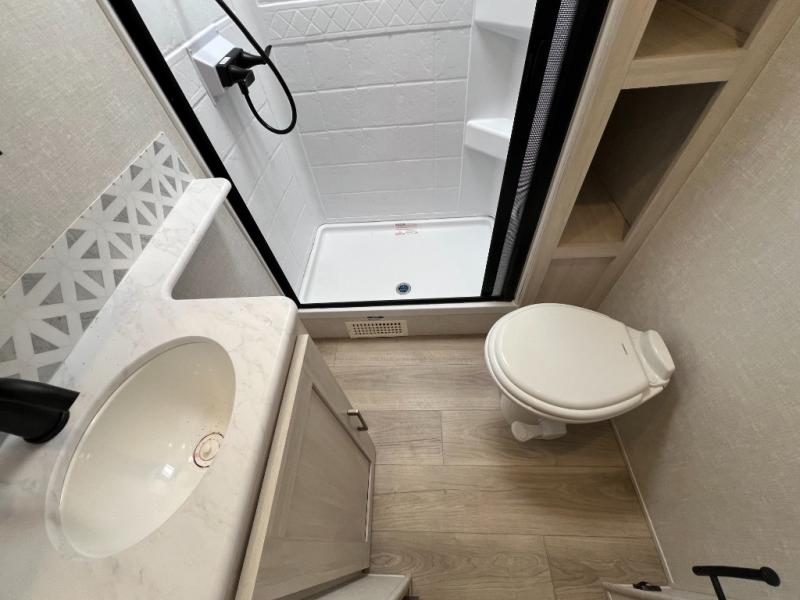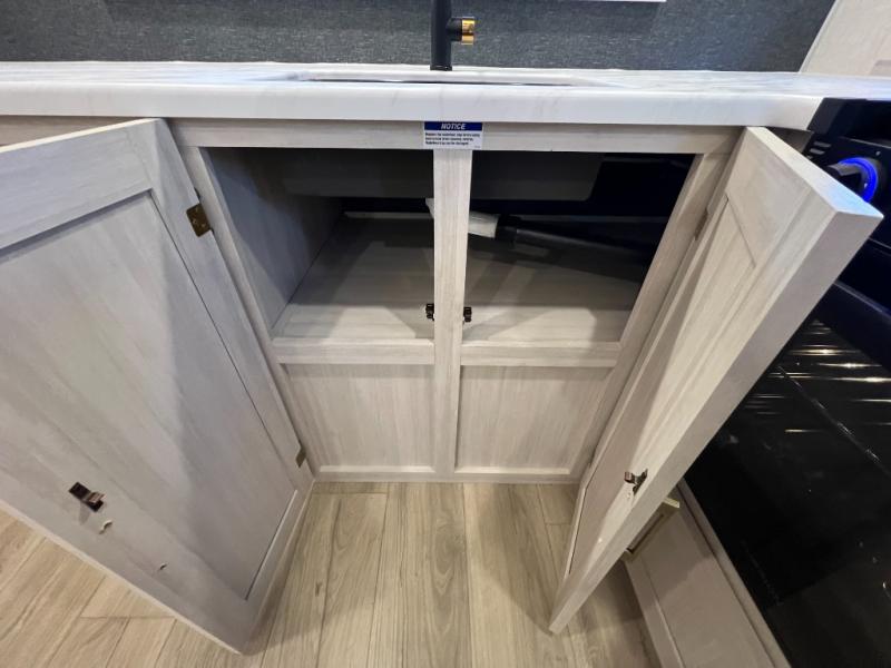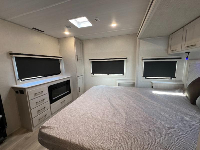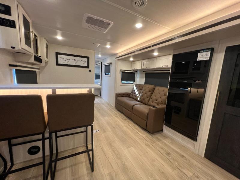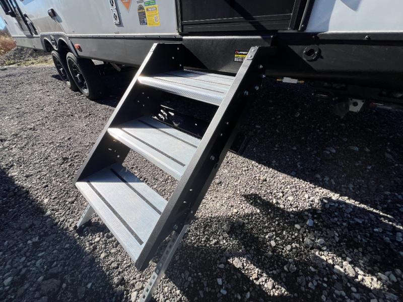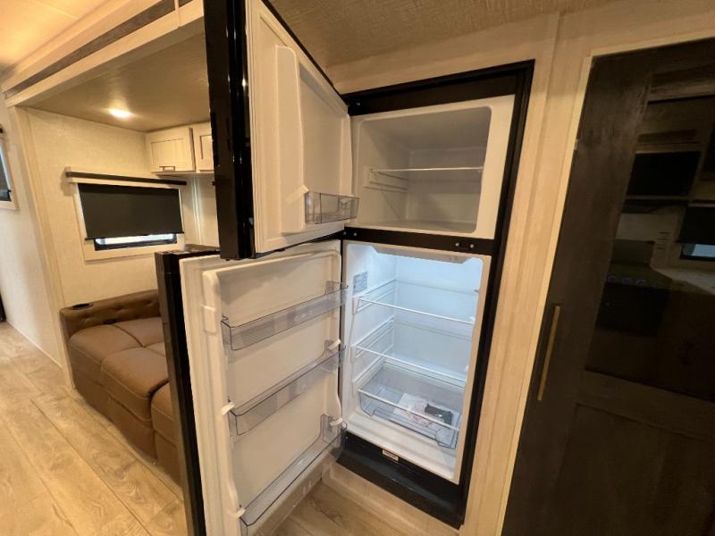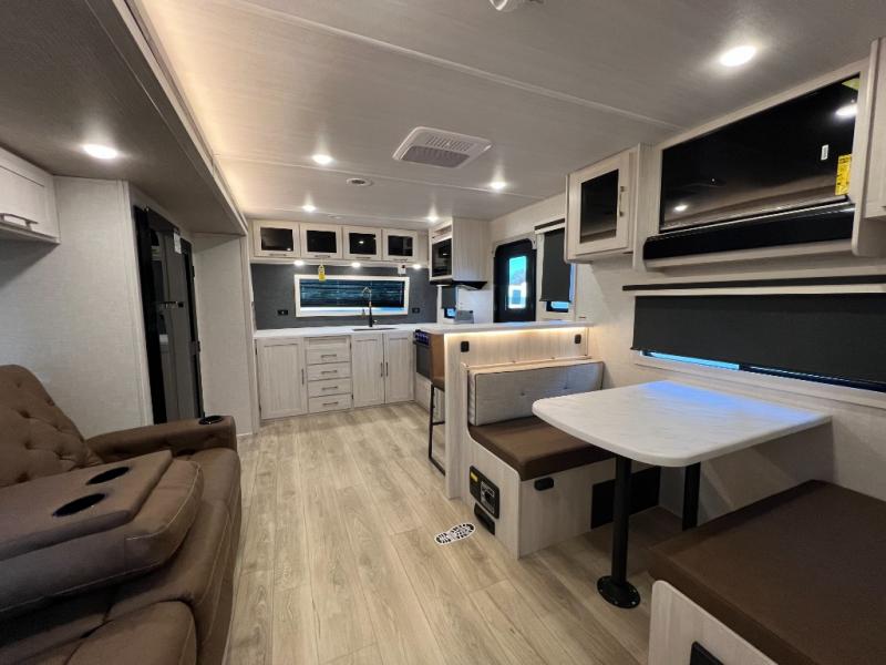This travel trailer is a masterpiece of comfort, style, and functionality. Take the party outside with the outdoor kitchen, perfect for family dining, socializing, and making unforgettable memories! Retreat to the serene bedroom, featuring a king bed, spacious wardrobe, and overhead storage for effortless organization, plus, cozy up by the warm fireplace on chilly nights. Moreover, the incredible kitchen is a culinary dream, equipped with a pantry, 10 cu. refrigerator, overhead cabinets, and a countertop with stylish bar stools. The living room is a haven of relaxation, boasting a vibrant LED TV, overhead cabinets, and theater seating. Also, share meals with loved ones at the convenient dinette. Finally, bath in the amazing full bathroom, perfect for cleaning up after a long day in the woods.