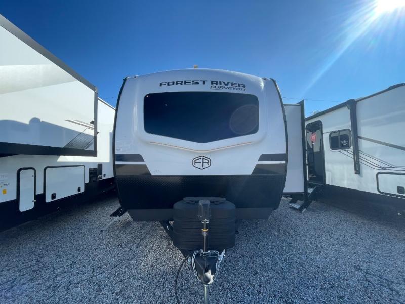 With any Grand Surveyor travel trailer by Forest River you will enjoy turn-key ready-to-go features and quality construction! Each model includes Azdel composite walls and a gel coated fiberglass front cap with an automotive style tinted windshield for a sleek look. There are friction hinge black glass entry door(s), an adjustable platform step with a night light, plus Goodyear tires and a power tongue jack for easy towing. The interior will have you feeling right at home with roller shades, residential faucets, sinks, and bathroom vanity, plus Surf(x) seamless countertops throughout. You can also plan for adventure with a 2" rear accessory and exterior spray port, and there are slam latch exterior baggage doors throughout to keep all your gear secure. Other stand-out features include a central vacuum system, a 200 watt solar panel with a 30 amp controller, a tankless water heater, carpet-free interiors, and the list goes on!