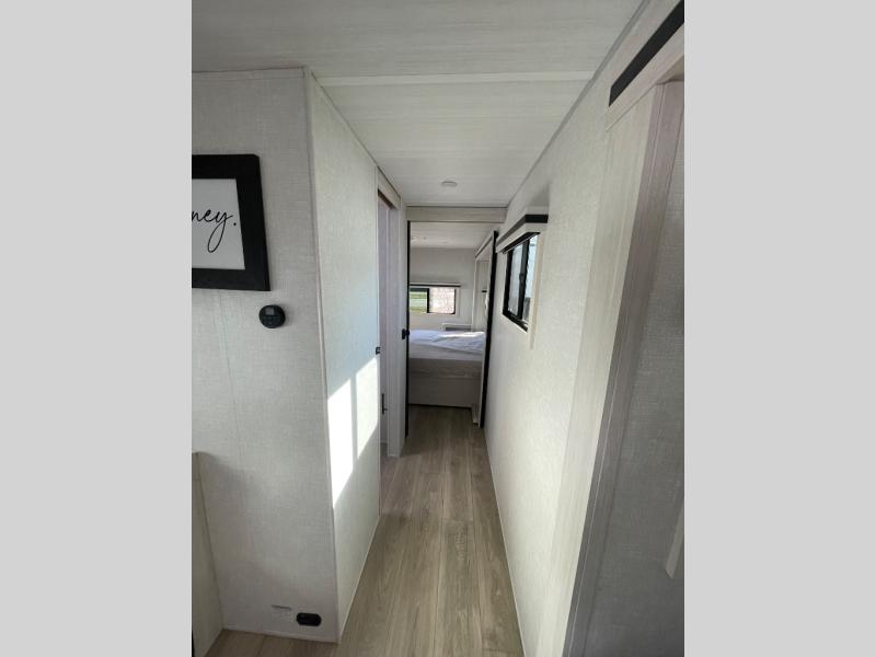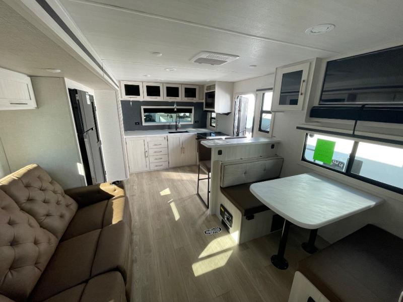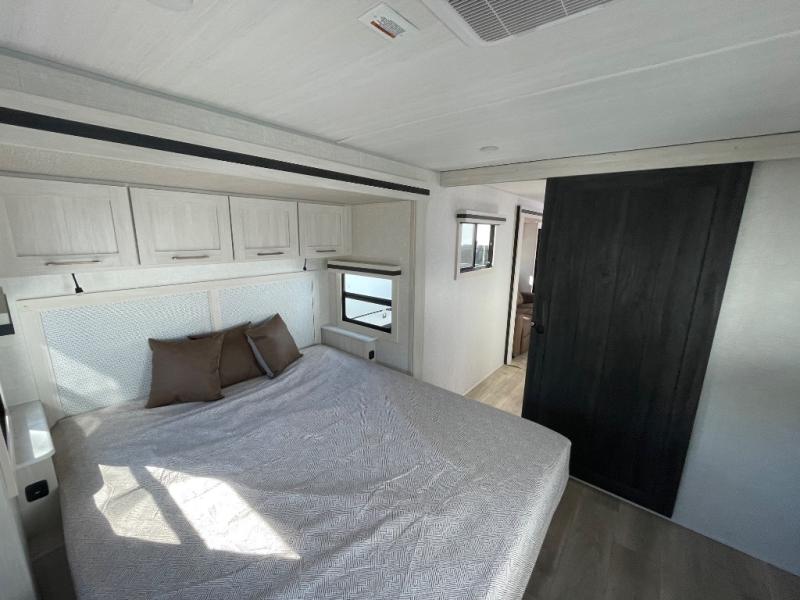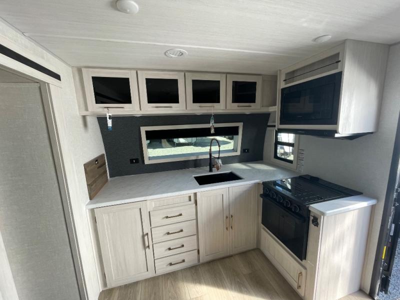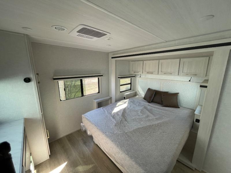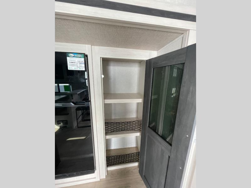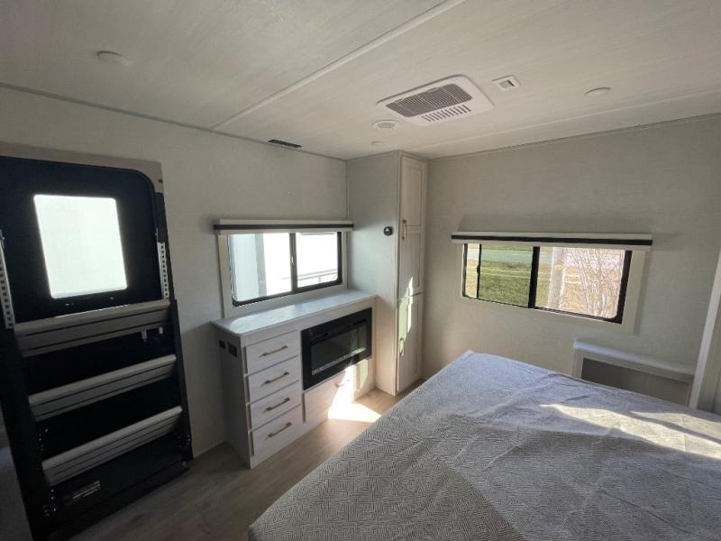 This travel trailer is a masterpiece of comfort, style, and functionality. Take the party outside with the outdoor kitchen, perfect for family dining, socializing, and making unforgettable memories! Retreat to the serene bedroom, featuring a king bed, spacious wardrobe, and overhead storage for effortless organization, plus, cozy up by the warm fireplace on chilly nights. Moreover, the incredible kitchen is a culinary dream, equipped with a pantry, 10 cu. refrigerator, overhead cabinets, and a countertop with stylish bar stools. The living room is a haven of relaxation, boasting a vibrant LED TV, overhead cabinets, and theater seating. Also, share meals with loved ones at the convenient dinette. Finally, bath in the amazing full bathroom, perfect for cleaning up after a long day in the woods.