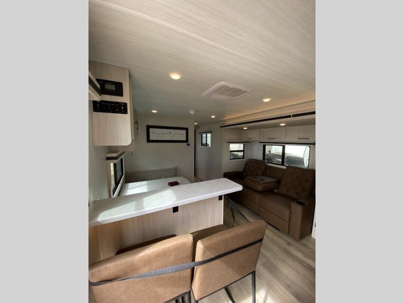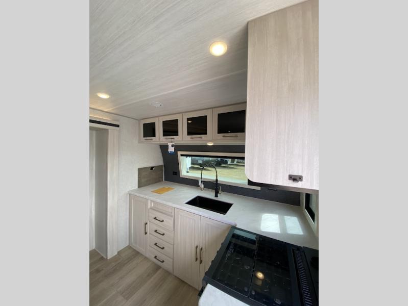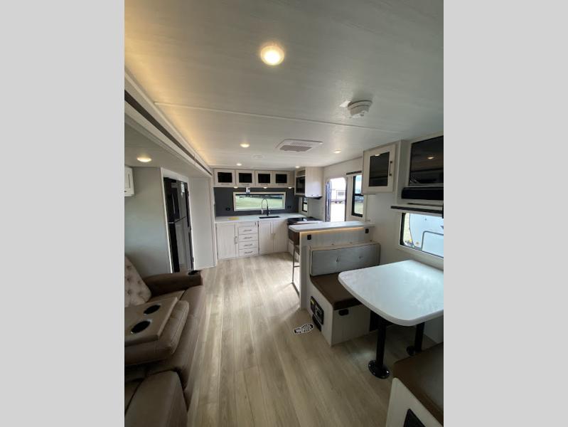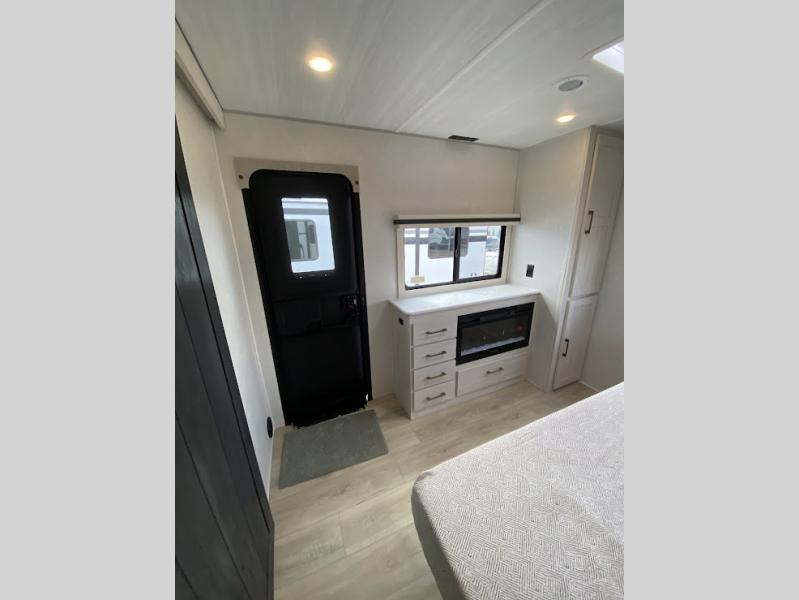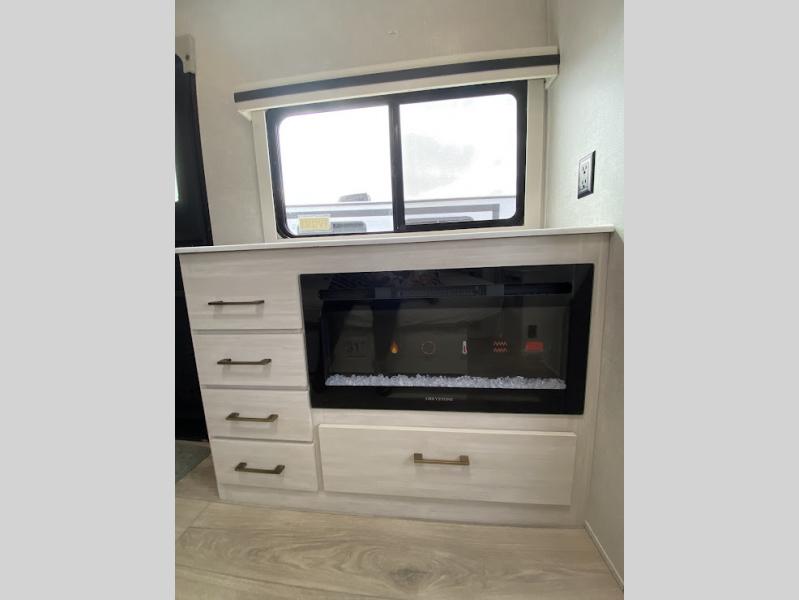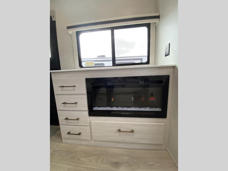 This travel trailer is a masterpiece of comfort, style, and functionality. Take the party outside with the outdoor kitchen, perfect for family dining, socializing, and making unforgettable memories! Retreat to the serene bedroom, featuring a king bed, spacious wardrobe, and overhead storage for effortless organization, plus, cozy up by the warm fireplace on chilly nights. Moreover, the incredible kitchen is a culinary dream, equipped with a pantry, 10 cu. refrigerator, overhead cabinets, and a countertop with stylish bar stools. The living room is a haven of relaxation, boasting a vibrant LED TV, overhead cabinets, and theater seating. Also, share meals with loved ones at the convenient dinette. Finally, bath in the amazing full bathroom, perfect for cleaning up after a long day in the woods.