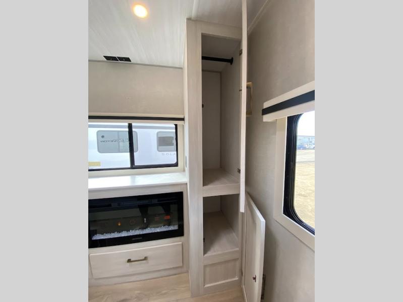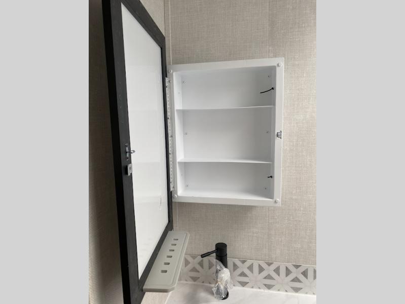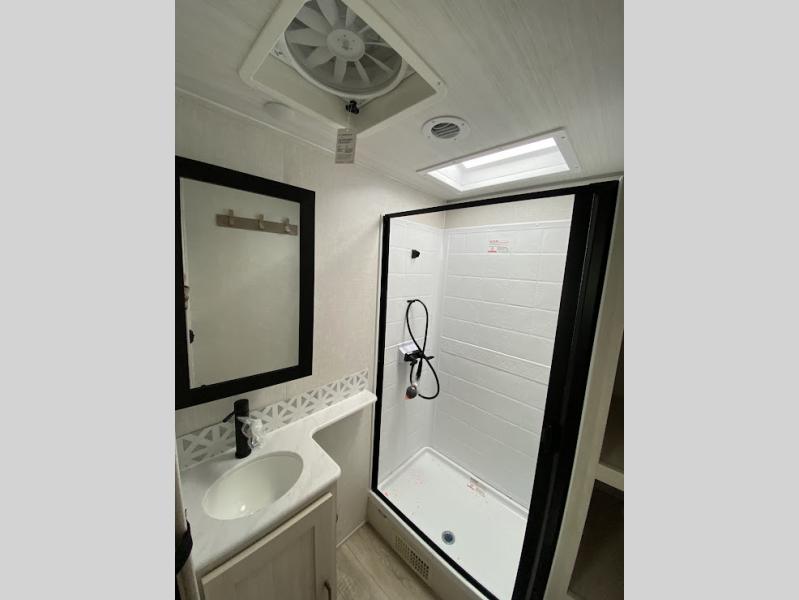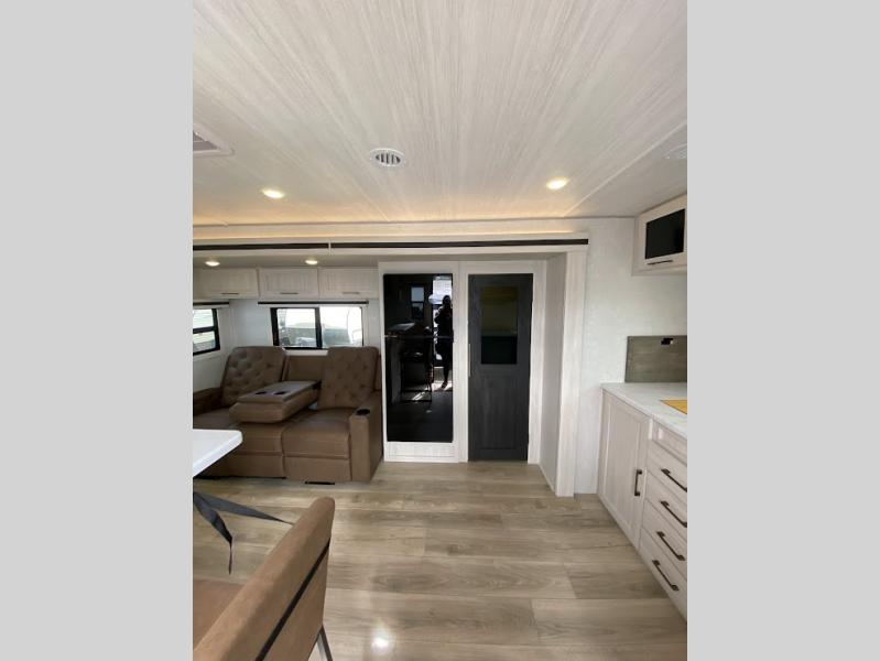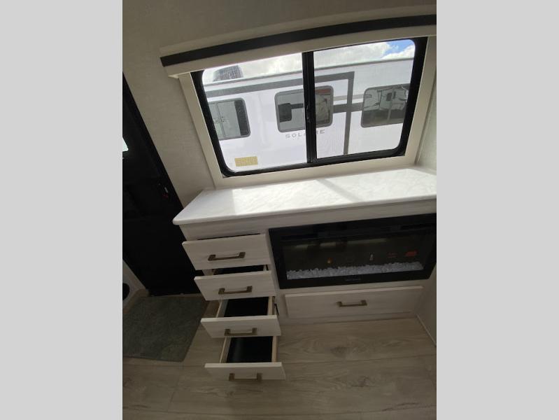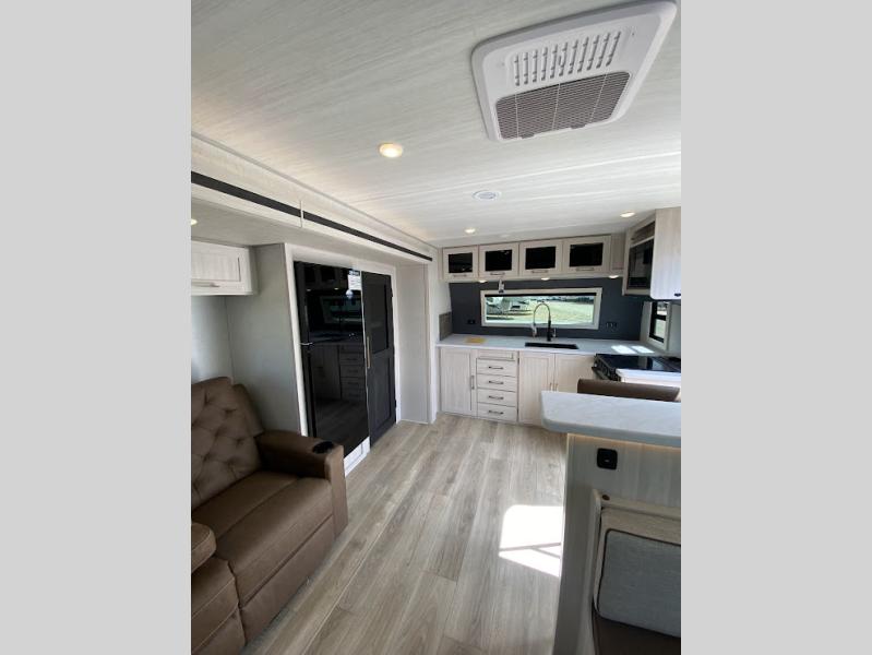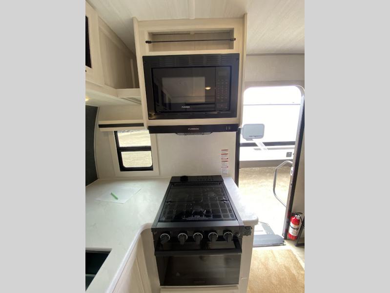 This travel trailer is a masterpiece of comfort, style, and functionality. Take the party outside with the outdoor kitchen, perfect for family dining, socializing, and making unforgettable memories! Retreat to the serene bedroom, featuring a king bed, spacious wardrobe, and overhead storage for effortless organization, plus, cozy up by the warm fireplace on chilly nights. Moreover, the incredible kitchen is a culinary dream, equipped with a pantry, 10 cu. refrigerator, overhead cabinets, and a countertop with stylish bar stools. The living room is a haven of relaxation, boasting a vibrant LED TV, overhead cabinets, and theater seating. Also, share meals with loved ones at the convenient dinette. Finally, bath in the amazing full bathroom, perfect for cleaning up after a long day in the woods.