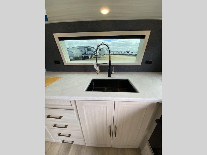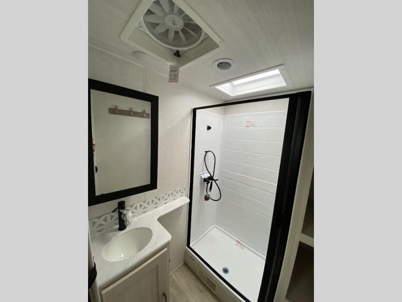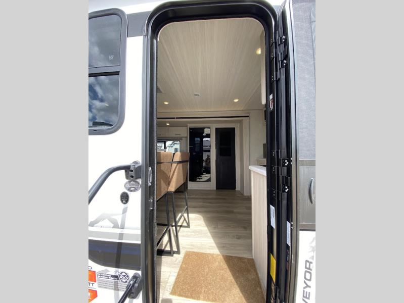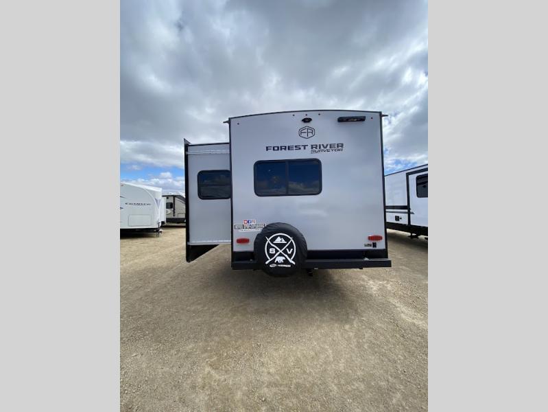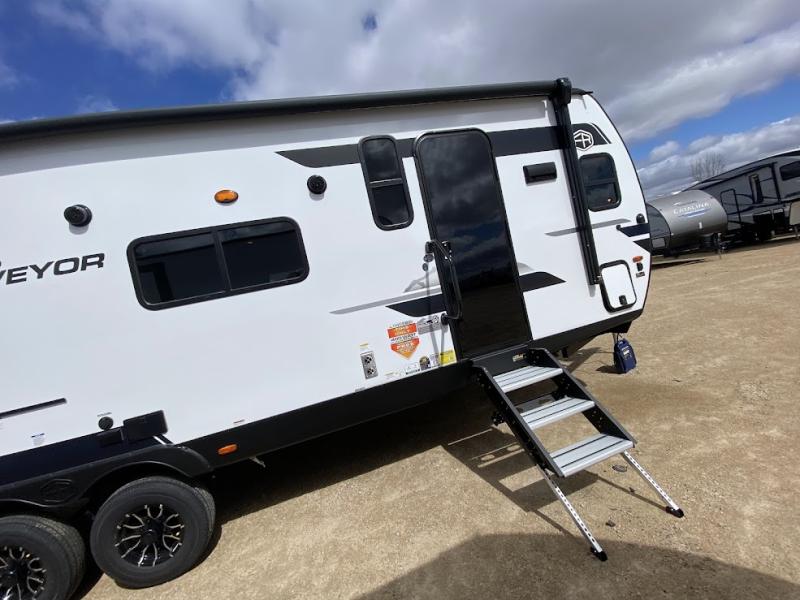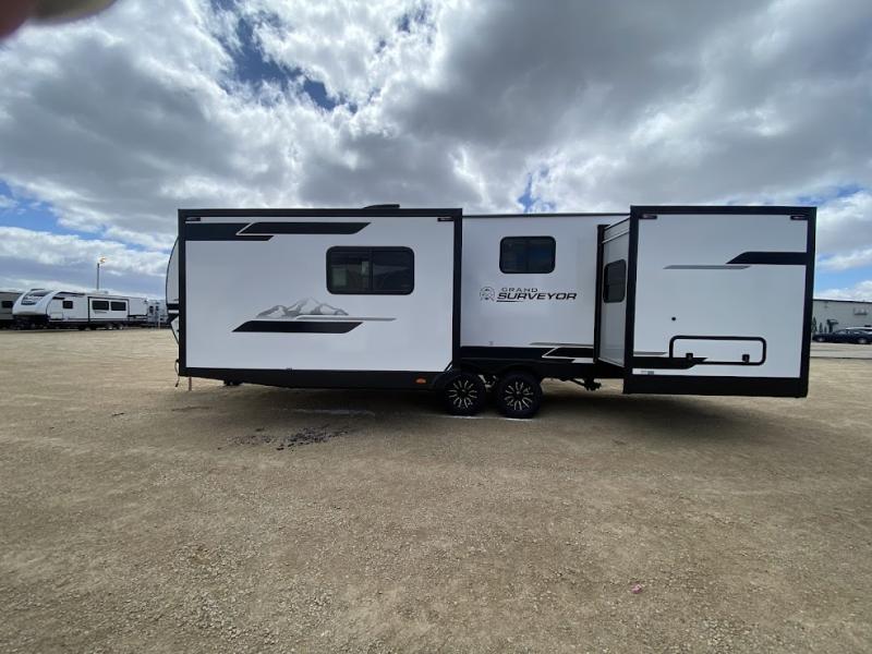 With any Grand Surveyor travel trailer by Forest River you will enjoy turn-key ready-to-go features and quality construction! Each model includes Azdel composite walls and a gel coated fiberglass front cap with an automotive style tinted windshield for a sleek look. There are friction hinge black glass entry door(s), an adjustable platform step with a night light, plus Goodyear tires and a power tongue jack for easy towing. The interior will have you feeling right at home with roller shades, residential faucets, sinks, and bathroom vanity, plus Surf(x) seamless countertops throughout. You can also plan for adventure with a 2" rear accessory and exterior spray port, and there are slam latch exterior baggage doors throughout to keep all your gear secure. Other stand-out features include a central vacuum system, a 200 watt solar panel with a 30 amp controller, a tankless water heater, carpet-free interiors, and the list goes on!
