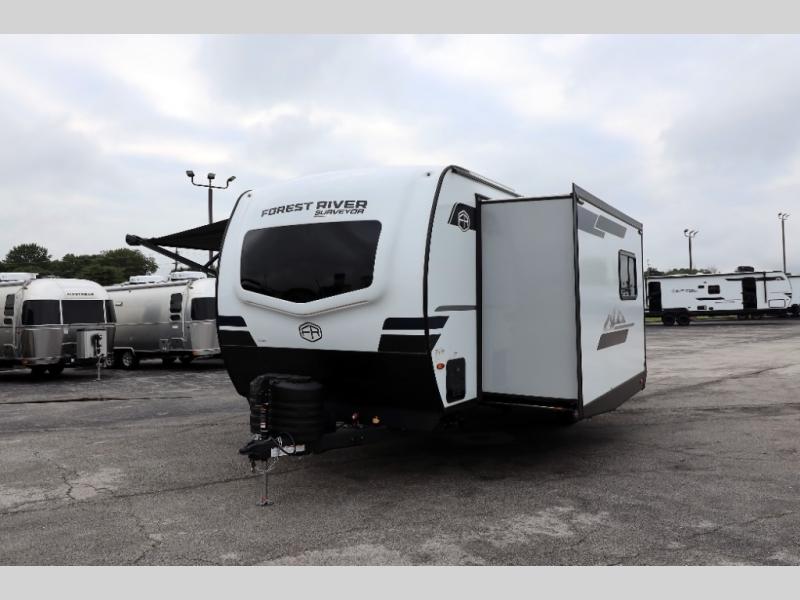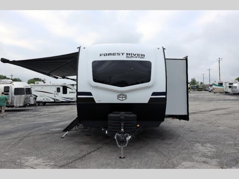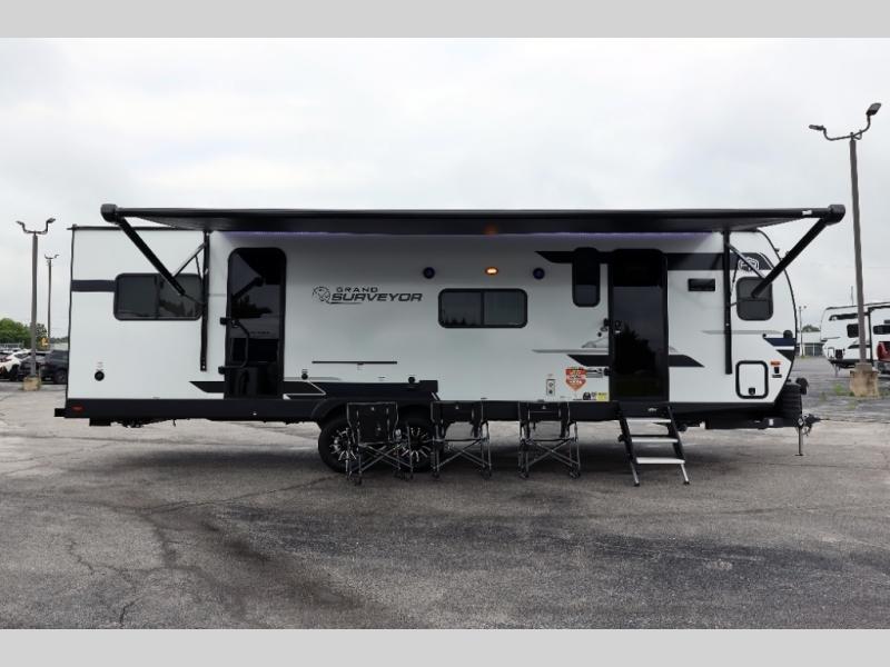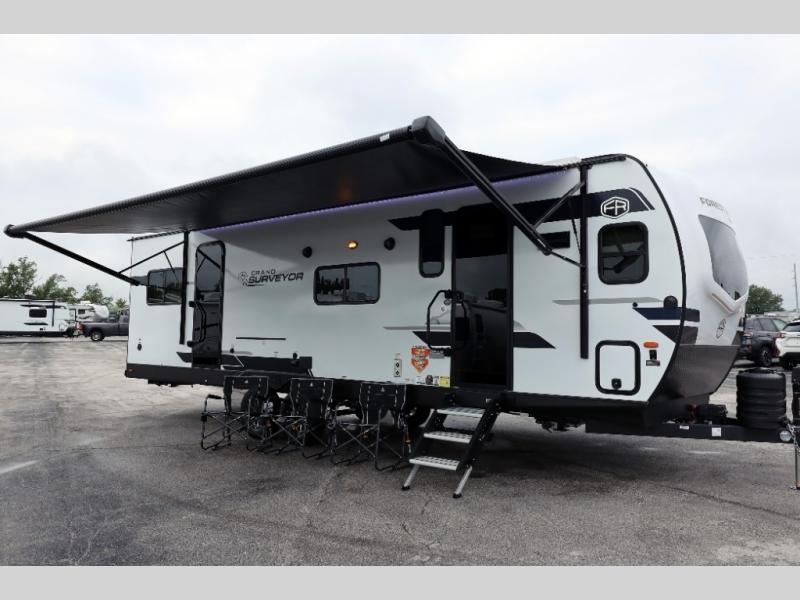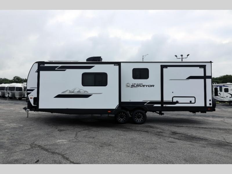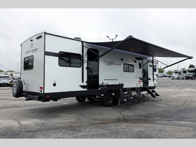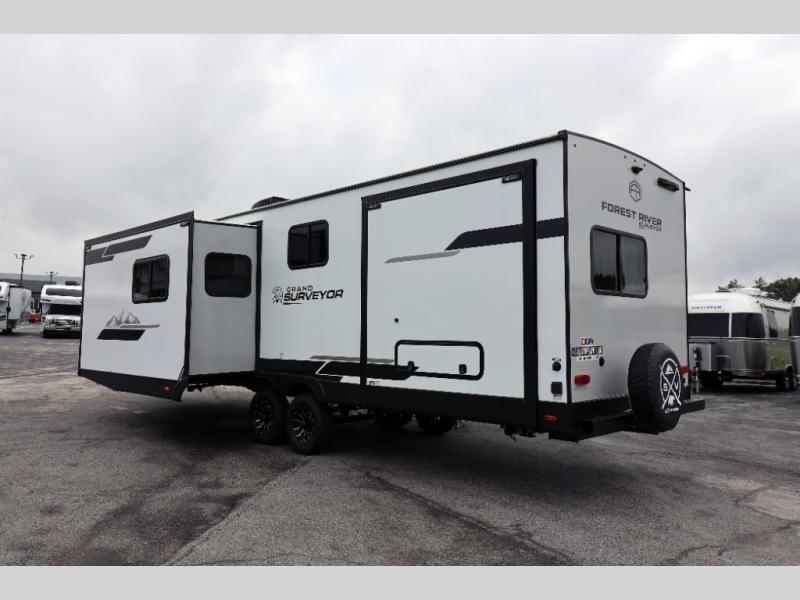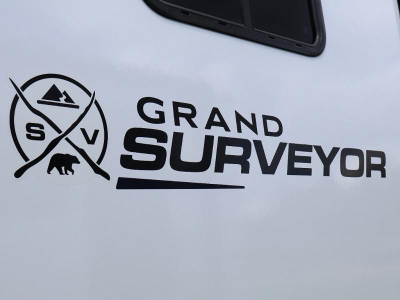 With any Grand Surveyor travel trailer by Forest River you will enjoy turn-key ready-to-go features and quality construction! Each model includes Azdel composite walls and a gel coated fiberglass front cap with an automotive style tinted windshield for a sleek look. There are friction hinge black glass entry door(s), an adjustable platform step with a night light, plus Goodyear tires and a power tongue jack for easy towing. The interior will have you feeling right at home with roller shades, residential faucets, sinks, and bathroom vanity, plus Surf(x) seamless countertops throughout. You can also plan for adventure with a 2" rear accessory and exterior spray port, and there are slam latch exterior baggage doors throughout to keep all your gear secure. Other stand-out features include a central vacuum system, a 200 watt solar panel with a 30 amp controller, a tankless water heater, carpet-free interiors, and the list goes on!