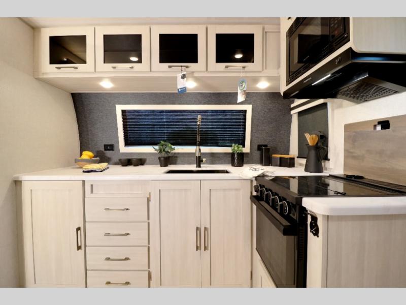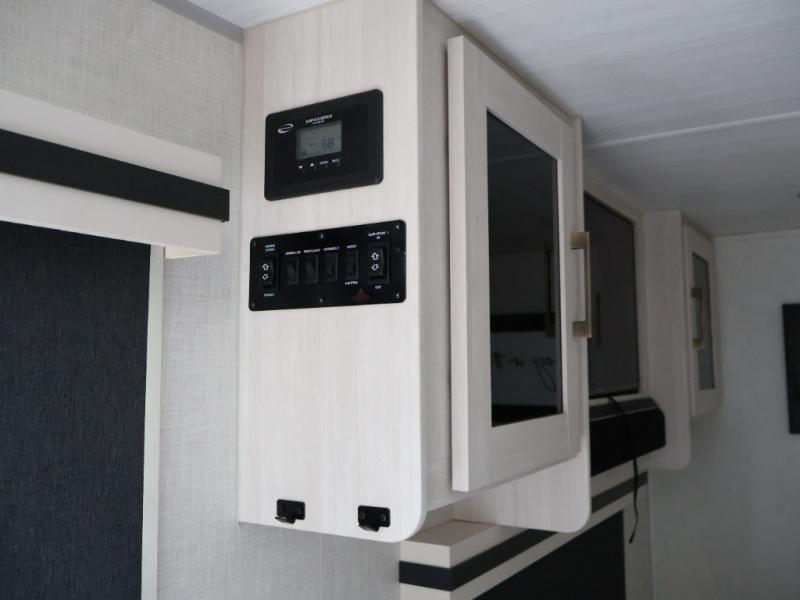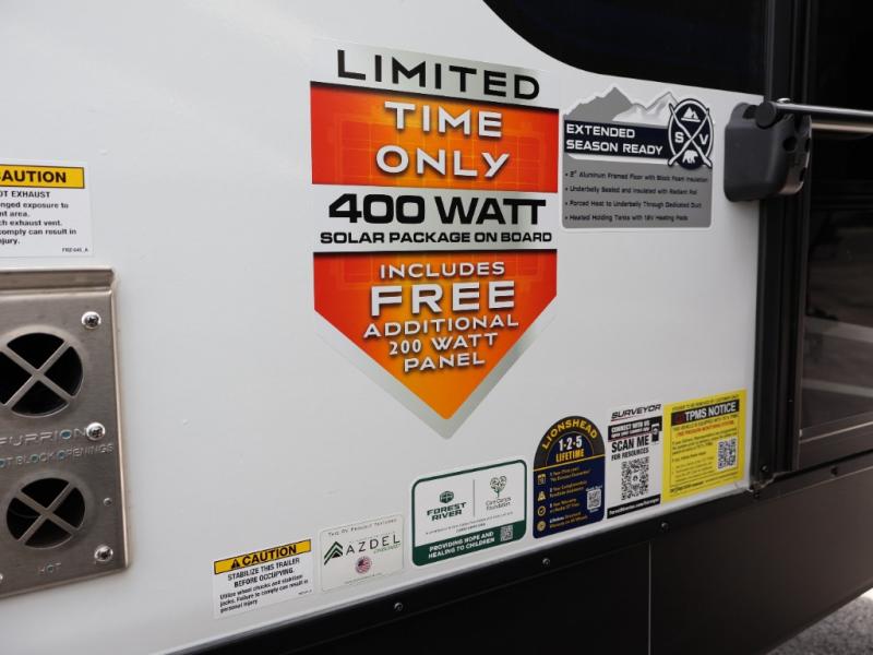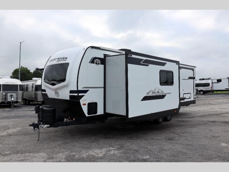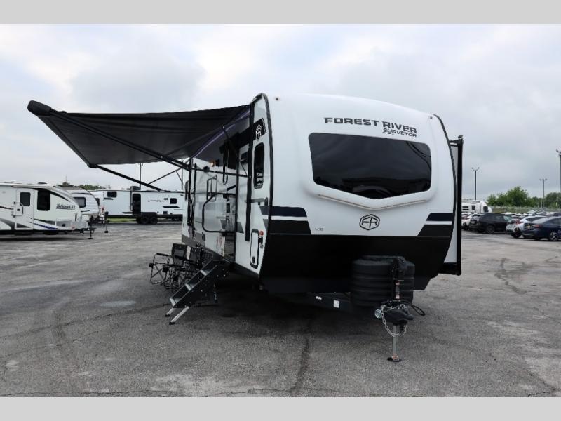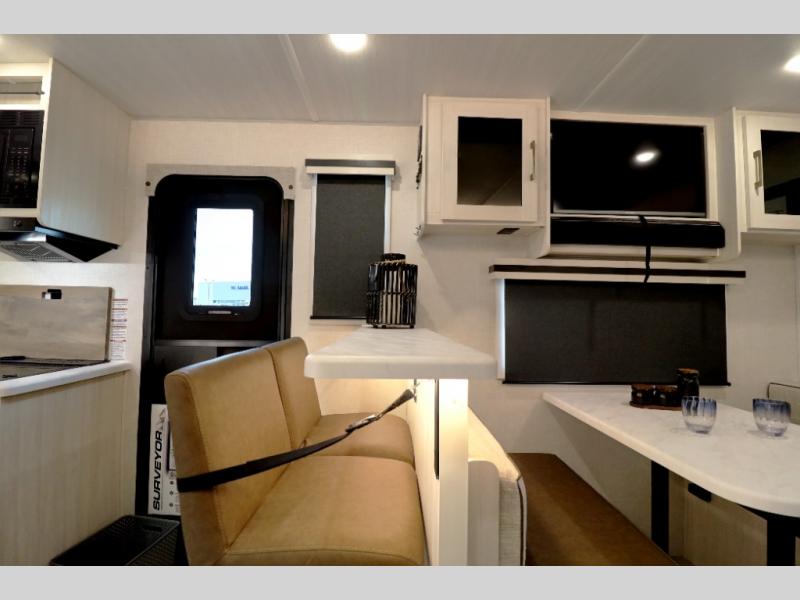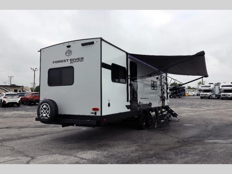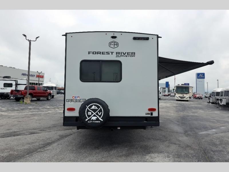 With any Grand Surveyor travel trailer by Forest River you will enjoy turn-key ready-to-go features and quality construction! Each model includes Azdel composite walls and a gel coated fiberglass front cap with an automotive style tinted windshield for a sleek look. There are friction hinge black glass entry door(s), an adjustable platform step with a night light, plus Goodyear tires and a power tongue jack for easy towing. The interior will have you feeling right at home with roller shades, residential faucets, sinks, and bathroom vanity, plus Surf(x) seamless countertops throughout. You can also plan for adventure with a 2" rear accessory and exterior spray port, and there are slam latch exterior baggage doors throughout to keep all your gear secure. Other stand-out features include a central vacuum system, a 200 watt solar panel with a 30 amp controller, a tankless water heater, carpet-free interiors, and the list goes on!