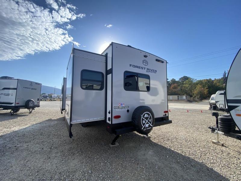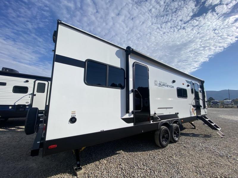 With any Grand Surveyor travel trailer by Forest River you will enjoy turn-key ready-to-go features and quality construction! Each model includes Azdel composite walls and a gel coated fiberglass front cap with an automotive style tinted windshield for a sleek look. There are friction hinge black glass entry door(s), an adjustable platform step with a night light, plus Goodyear tires and a power tongue jack for easy towing. The interior will have you feeling right at home with roller shades, residential faucets, sinks, and bathroom vanity, plus Surf(x) seamless countertops throughout. You can also plan for adventure with a 2" rear accessory and exterior spray port, and there are slam latch exterior baggage doors throughout to keep all your gear secure. Other stand-out features include a central vacuum system, Two (2) 200 watt solar panels with a 30 amp controller, a tankless water heater, carpet-free interiors, and the list goes on!