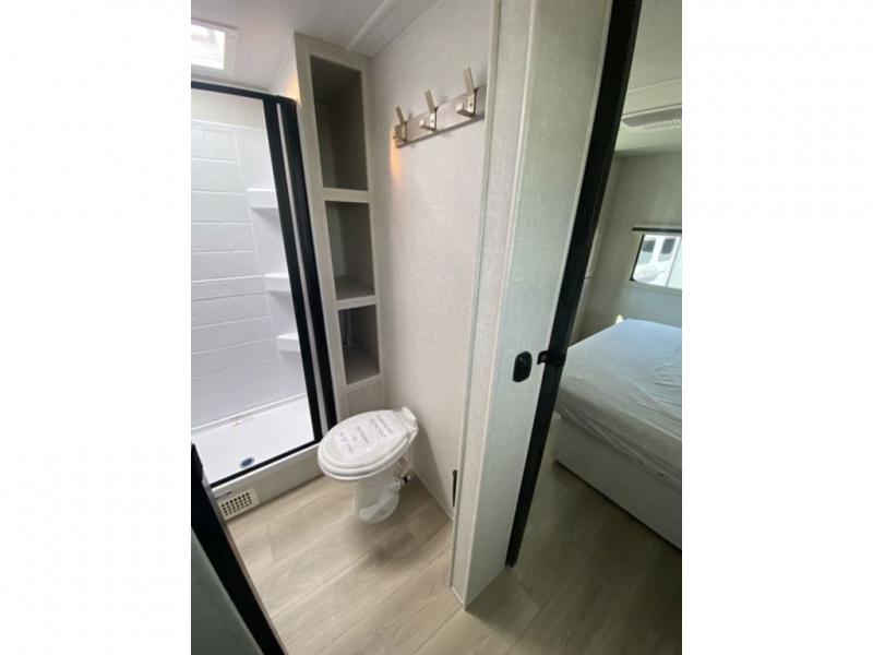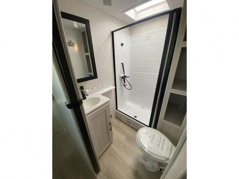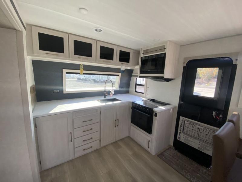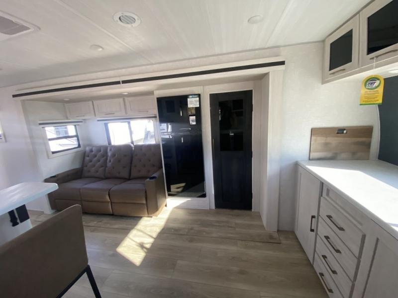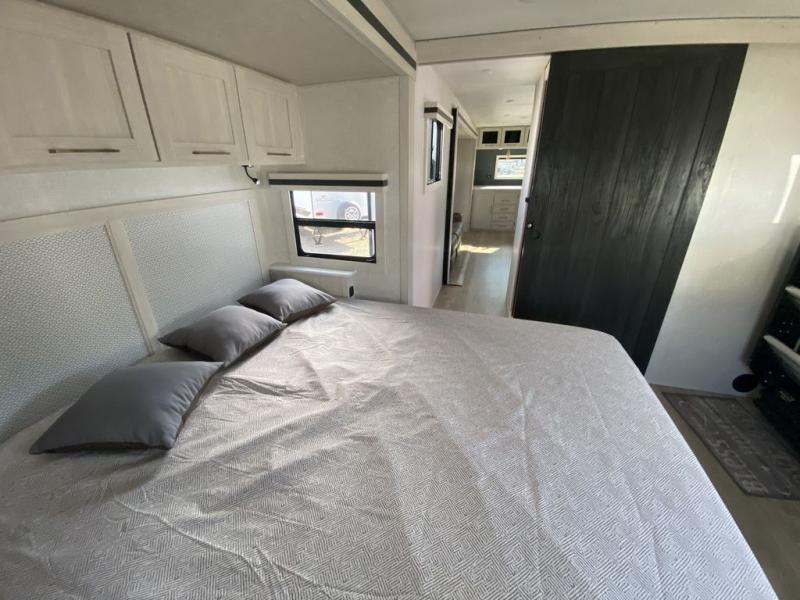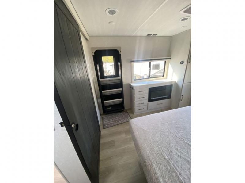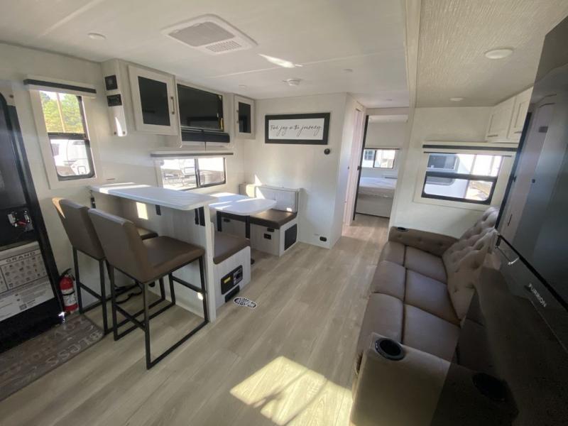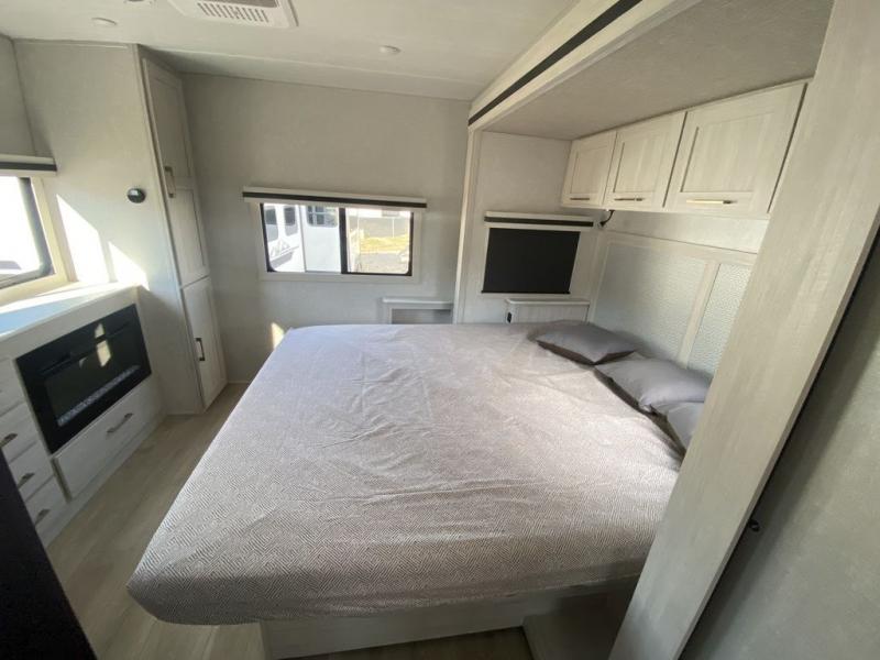 This travel trailer is a masterpiece of comfort, style, and functionality. Take the party outside with the outdoor kitchen, perfect for family dining, socializing, and making unforgettable memories! Retreat to the serene bedroom, featuring a king bed, spacious wardrobe, and overhead storage for effortless organization, plus, cozy up by the warm fireplace on chilly nights. Moreover, the incredible kitchen is a culinary dream, equipped with a pantry, 10 cu. refrigerator, overhead cabinets, and a countertop with stylish bar stools. The living room is a haven of relaxation, boasting a vibrant LED TV, overhead cabinets, and theater seating. Also, share meals with loved ones at the convenient dinette. Finally, bath in the amazing full bathroom, perfect for cleaning up after a long day in the woods.