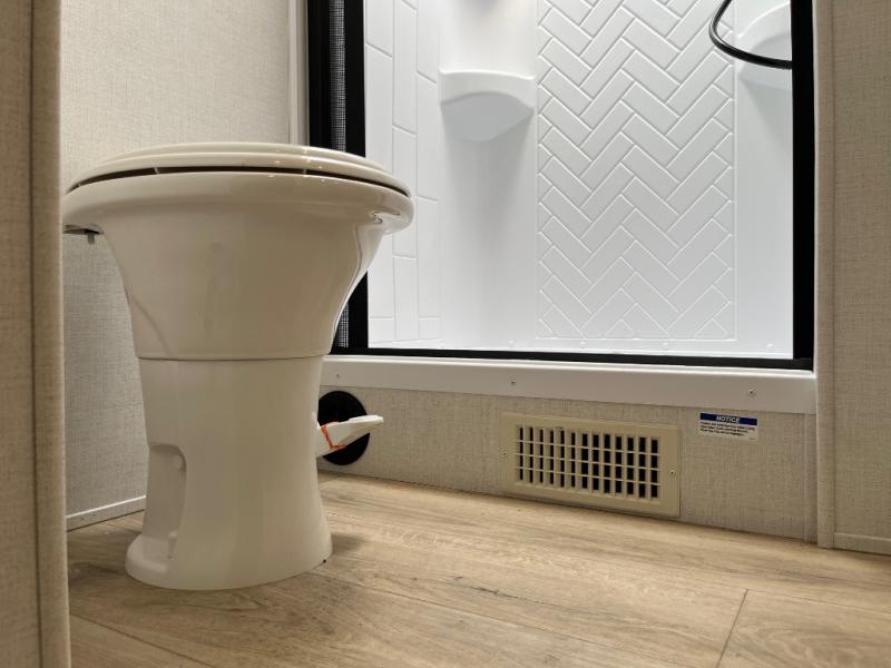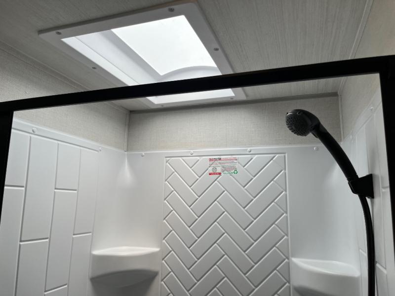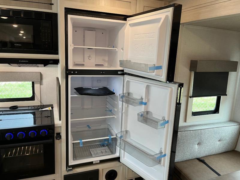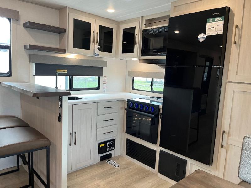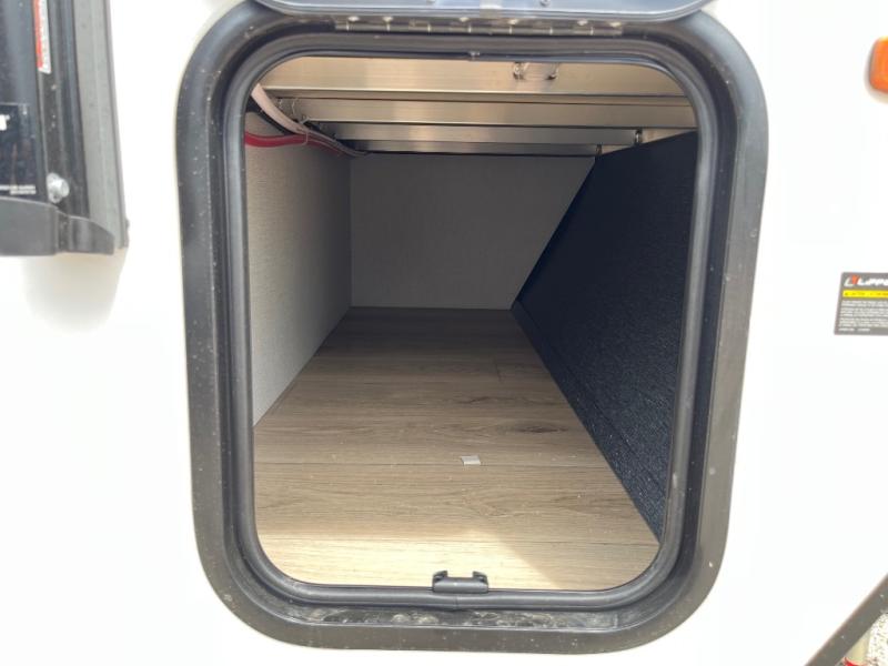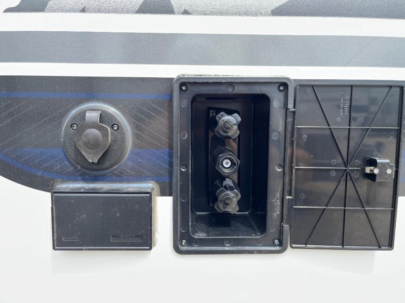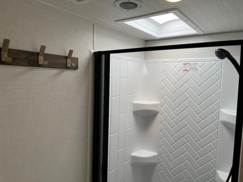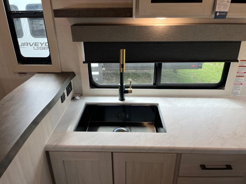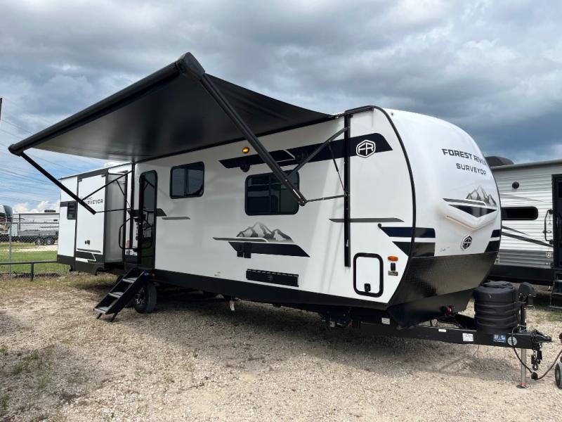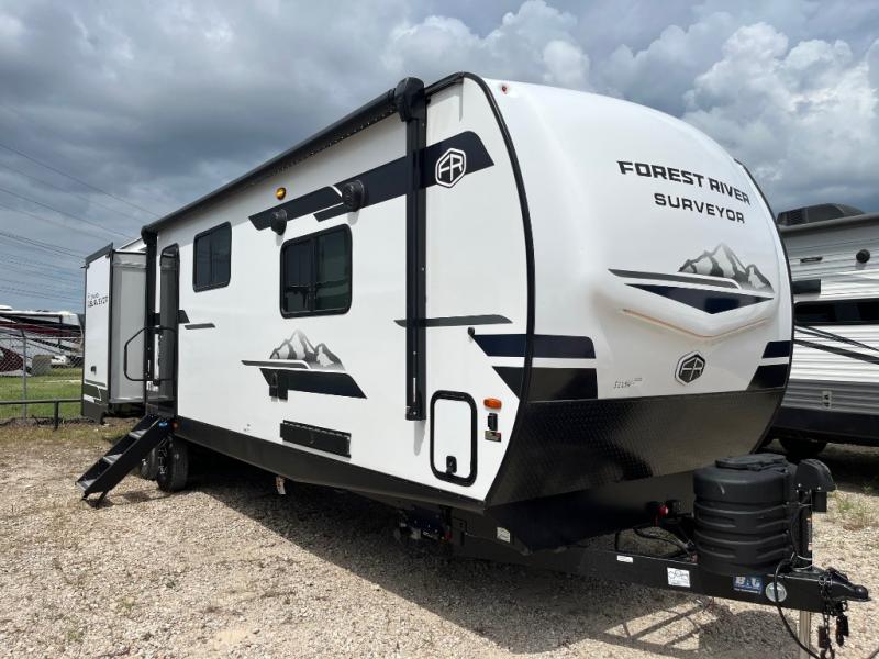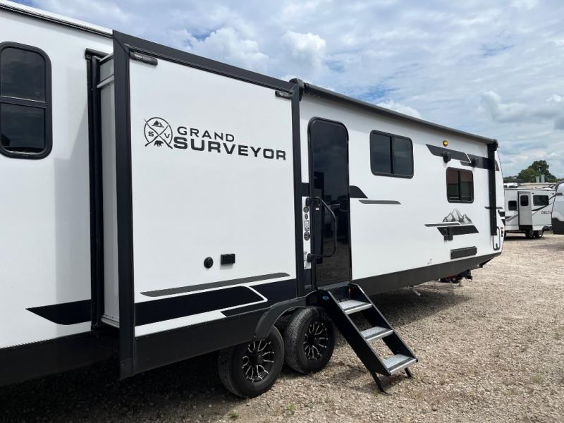 With any Grand Surveyor travel trailer by Forest River you will enjoy turn-key ready-to-go features and quality construction! Each model includes Azdel composite walls and a gel coated fiberglass front cap with an automotive style tinted windshield for a sleek look. There are friction hinge black glass entry door(s), an adjustable platform step with a night light, plus Goodyear tires and a power tongue jack for easy towing. The interior will have you feeling right at home with roller shades, residential faucets, sinks, and bathroom vanity, plus Surf(x) seamless countertops throughout. You can also plan for adventure with a 2" rear accessory and exterior spray port, and there are slam latch baggage doors throughout to keep all your gear secure. Other stand-out features include a central vacuum system, a 200 watt solar panel with a 30 amp controller, a tankless water heater, carpet-free interiors, and the list goes on!