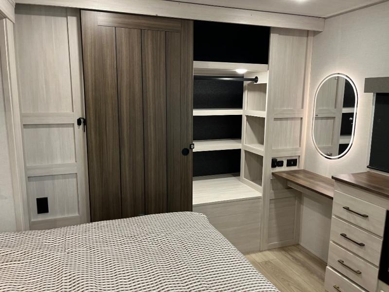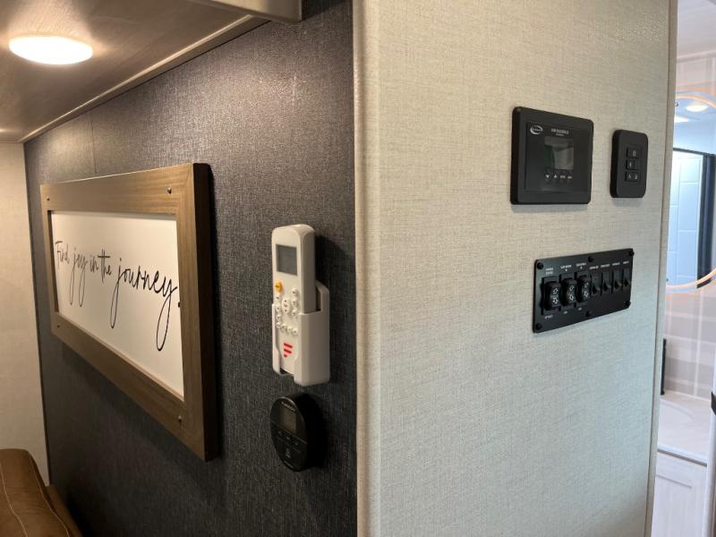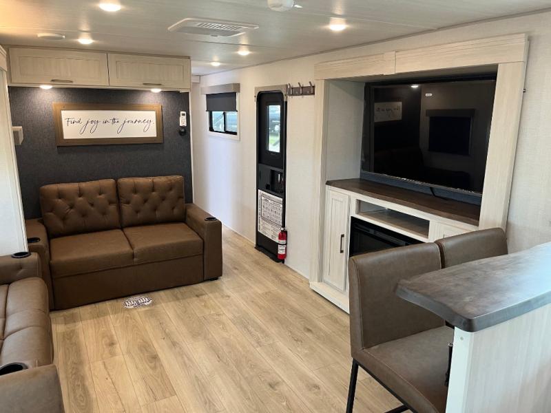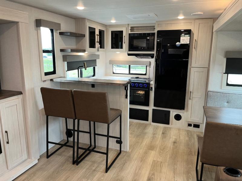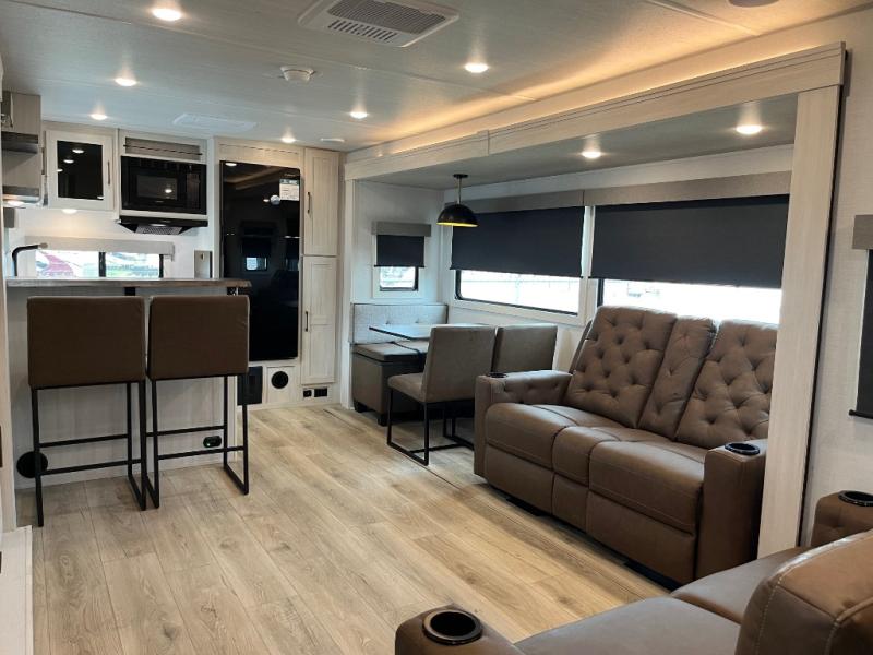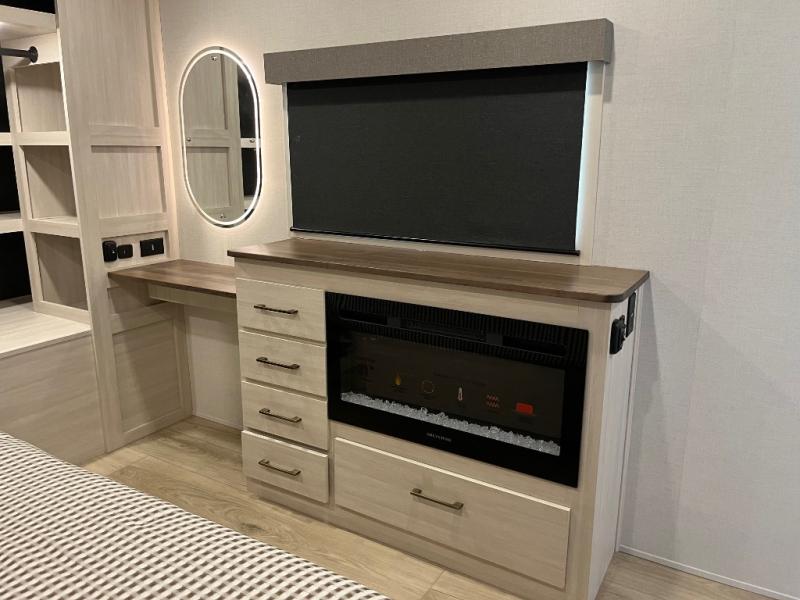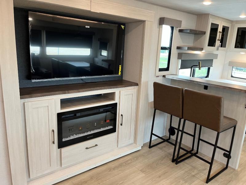 You will love this rear kitchen layout featuring lots of storage and a breakfast bar area with two chairs creating a u-shape. There is plenty of overhead storage, plus a pantry for your dry goods and snacks. A large slide along the roadside houses your dinette and 64" theater seat. Here you will also enjoy great views through two large panoramic windows. There is also more seating along the interior wall of this space where you have a 64" tri-fold sofa that can double as sleeping space for overnight guests, or you can add a second 64" theater seat instead. All can easily view the slide out entertainment center along the curbside wall including a fireplace as well. Central vac will allow you to clean up easily throughout the unit. You also can choose to cook inside or out thanks to the outside kitchen featured under the 19' awning. When it's time to call it a night, you can clean up in the spacious full bath, then head to the front master bedroom to retire. There is a custom king bed slide out here, along with a full-wall wardrobe in front, a dresser and desk, a closet with washer and dryer prep, plus a second fireplace!