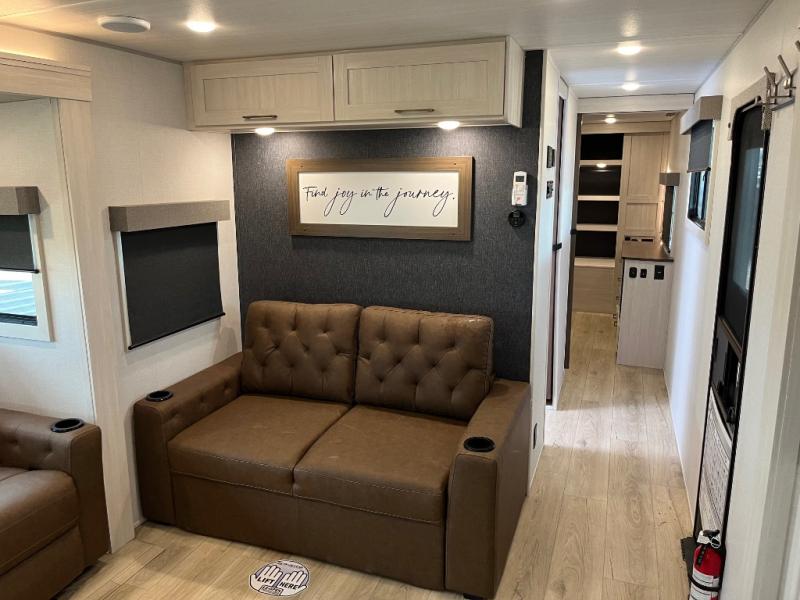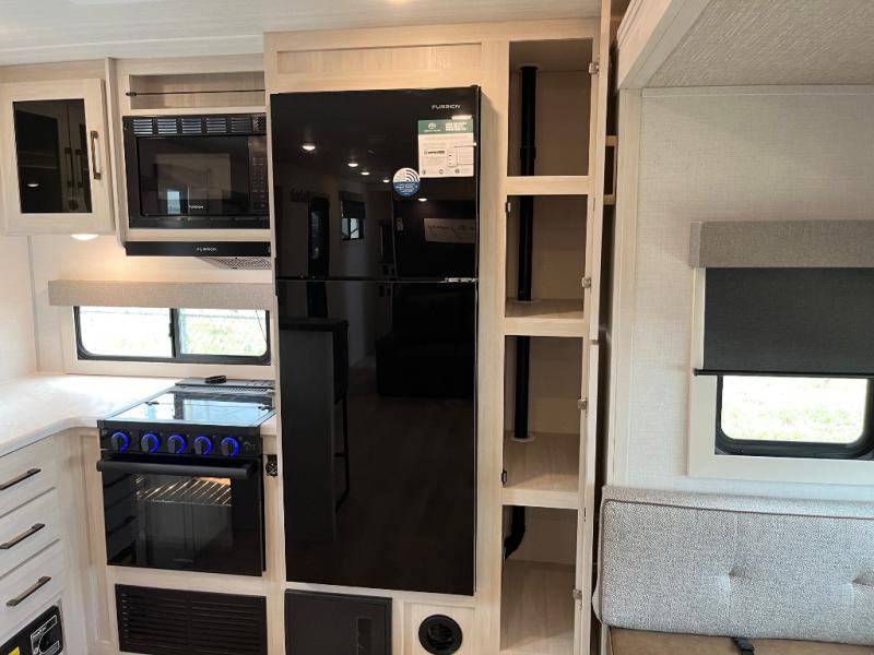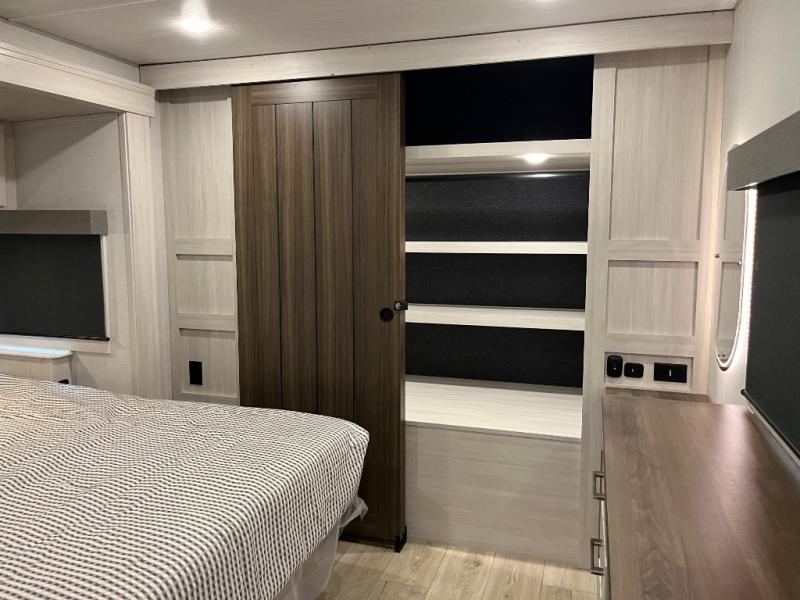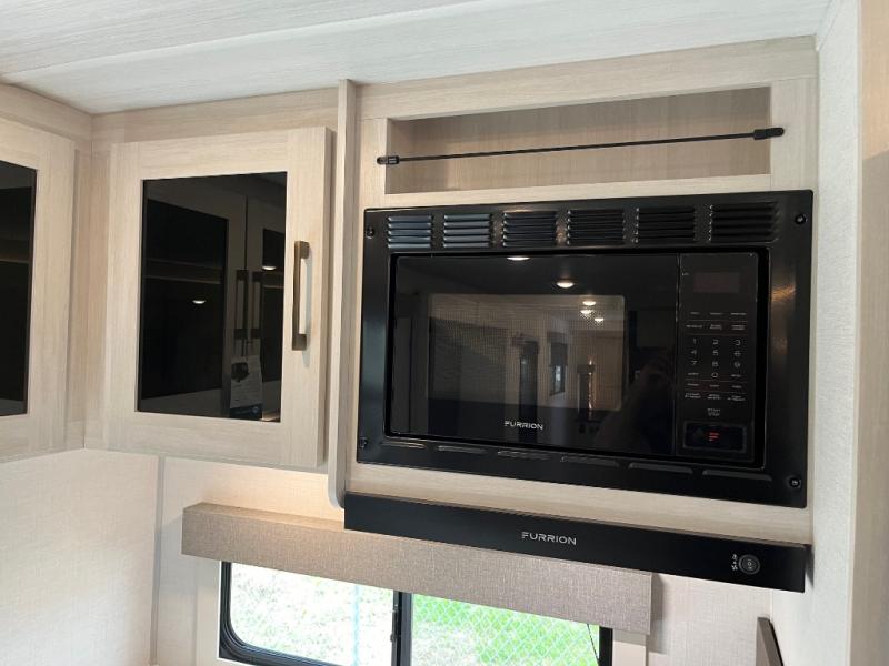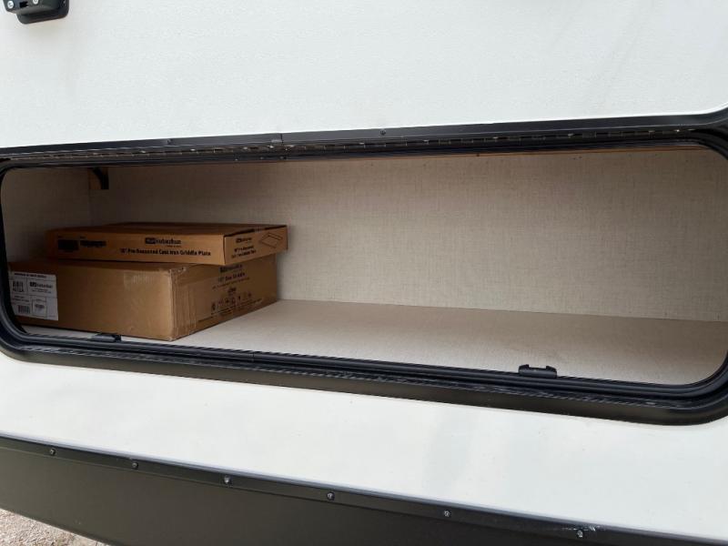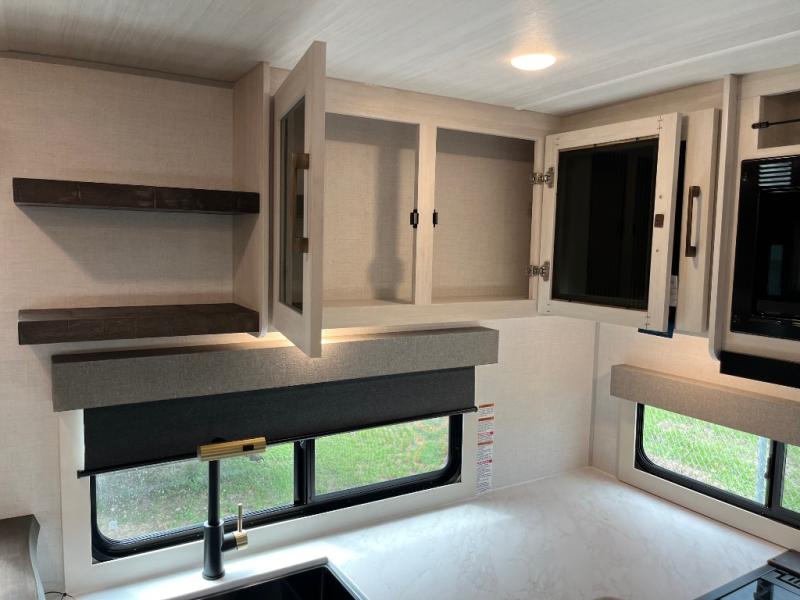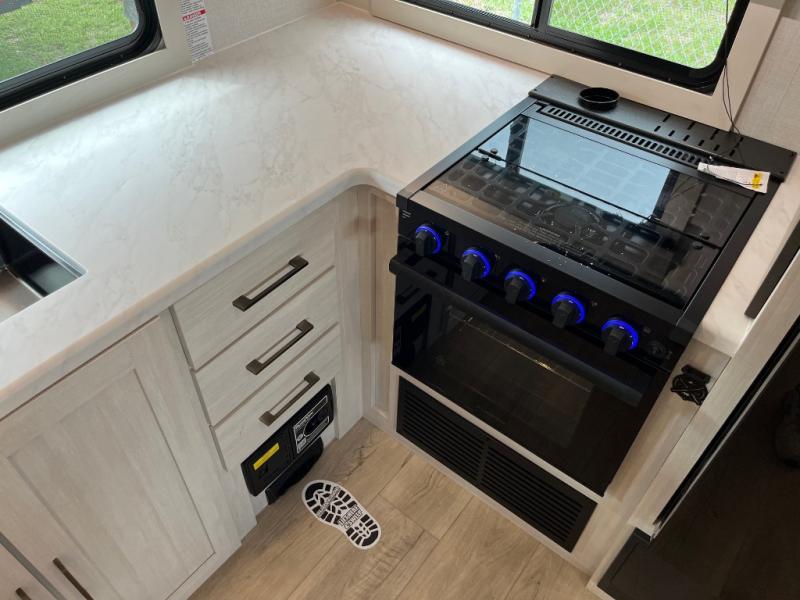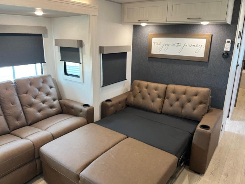 You will love this rear kitchen layout featuring lots of storage and a breakfast bar area with two chairs creating a u-shape. There is plenty of overhead storage, plus a pantry for your dry goods and snacks. A large slide along the roadside houses your dinette and 64" theater seat. Here you will also enjoy great views through two large panoramic windows. There is also more seating along the interior wall of this space where you have a 64" tri-fold sofa that can double as sleeping space for overnight guests, or you can add a second 64" theater seat instead. All can easily view the slide out entertainment center along the curbside wall including a fireplace as well. Central vac will allow you to clean up easily throughout the unit. You also can choose to cook inside or out thanks to the outside kitchen featured under the 19' awning. When it's time to call it a night, you can clean up in the spacious full bath, then head to the front master bedroom to retire. There is a custom king bed slide out here, along with a full-wall wardrobe in front, a dresser and desk, a closet with washer and dryer prep, plus a second fireplace!