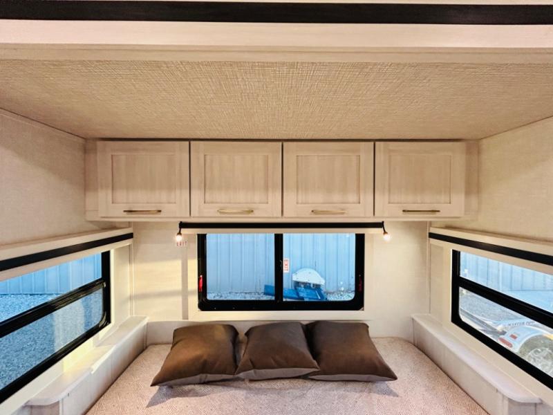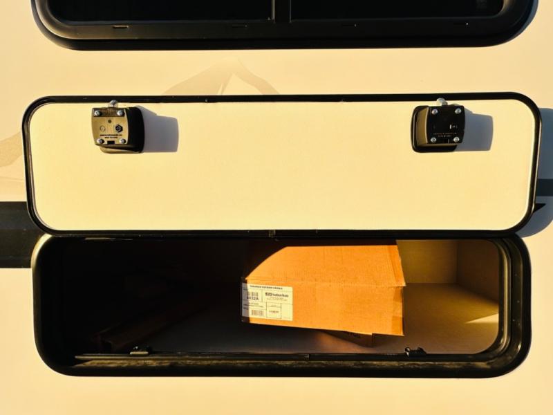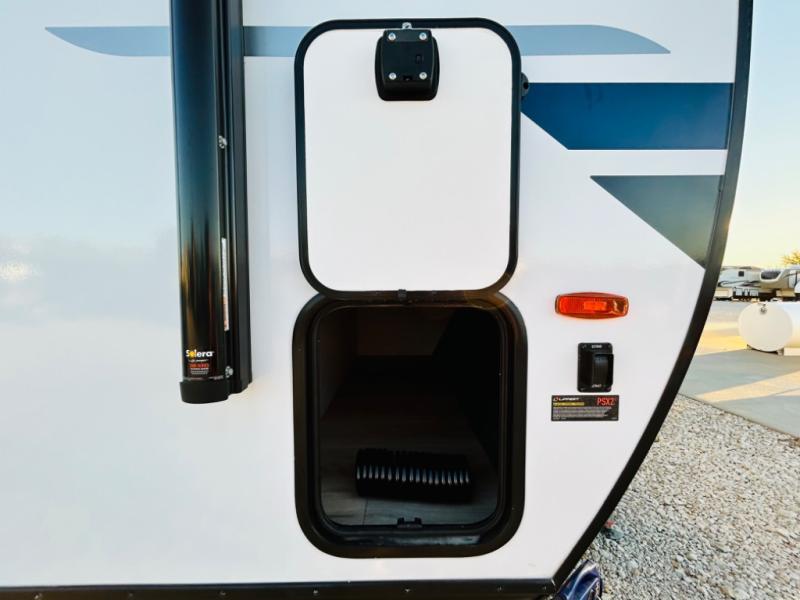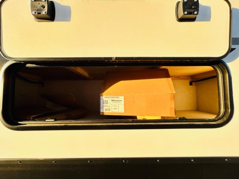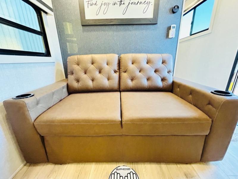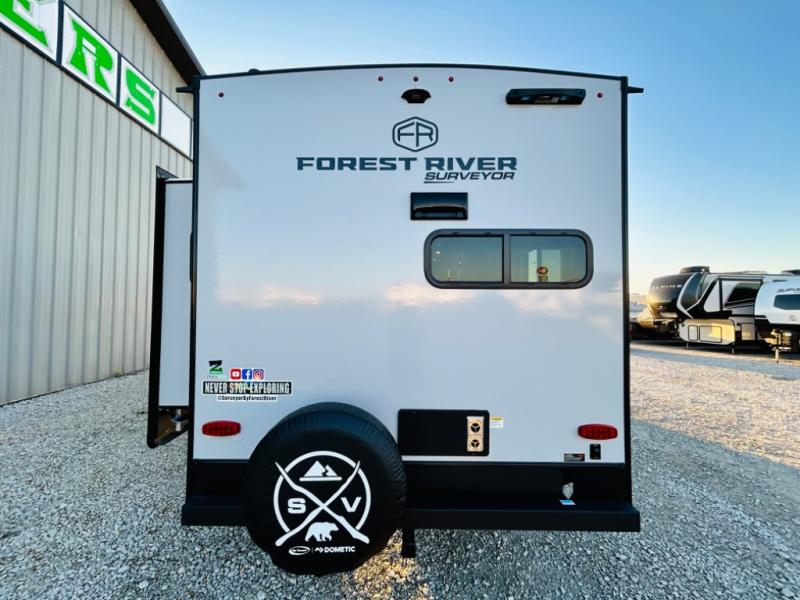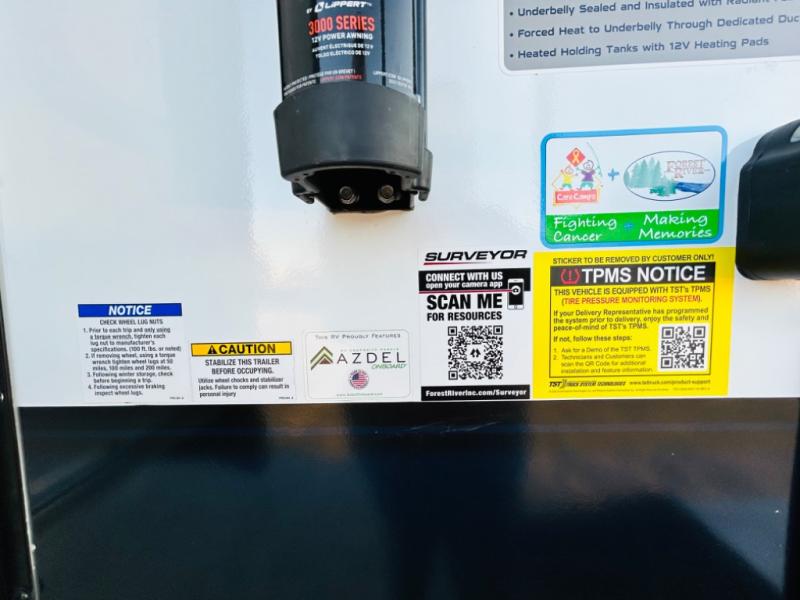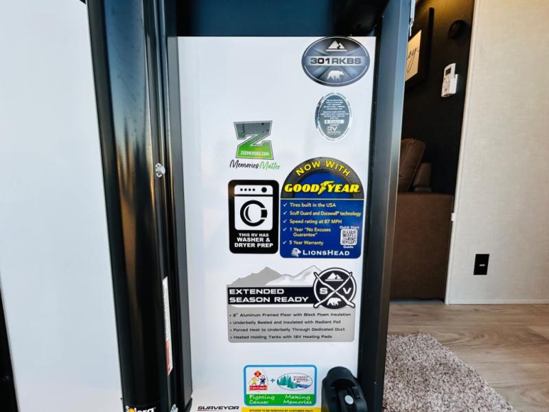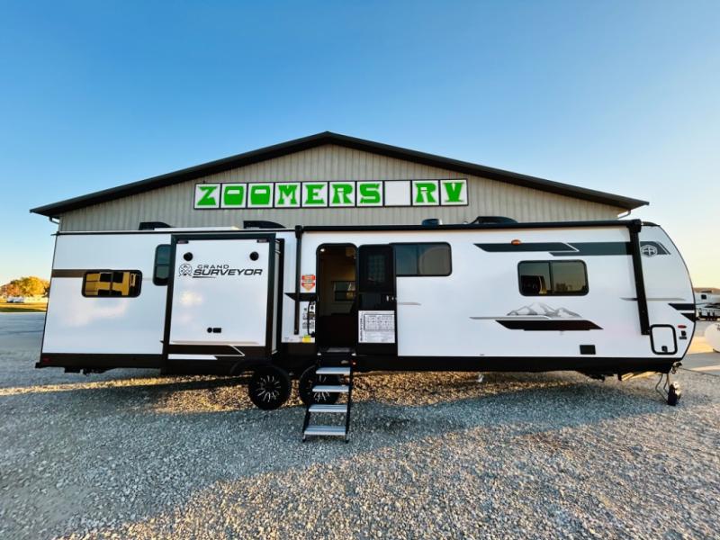 With any Grand Surveyor travel trailer by Forest River you will enjoy turn-key ready-to-go features and quality construction! Each model includes Azdel composite walls and a gel coated fiberglass front cap with an automotive style tinted windshield for a sleek look. There are friction hinge black glass entry door(s), an adjustable platform step with a night light, plus Goodyear tires and a power tongue jack for easy towing. The interior will have you feeling right at home with roller shades, residential faucets, sinks, and bathroom vanity, plus Surf(x) seamless countertops throughout. You can also plan for adventure with a 2" rear accessory and exterior spray port, and there are slam latch baggage doors throughout to keep all your gear secure. Other stand-out features include a central vacuum system, a 200 watt solar panel with a 30 amp controller, a tankless water heater, carpet-free interiors, and the list goes on!