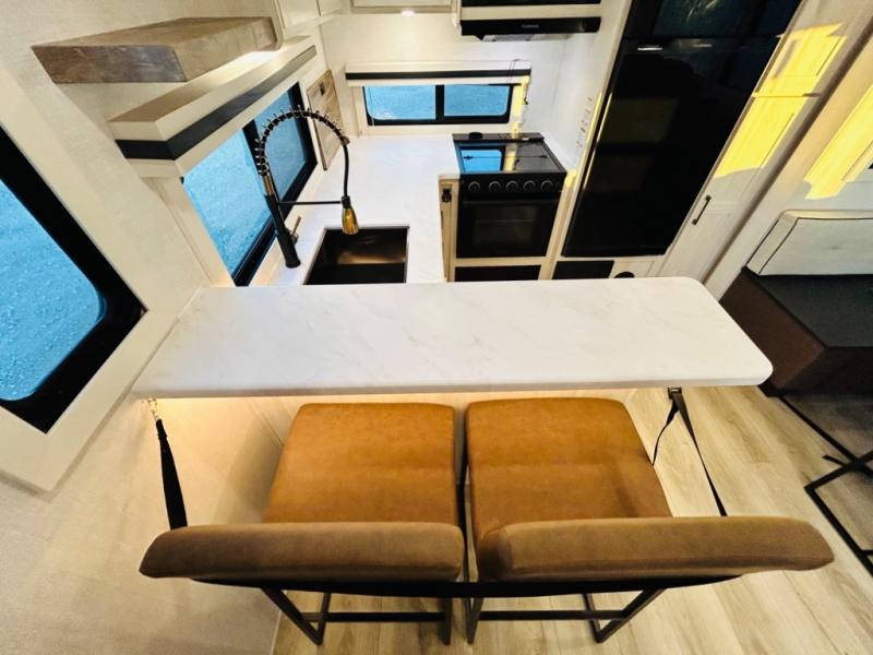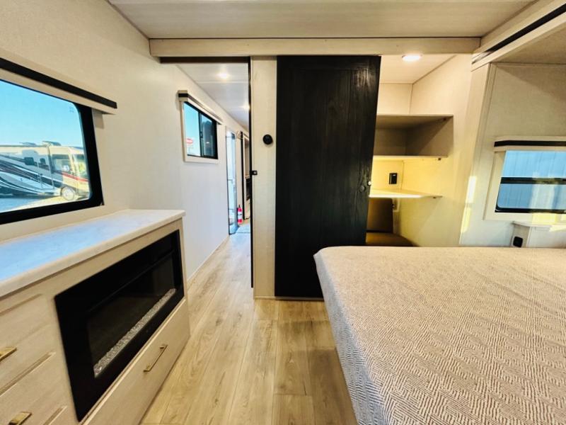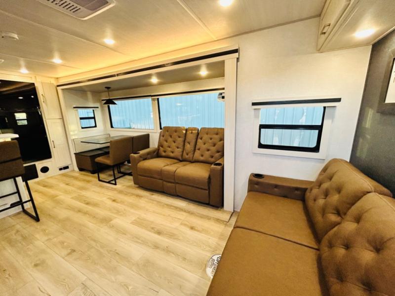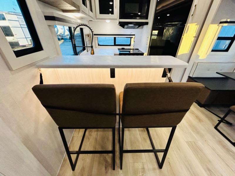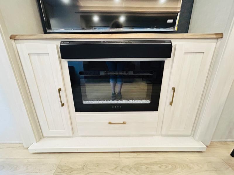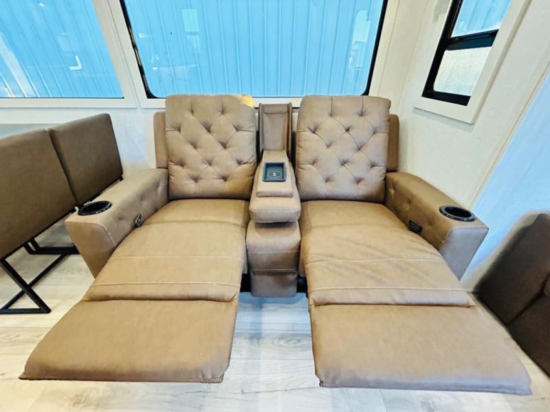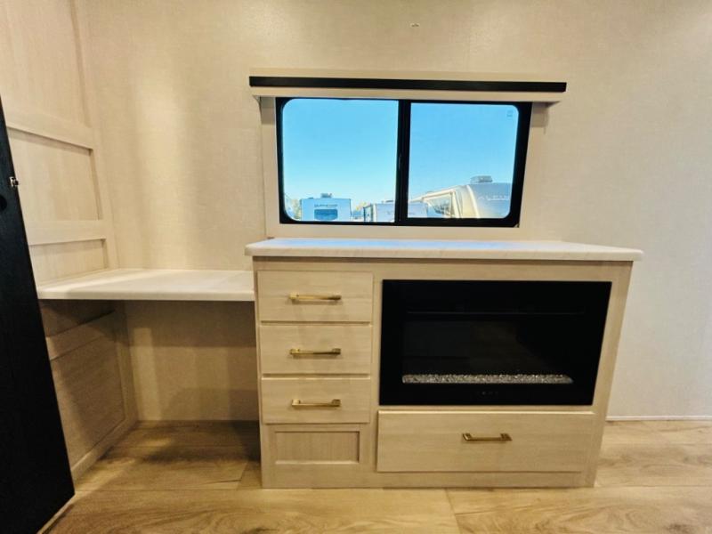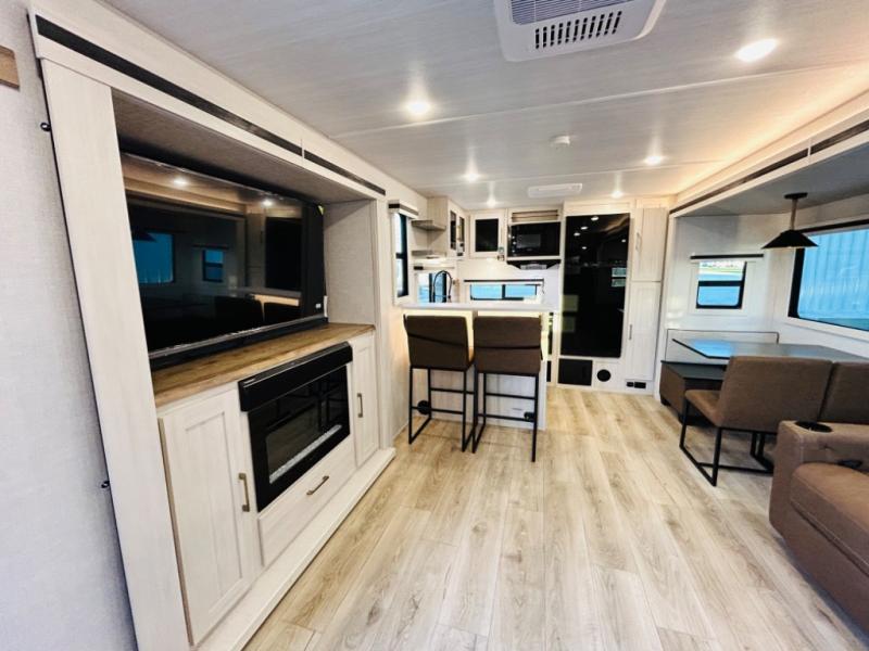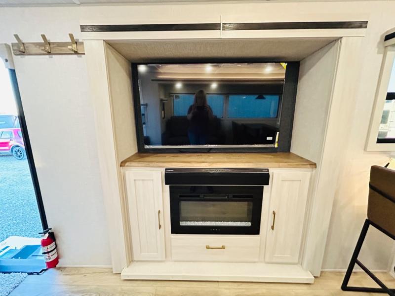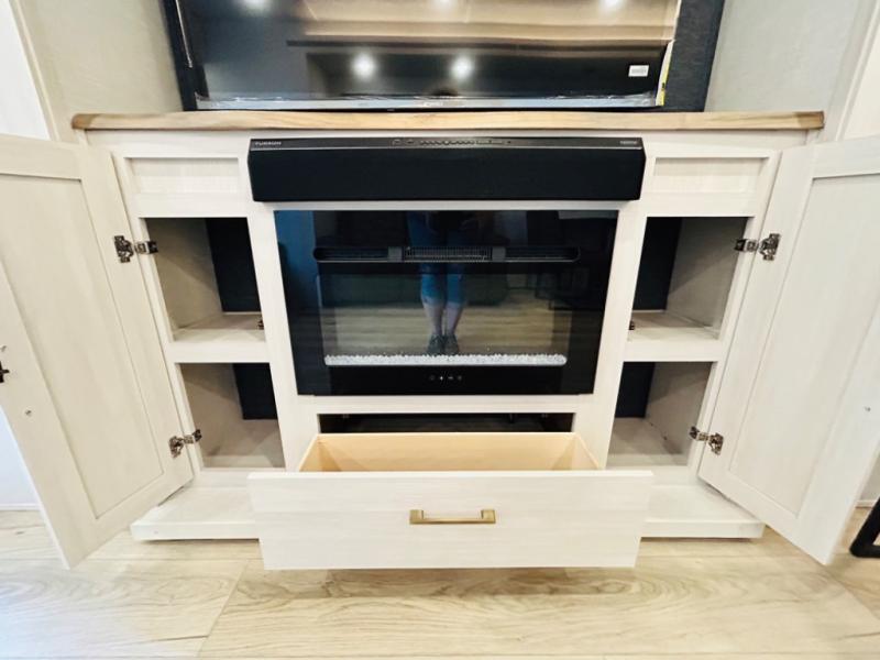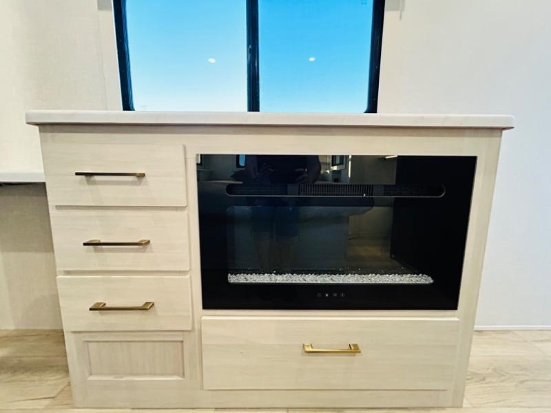 You will love this rear kitchen layout featuring lots of storage and a breakfast bar area with two chairs creating a u-shape. There is plenty of overhead storage, plus a pantry for your dry goods and snacks. A large slide along the roadside houses your dinette and 64" theater seat. Here you will also enjoy great views through two large panoramic windows. There is also more seating along the interior wall of this space where you have a 64" tri-fold sofa that can double as sleeping space for overnight guests, or you can add a second 64" theater seat instead. All can easily view the slide out entertainment center along the curbside wall including a fireplace as well. Central vac will allow you to clean up easily throughout the unit. You also can choose to cook inside or out thanks to the outside kitchen featured under the 19' awning. When it's time to call it a night, you can clean up in the spacious full bath, then head to the front master bedroom to retire. There is a custom king bed slide out here, along with a full-wall wardrobe in front, a dresser and desk, a closet with washer and dryer prep, plus a second fireplace!
