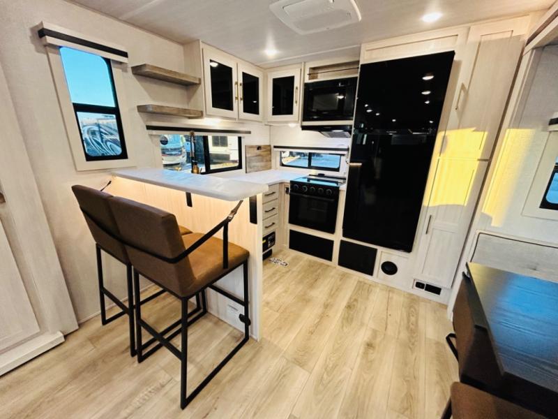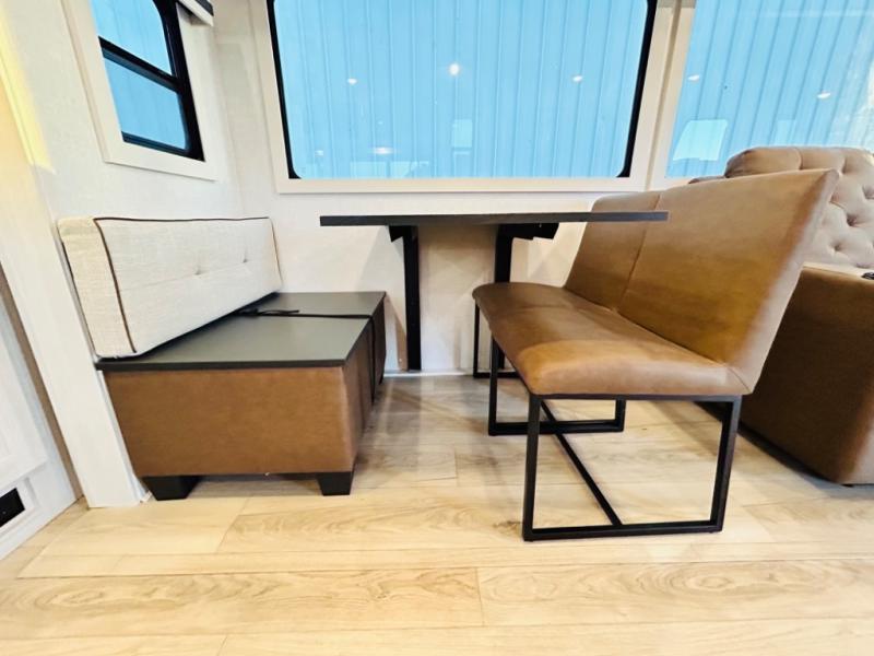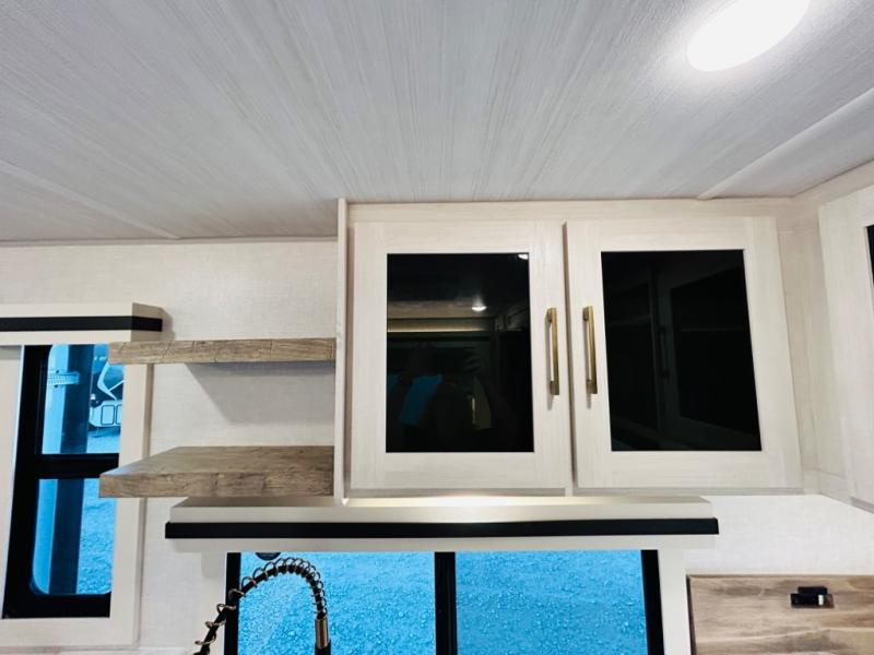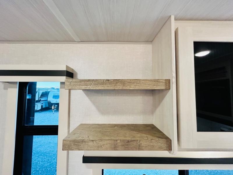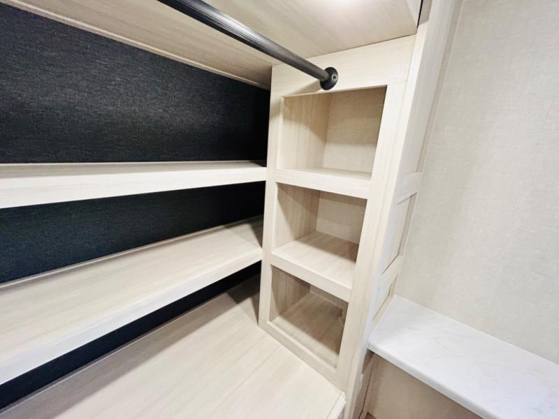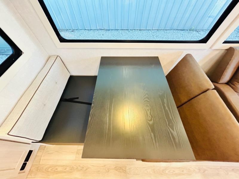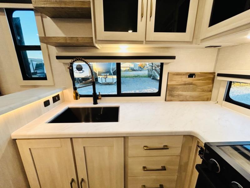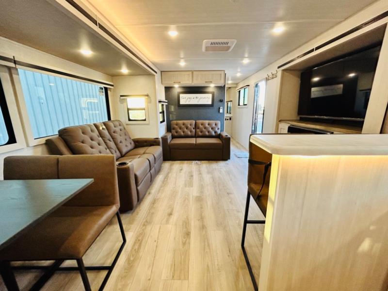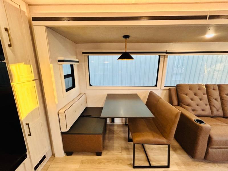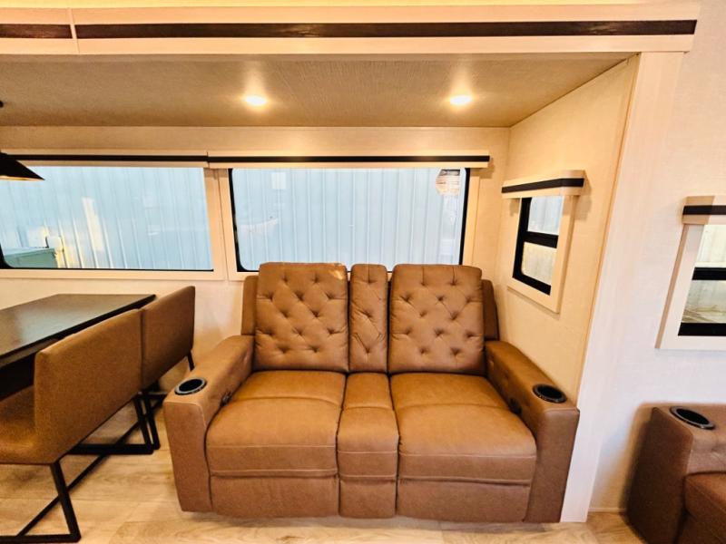 You will love this rear kitchen layout featuring lots of storage and a breakfast bar area with two chairs creating a u-shape. There is plenty of overhead storage, plus a pantry for your dry goods and snacks. A large slide along the roadside houses your dinette and 64" theater seat. Here you will also enjoy great views through two large panoramic windows. There is also more seating along the interior wall of this space where you have a 64" tri-fold sofa that can double as sleeping space for overnight guests, or you can add a second 64" theater seat instead. All can easily view the slide out entertainment center along the curbside wall including a fireplace as well. Central vac will allow you to clean up easily throughout the unit. You also can choose to cook inside or out thanks to the outside kitchen featured under the 19' awning. When it's time to call it a night, you can clean up in the spacious full bath, then head to the front master bedroom to retire. There is a custom king bed slide out here, along with a full-wall wardrobe in front, a dresser and desk, a closet with washer and dryer prep, plus a second fireplace!