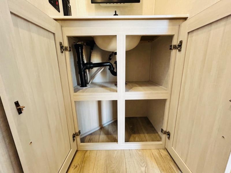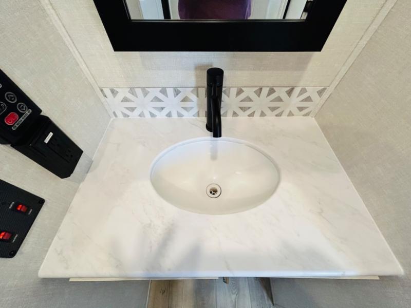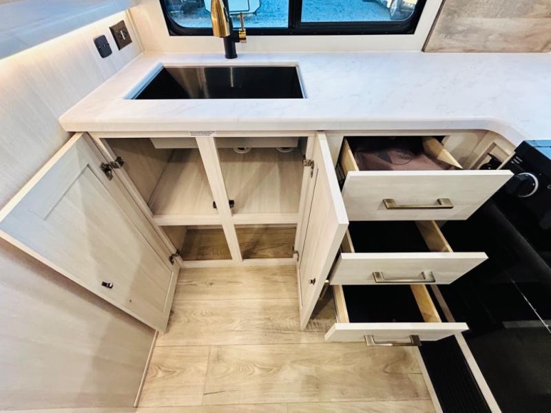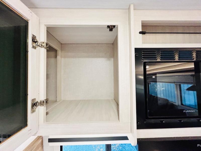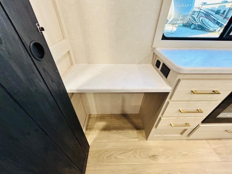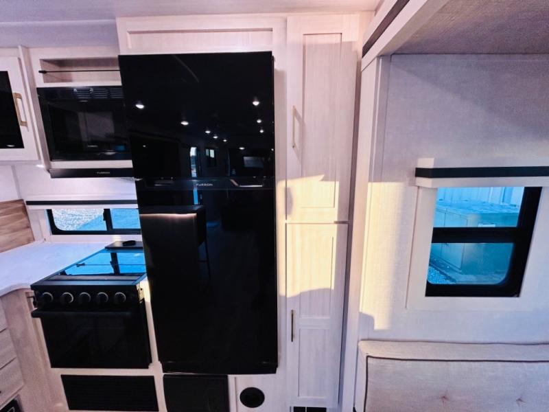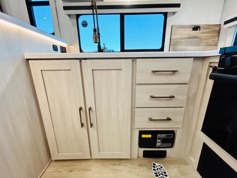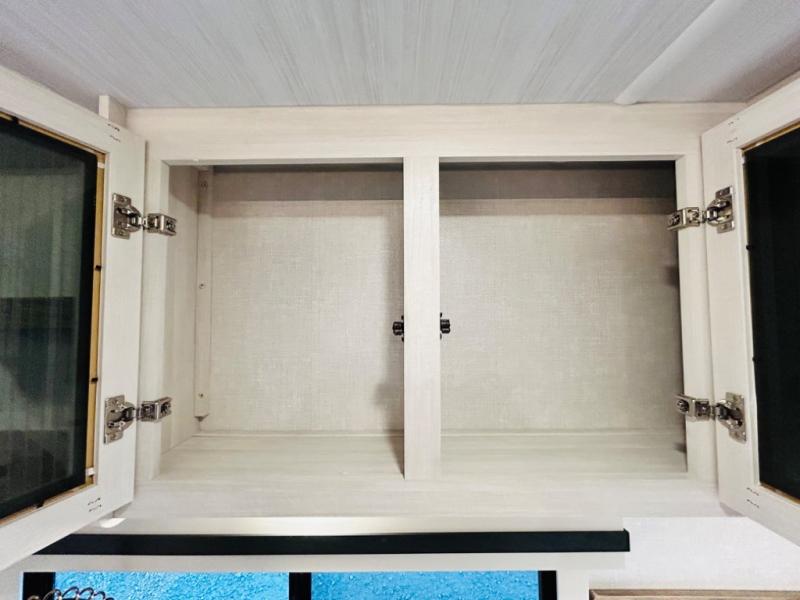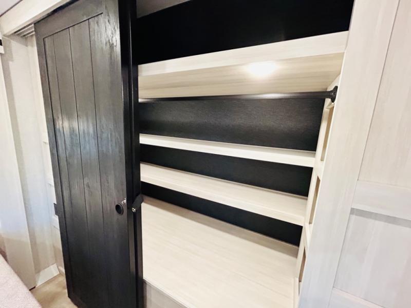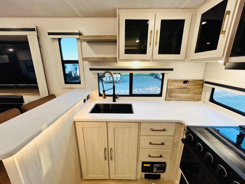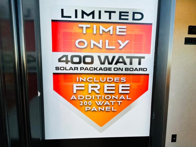 You will love this rear kitchen layout featuring lots of storage and a breakfast bar area with two chairs creating a u-shape. There is plenty of overhead storage, plus a pantry for your dry goods and snacks. A large slide along the roadside houses your dinette and 64" theater seat. Here you will also enjoy great views through two large panoramic windows. There is also more seating along the interior wall of this space where you have a 64" tri-fold sofa that can double as sleeping space for overnight guests, or you can add a second 64" theater seat instead. All can easily view the slide out entertainment center along the curbside wall including a fireplace as well. Central vac will allow you to clean up easily throughout the unit. You also can choose to cook inside or out thanks to the outside kitchen featured under the 19' awning. When it's time to call it a night, you can clean up in the spacious full bath, then head to the front master bedroom to retire. There is a custom king bed slide out here, along with a full-wall wardrobe in front, a dresser and desk, a closet with washer and dryer prep, plus a second fireplace!