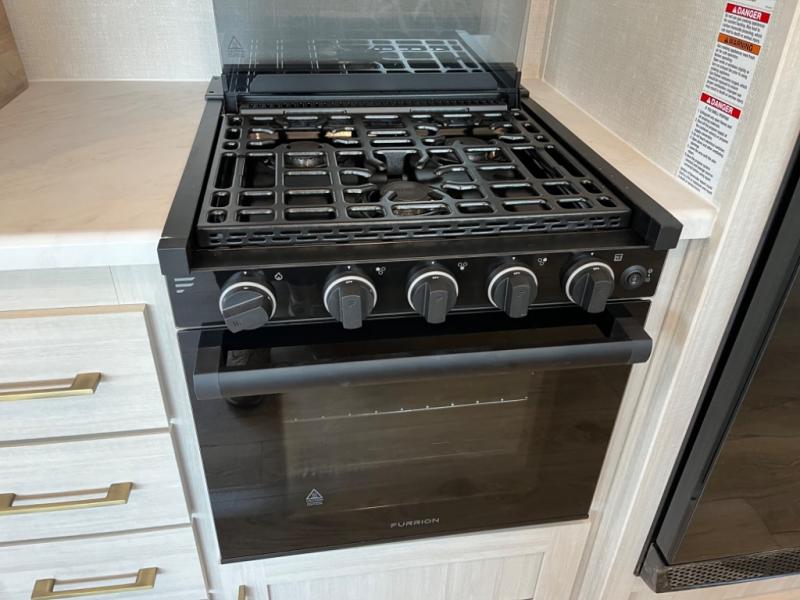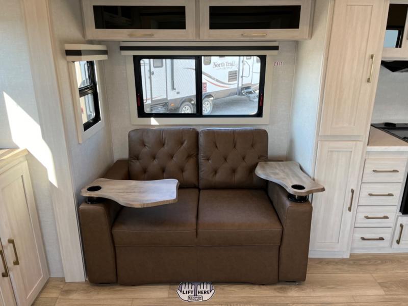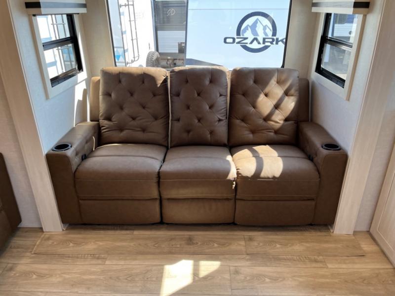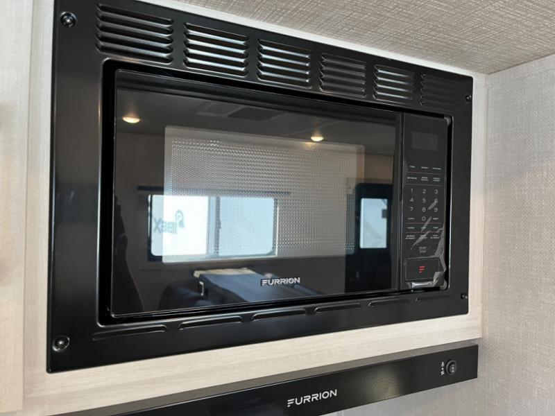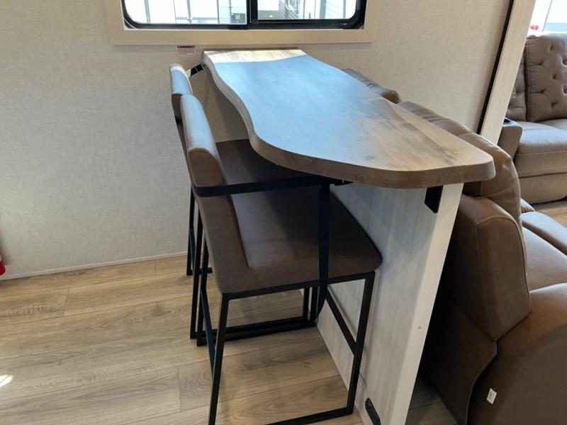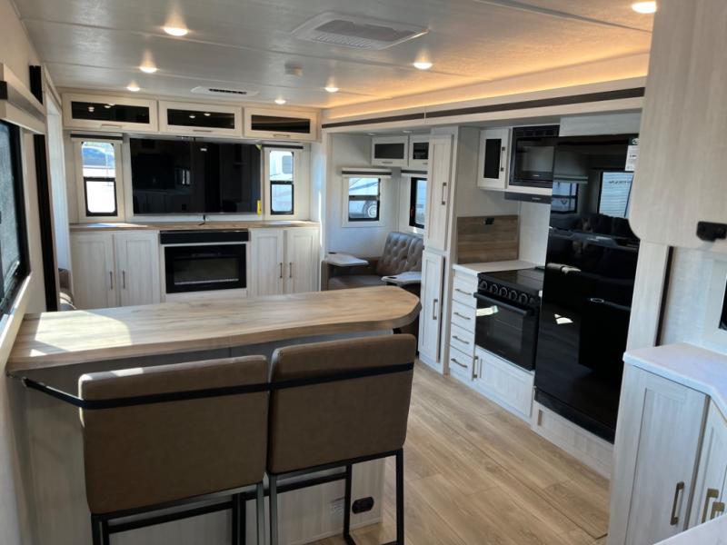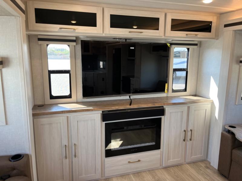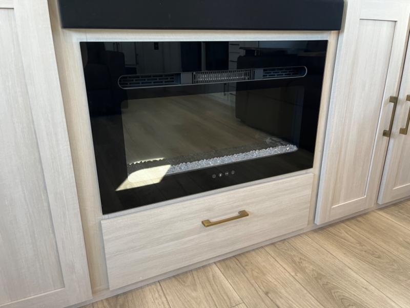 The perfect couples coach that is cozy and also features room for guests! As you enter you will notice the bar top with two chairs facing the rear of the unit where you can easily view the TV and fireplace in the living area while you enjoy your morning coffee. The combined kitchen and living area features two slides with the larger slide along the roadside featuring the kitchen appliances and a tri-fold sofa which would be great for overnight family and friends. There is also a theater seat facing the TV and fireplace, and a slide out free standing table with two chairs on one side and a multi-purpose ottoman than can be used where you need it anytime. Central vac will allow you to clean up easily throughout the unit. You also can choose to cook inside or out thanks to the outside kitchen featured under the 20' awning. When it's time to call it a night, you can clean up in the spacious full bath, then head to the front master bedroom to retire. There is a custom king bed slide out here, along with a full-wall wardrobe in front, a dresser and desk, a closet with washer and dryer prep, plus a second fireplace!