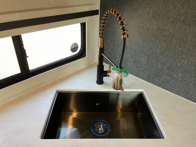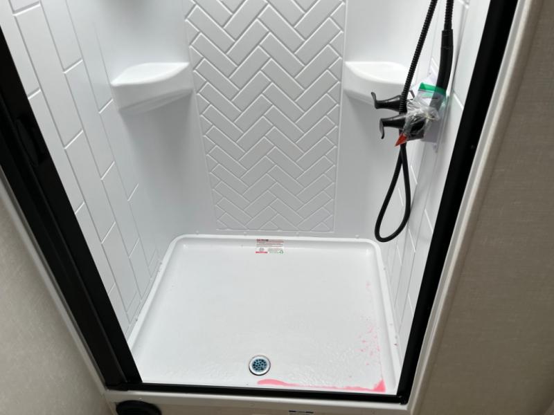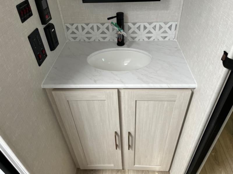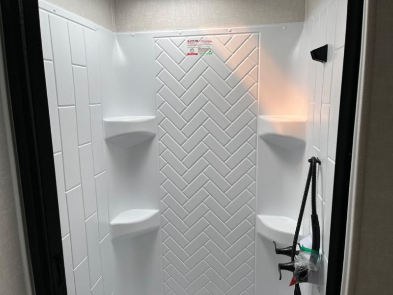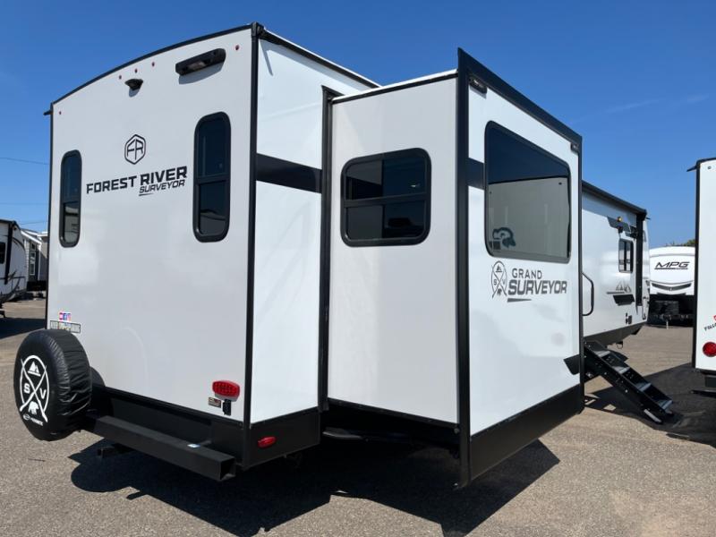 With any Grand Surveyor travel trailer by Forest River you will enjoy turn-key ready-to-go features and quality construction! Each model includes Azdel composite walls and a gel coated fiberglass front cap with an automotive style tinted windshield for a sleek look. There are friction hinge black glass entry door(s), an adjustable platform step with a night light, plus Goodyear tires and a power tongue jack for easy towing. The interior will have you feeling right at home with roller shades, residential faucets, sinks, and bathroom vanity, plus Surf(x) seamless countertops throughout. You can also plan for adventure with a 2" rear accessory and exterior spray port, and there are slam latch exterior baggage doors throughout to keep all your gear secure. Other stand-out features include a central vacuum system, a 200 watt solar panel with a 30 amp controller, a tankless water heater, carpet-free interiors, and the list goes on!