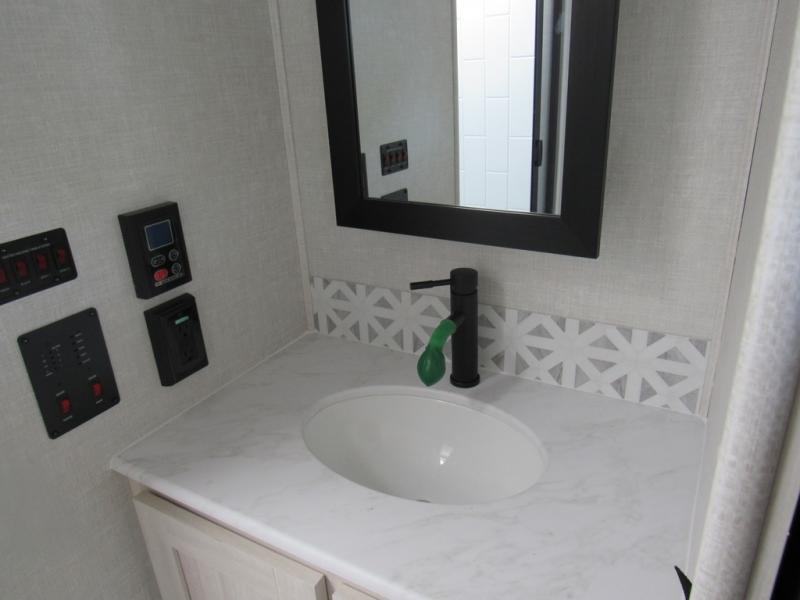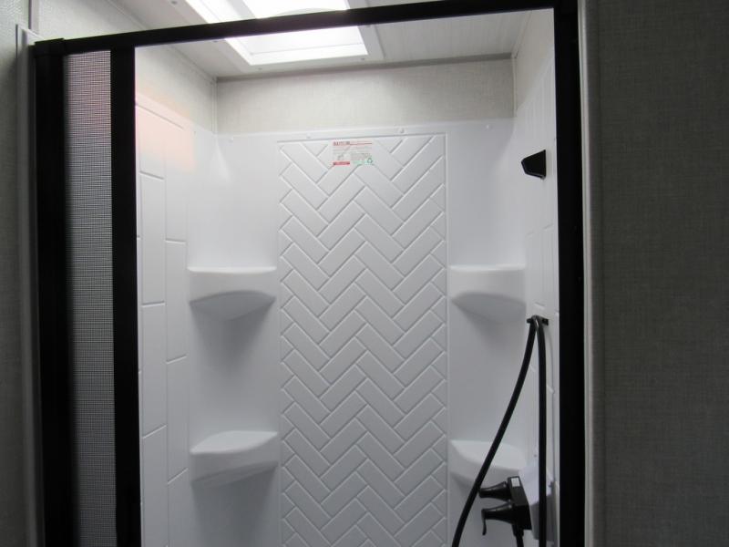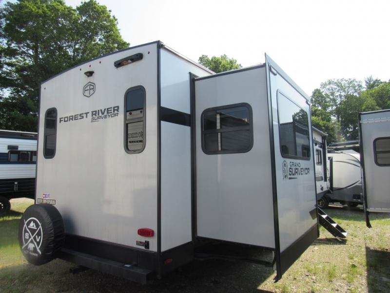 With any Grand Surveyor travel trailer by Forest River you will enjoy turn-key ready-to-go features and quality construction! Each model includes Azdel composite walls and a gel coated fiberglass front cap with an automotive style tinted windshield for a sleek look. There are friction hinge black glass entry door(s), an adjustable platform step with a night light, plus Goodyear tires and a power tongue jack for easy towing. The interior will have you feeling right at home with roller shades, residential faucets, sinks, and bathroom vanity, plus Surf(x) seamless countertops throughout. You can also plan for adventure with a 2" rear accessory and exterior spray port, and there are slam latch baggage doors throughout to keep all your gear secure. Other stand-out features include a central vacuum system, a 200 watt solar panel with a 30 amp controller, a tankless water heater, carpet-free interiors, and the list goes on!