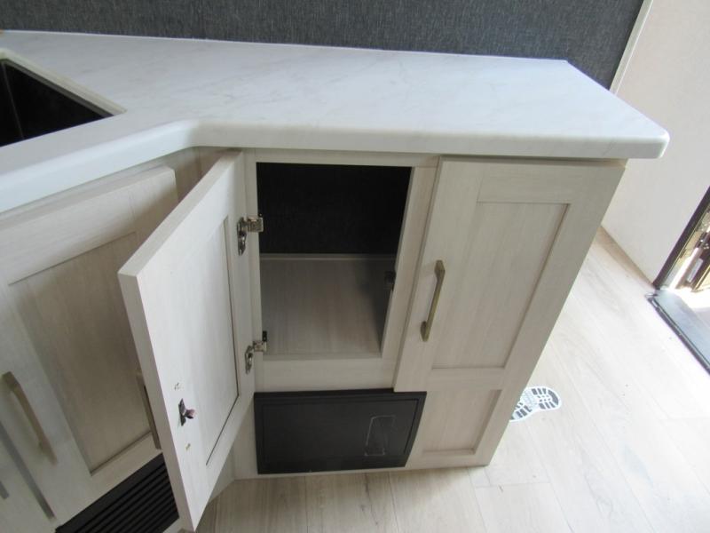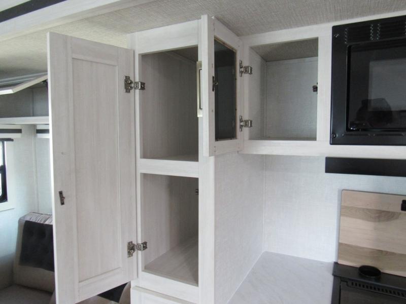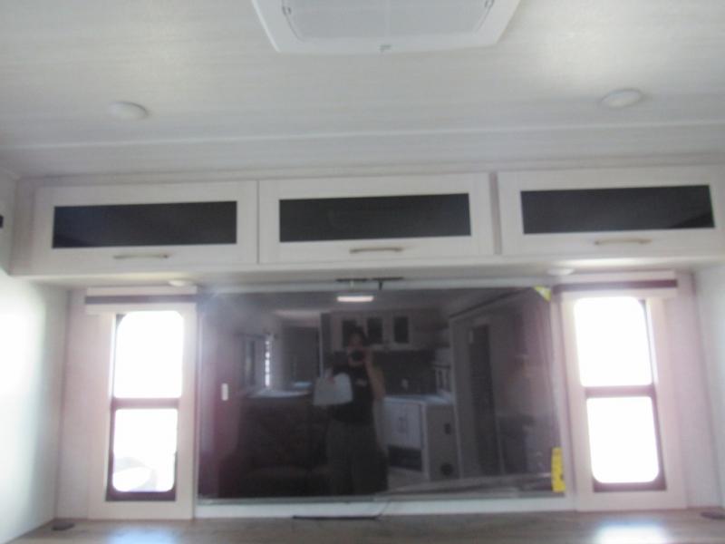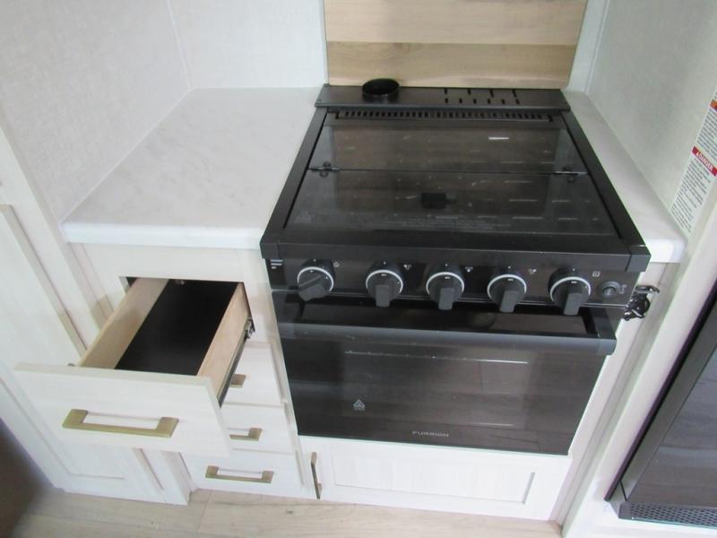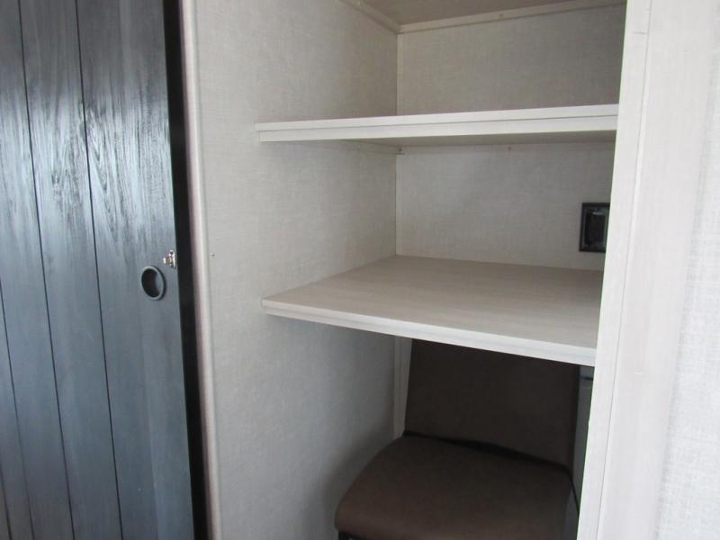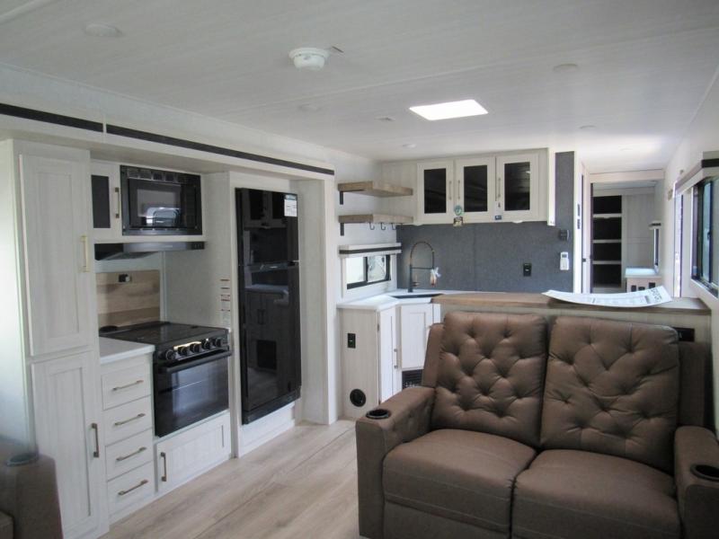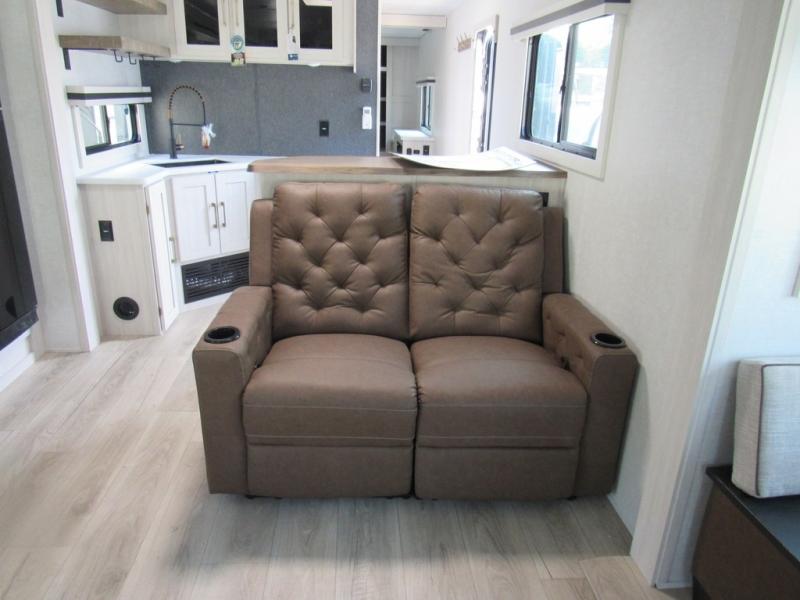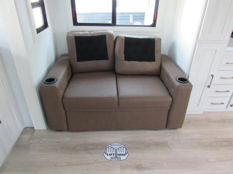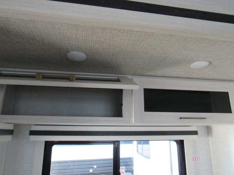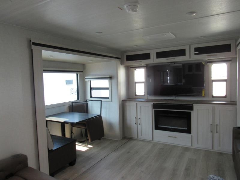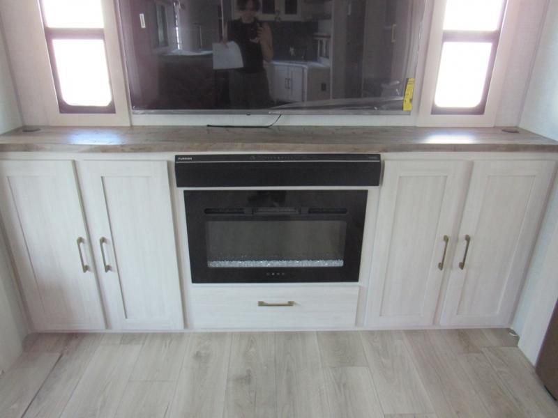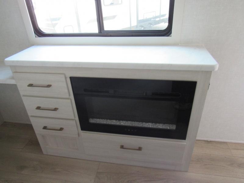 The perfect couples coach that is cozy and also features room for guests! As you enter you will notice the bar top with two chairs facing the rear of the unit where you can easily view the TV and fireplace in the living area while you enjoy your morning coffee. The combined kitchen and living area features two slides with the larger slide along the roadside featuring the kitchen appliances and a 56" tri-fold sofa which would be great for overnight family and friends. There is also a 56" theater seat facing the TV and fireplace, and a slide out free standing table with two chairs on one side and a multi-purpose ottoman than can be used where you need it anytime. Central vac will allow you to clean up easily throughout the unit. You also can choose to cook inside or out thanks to the outside kitchen featured under the 20' awning. When it's time to call it a night, you can clean up in the spacious full bath, then head to the front master bedroom to retire. There is a custom king bed slide out here, along with a full-wall wardrobe in front, a dresser and desk, a closet with washer and dryer prep, plus a second fireplace!