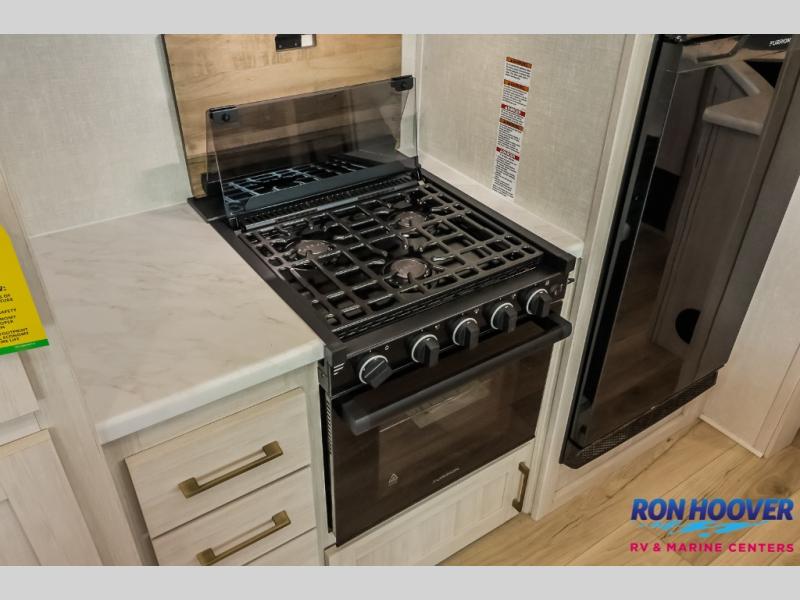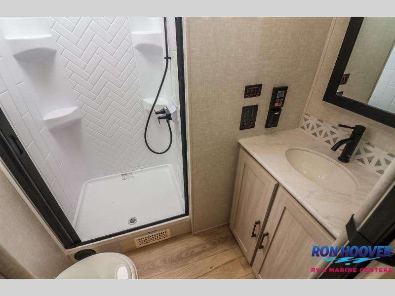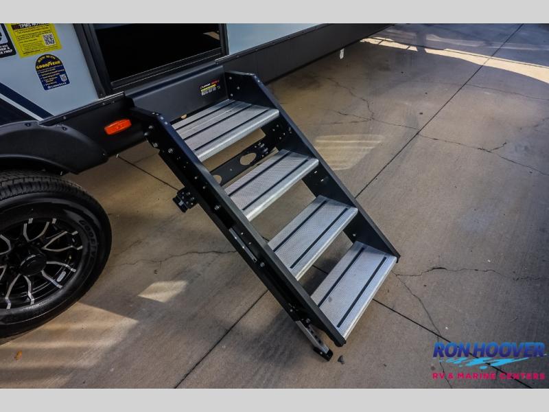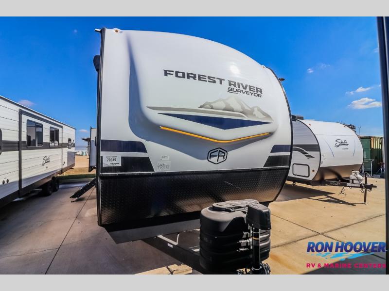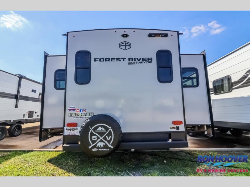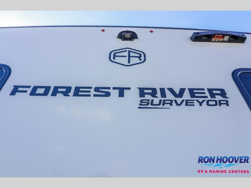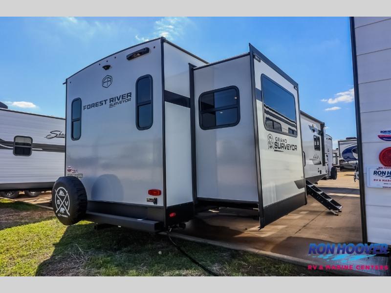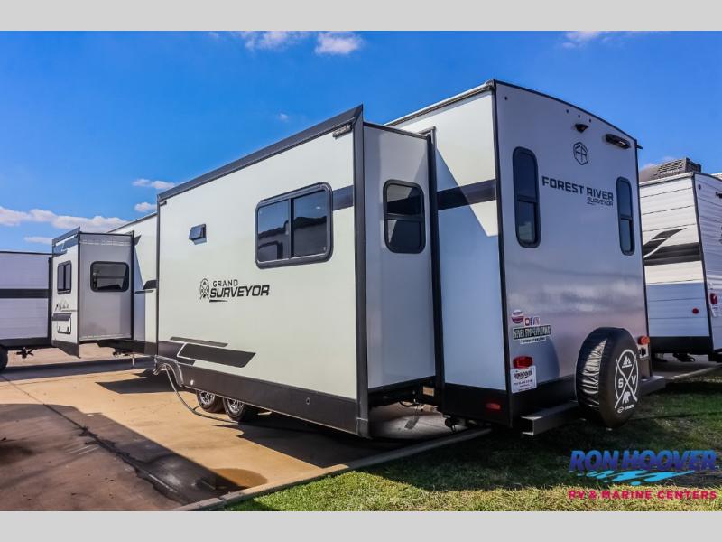 With any Grand Surveyor travel trailer by Forest River you will enjoy turn-key ready-to-go features and quality construction! Each model includes Azdel composite walls and a gel coated fiberglass front cap with an automotive style tinted windshield for a sleek look. There are friction hinge black glass entry door(s), an adjustable platform step with a night light, plus Goodyear tires and a power tongue jack for easy towing. The interior will have you feeling right at home with roller shades, residential faucets, sinks, and bathroom vanity, plus Surf(x) seamless countertops throughout. You can also plan for adventure with a 2" rear accessory and exterior spray port, and there are slam latch exterior baggage doors throughout to keep all your gear secure. Other stand-out features include a central vacuum system, a 200 watt solar panel with a 30 amp controller, a tankless water heater, carpet-free interiors, and the list goes on!