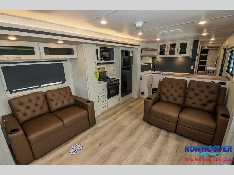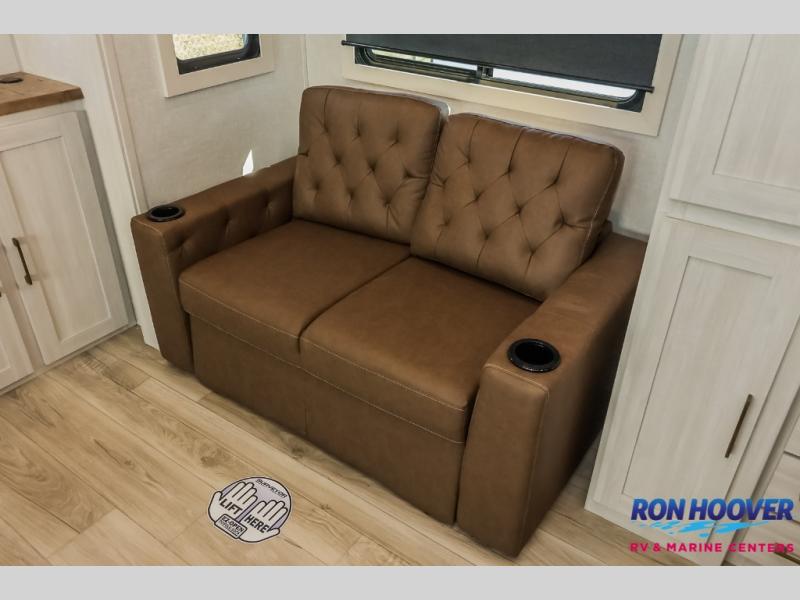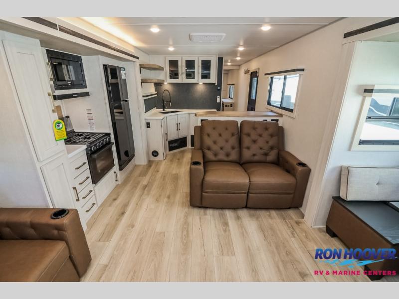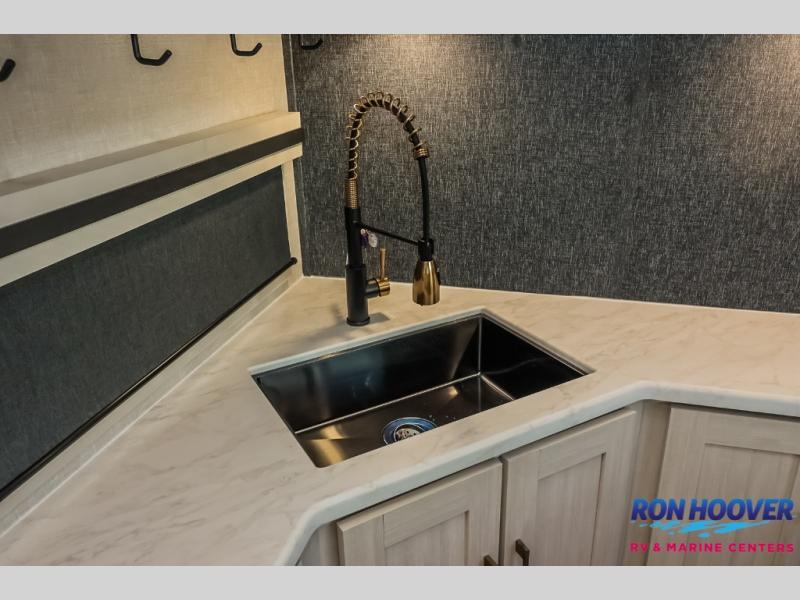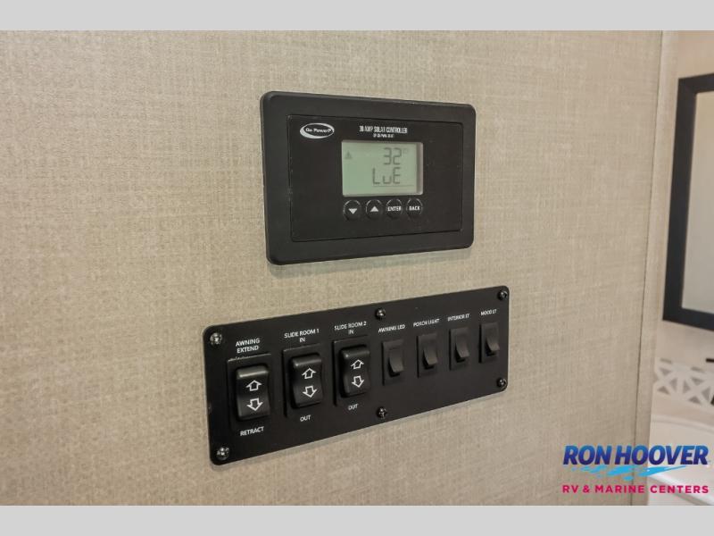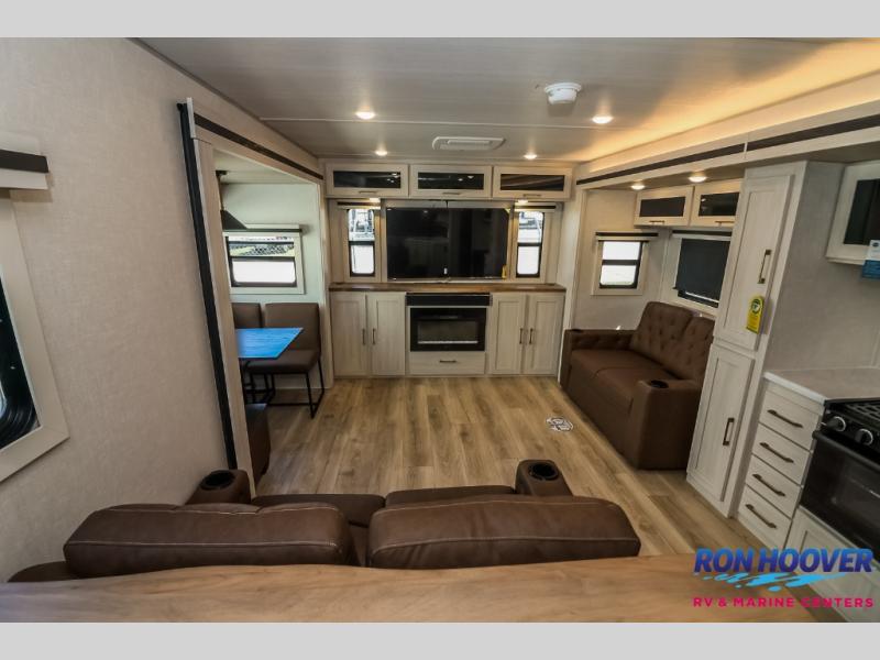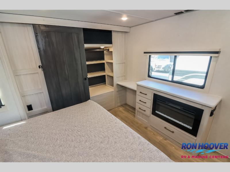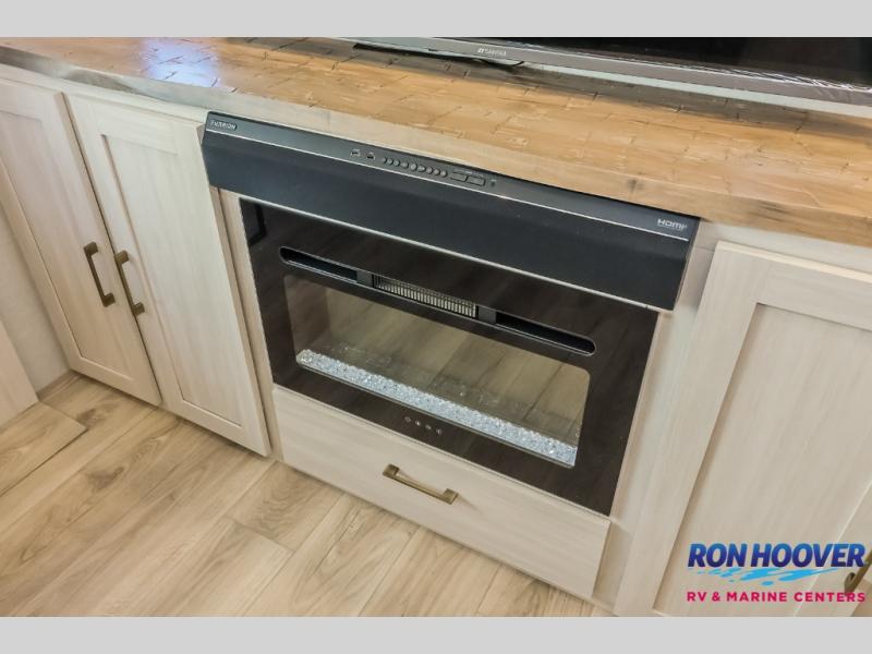 The perfect couples coach that is cozy and also features room for guests! As you enter you will notice the bar top with two chairs facing the rear of the unit where you can easily view the TV and fireplace in the living area while you enjoy your morning coffee. The combined kitchen and living area features two slides with the larger slide along the roadside featuring the kitchen appliances and a tri-fold sofa which would be great for overnight family and friends. There is also a theater seat facing the TV and fireplace, and a slide out free standing table with two chairs on one side and a multi-purpose ottoman than can be used where you need it anytime. Central vac will allow you to clean up easily throughout the unit. You also can choose to cook inside or out thanks to the outside kitchen featured under the 20' awning. When it's time to call it a night, you can clean up in the spacious full bath, then head to the front master bedroom to retire. There is a custom king bed slide out here, along with a full-wall wardrobe in front, a dresser and desk, a closet with washer and dryer prep, plus a second fireplace!