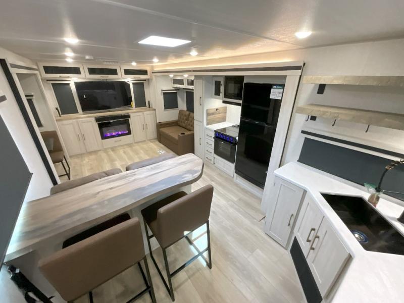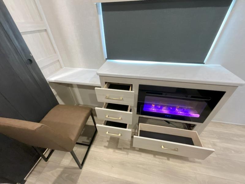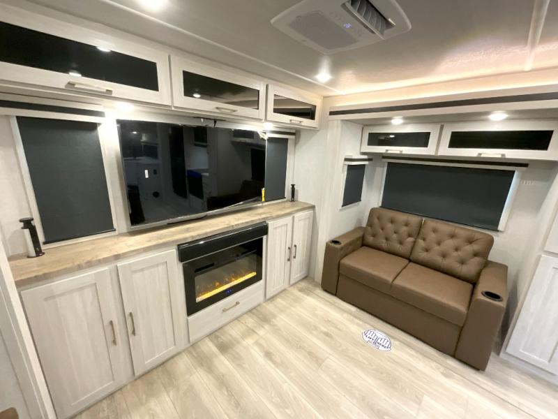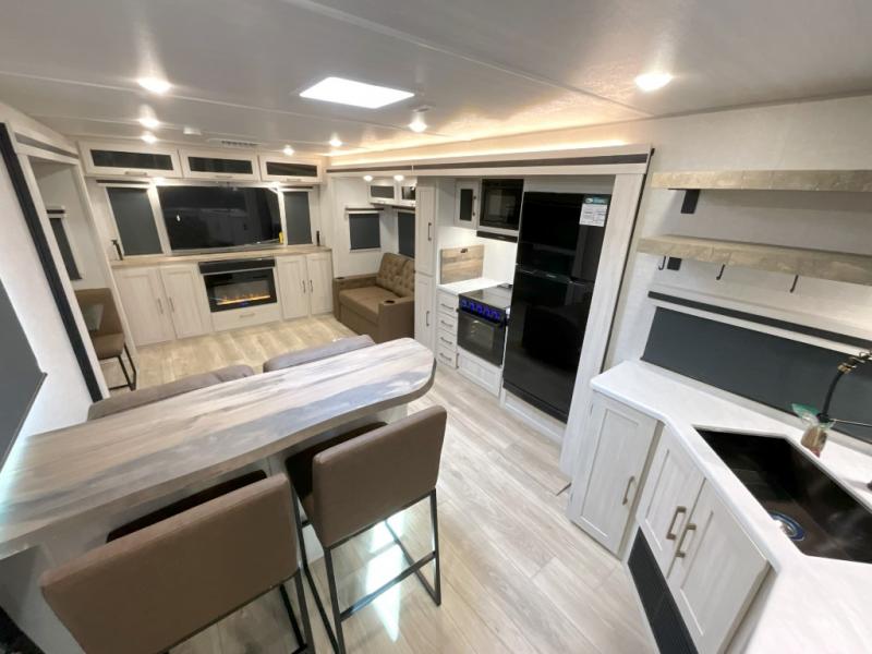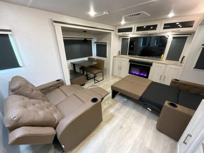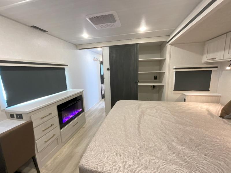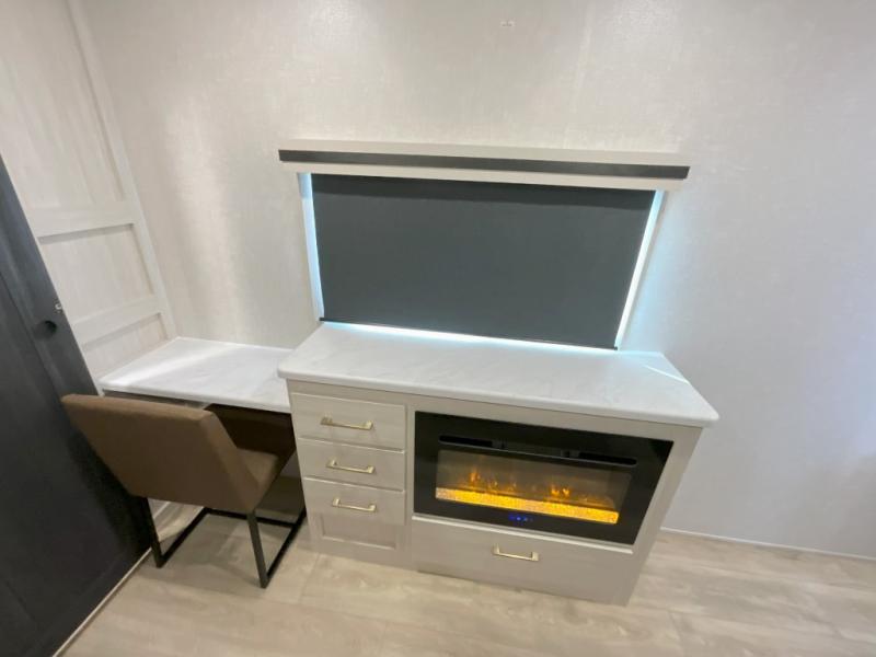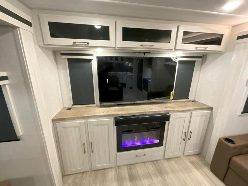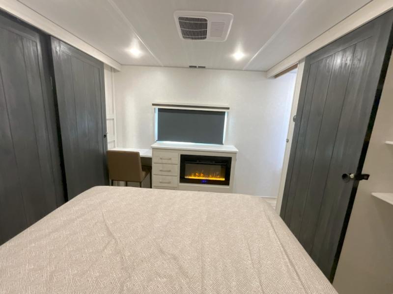 The perfect couples coach that is cozy and also features room for guests! As you enter you will notice the bar top with two chairs facing the rear of the unit where you can easily view the TV and fireplace in the living area while you enjoy your morning coffee. The combined kitchen and living area features two slides with the larger slide along the roadside featuring the kitchen appliances and a tri-fold sofa which would be great for overnight family and friends. There is also a theater seat facing the TV and fireplace, and a slide out free standing table with two chairs on one side and a multi-purpose ottoman than can be used where you need it anytime. Central vac will allow you to clean up easily throughout the unit. You also can choose to cook inside or out thanks to the outside kitchen featured under the 20' awning. When it's time to call it a night, you can clean up in the spacious full bath, then head to the front master bedroom to retire. There is a custom king bed slide out here, along with a full-wall wardrobe in front, a dresser and desk, a closet with washer and dryer prep, plus a second fireplace!