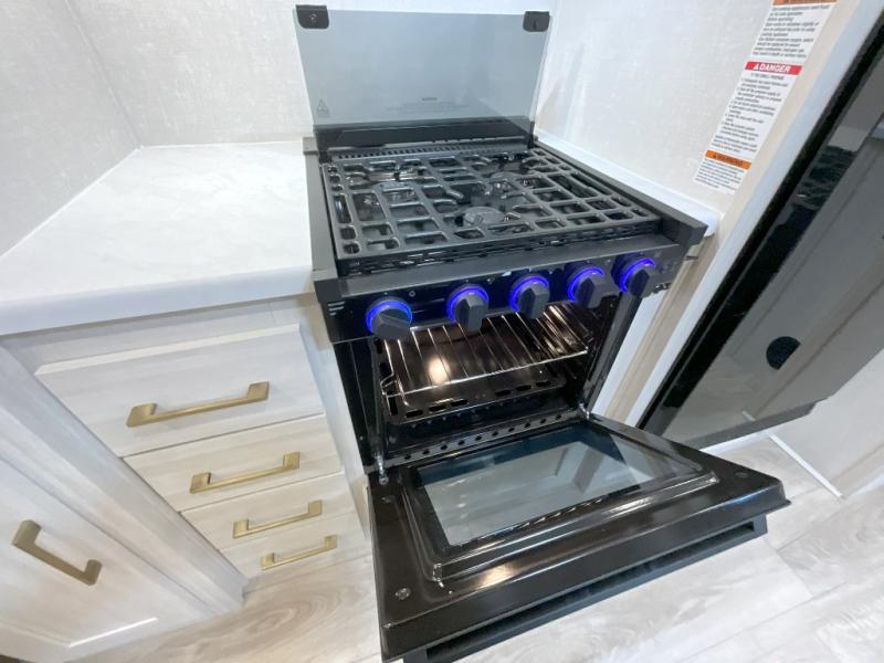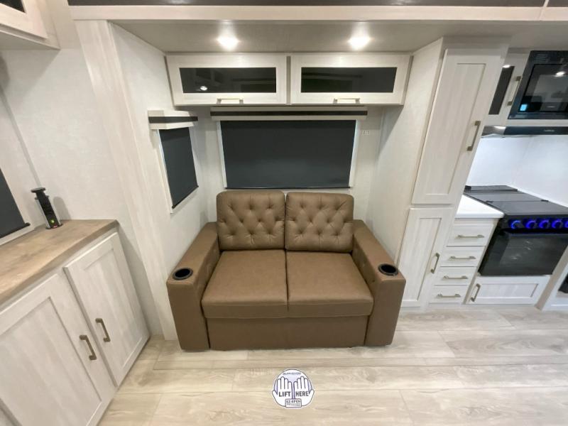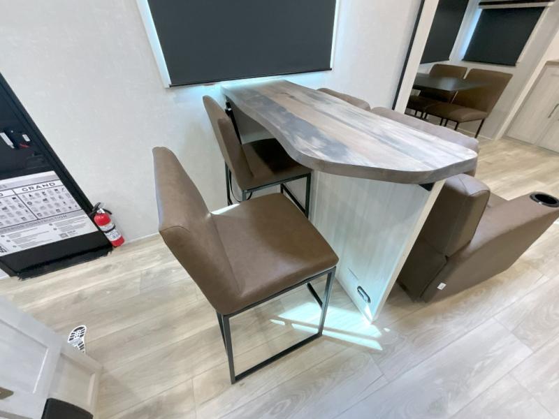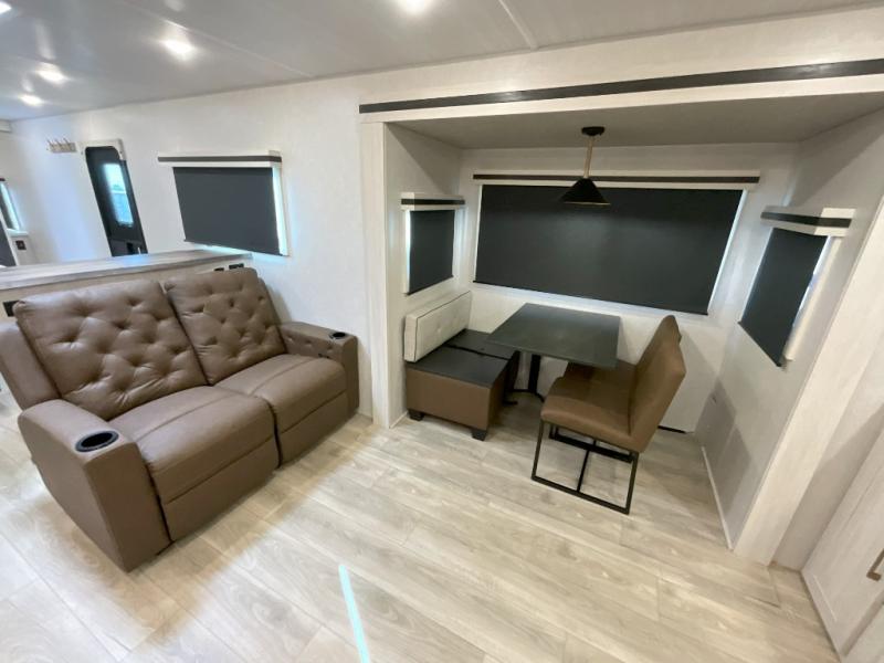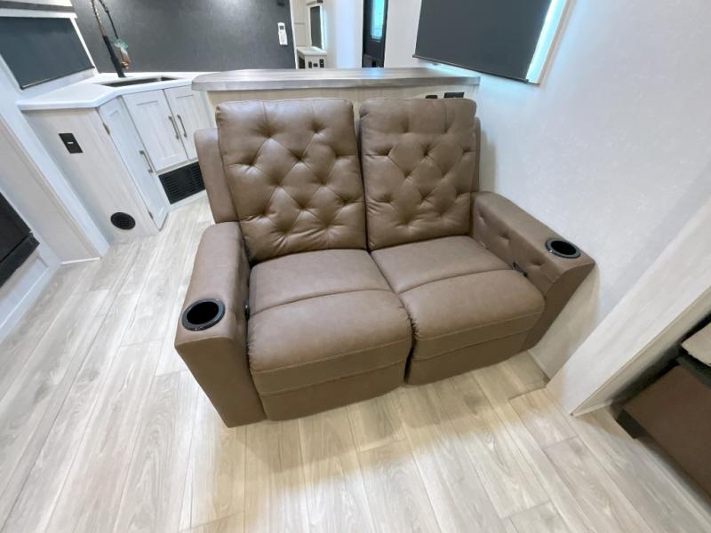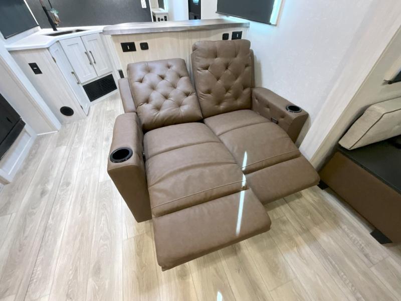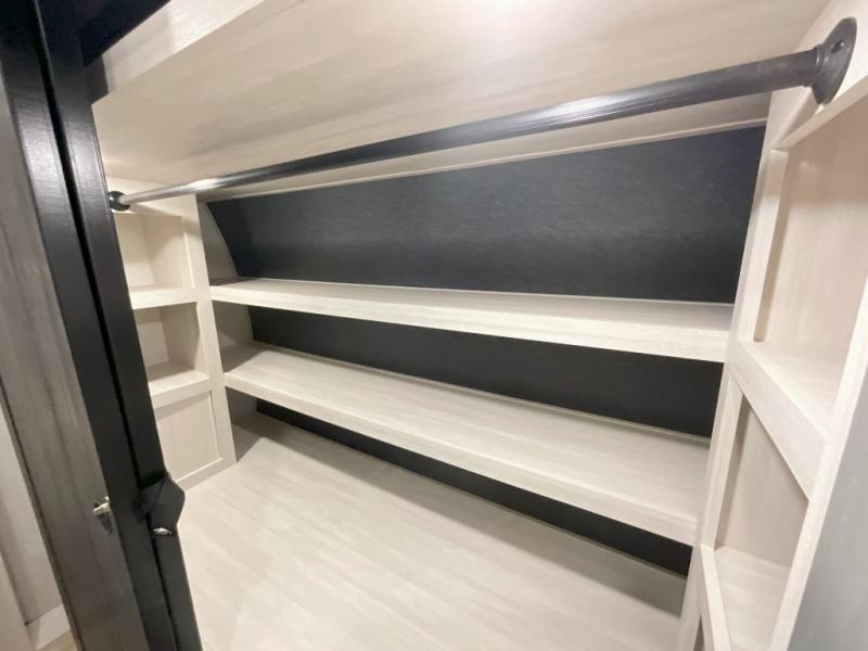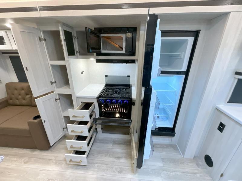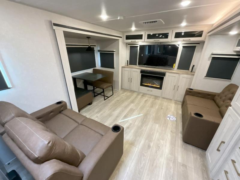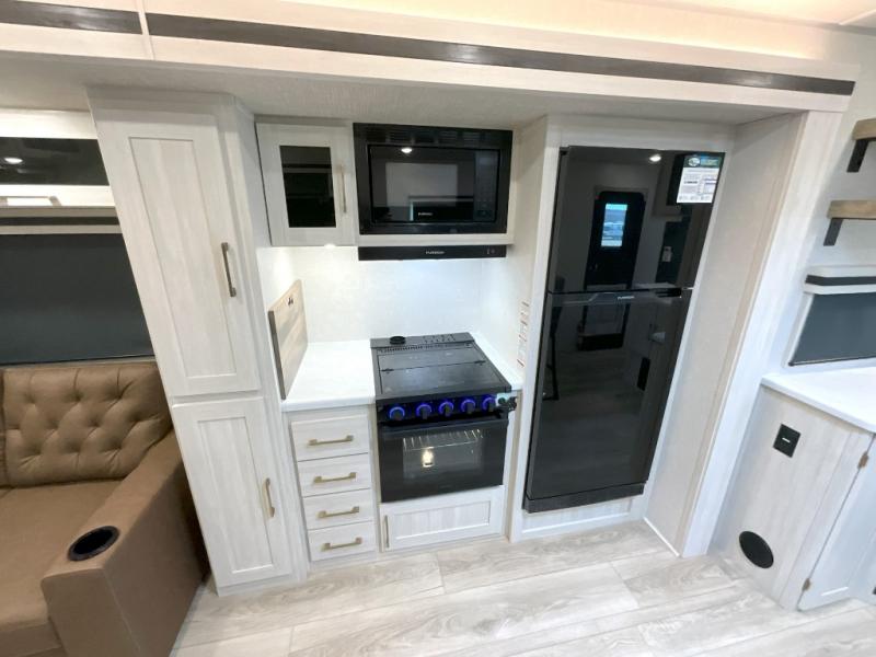 The perfect couples coach that is cozy and also features room for guests! As you enter you will notice the bar top with two chairs facing the rear of the unit where you can easily view the TV and fireplace in the living area while you enjoy your morning coffee. The combined kitchen and living area features two slides with the larger slide along the roadside featuring the kitchen appliances and a tri-fold sofa which would be great for overnight family and friends. There is also a theater seat facing the TV and fireplace, and a slide out free standing table with two chairs on one side and a multi-purpose ottoman than can be used where you need it anytime. Central vac will allow you to clean up easily throughout the unit. You also can choose to cook inside or out thanks to the outside kitchen featured under the 20' awning. When it's time to call it a night, you can clean up in the spacious full bath, then head to the front master bedroom to retire. There is a custom king bed slide out here, along with a full-wall wardrobe in front, a dresser and desk, a closet with washer and dryer prep, plus a second fireplace!