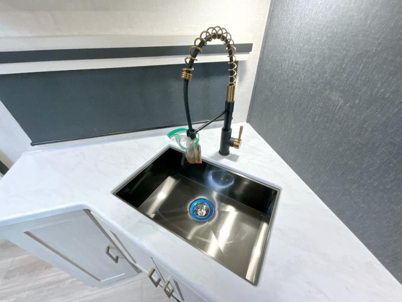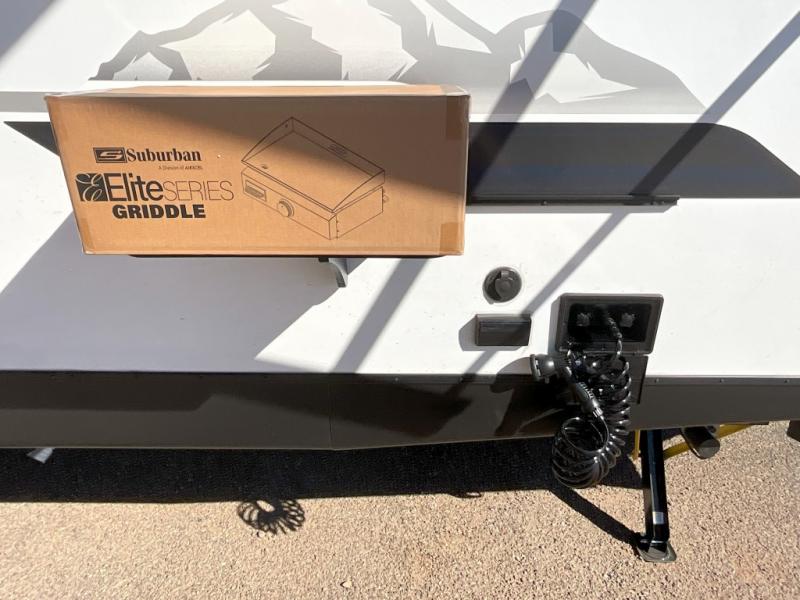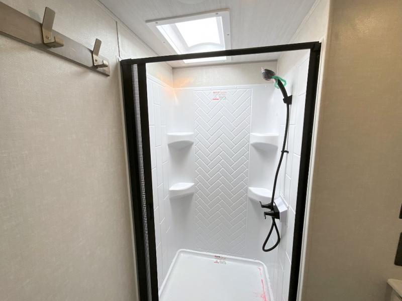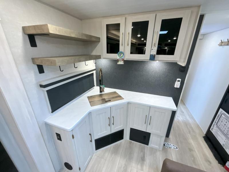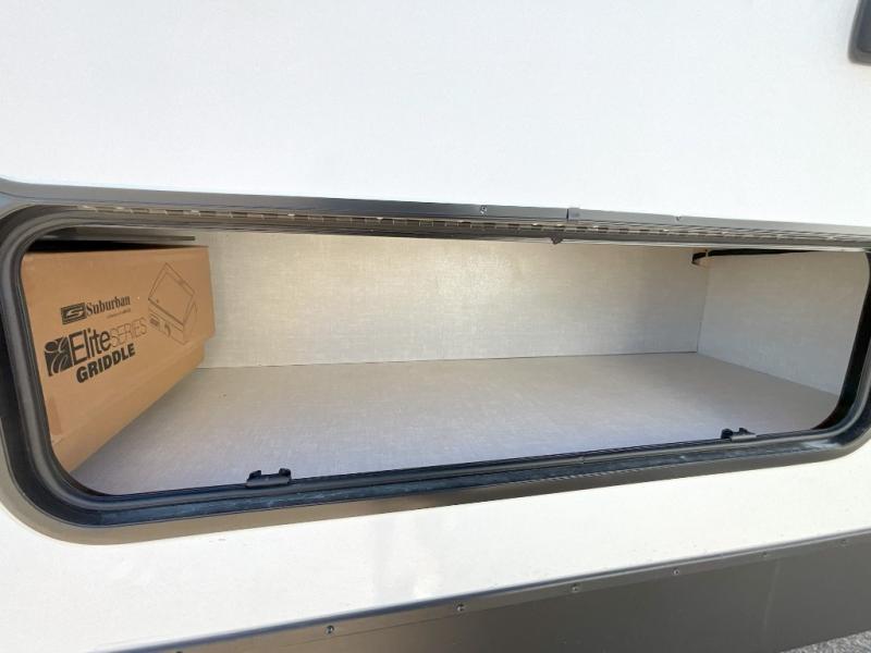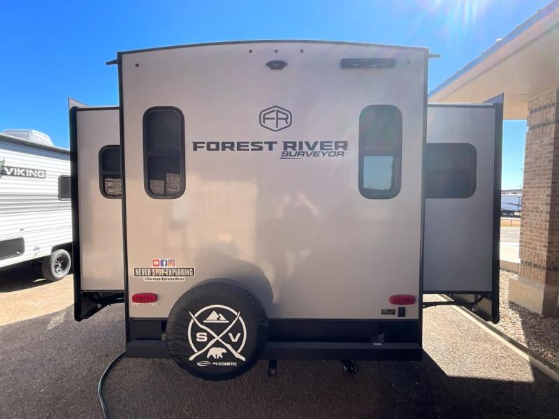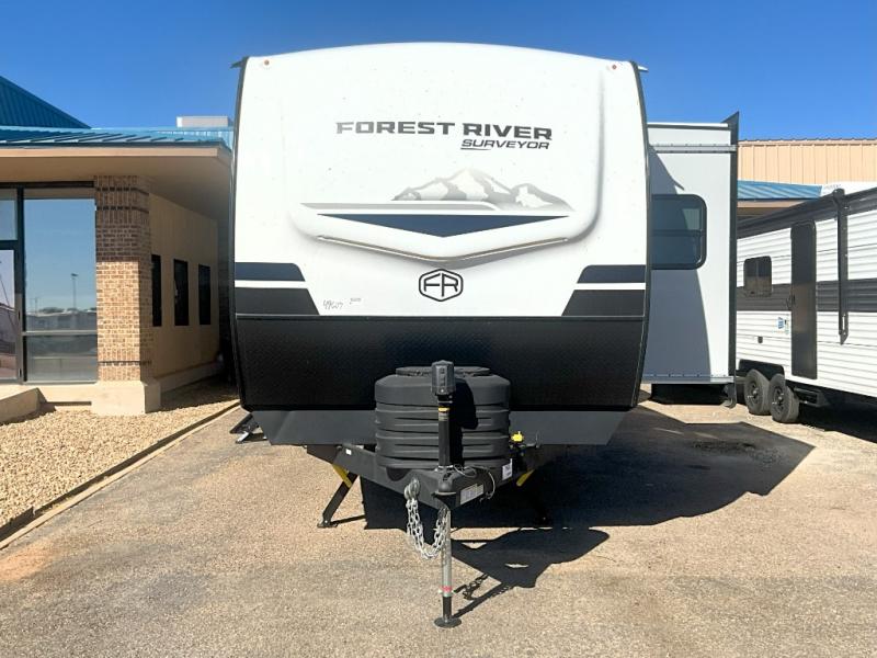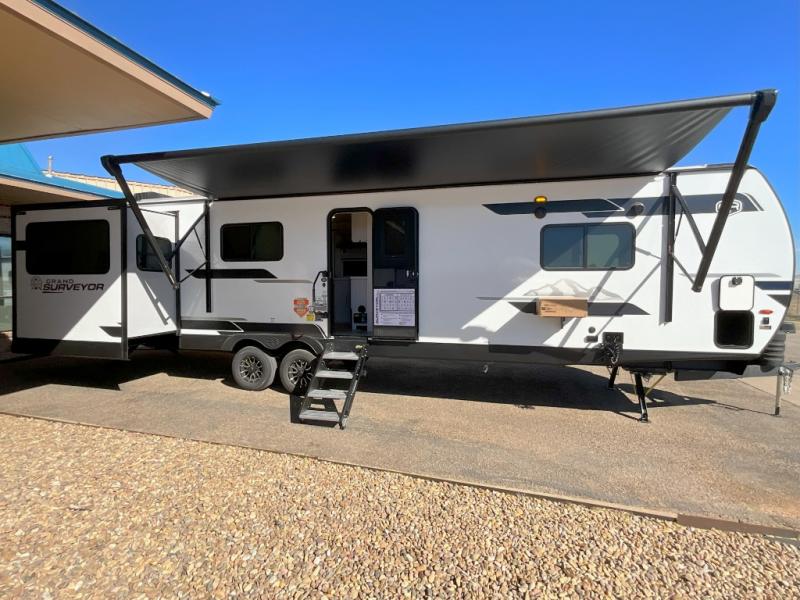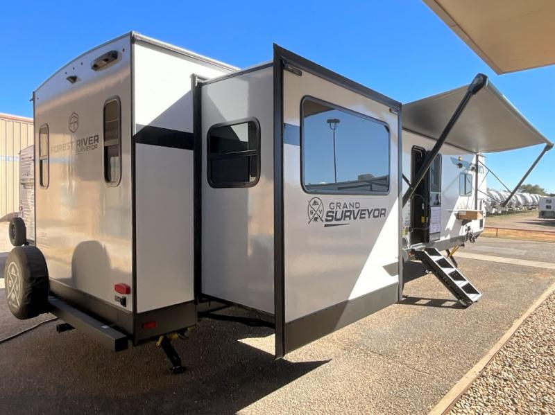 With any Grand Surveyor travel trailer by Forest River you will enjoy turn-key ready-to-go features and quality construction! Each model includes Azdel composite walls and a gel coated fiberglass front cap with an automotive style tinted windshield for a sleek look. There are friction hinge black glass entry door(s), an adjustable platform step with a night light, plus Goodyear tires and a power tongue jack for easy towing. The interior will have you feeling right at home with roller shades, residential faucets, sinks, and bathroom vanity, plus Surf(x) seamless countertops throughout. You can also plan for adventure with a 2" rear accessory and exterior spray port, and there are slam latch exterior baggage doors throughout to keep all your gear secure. Other stand-out features include a central vacuum system, a 200 watt solar panel with a 30 amp controller, a tankless water heater, carpet-free interiors, and the list goes on!