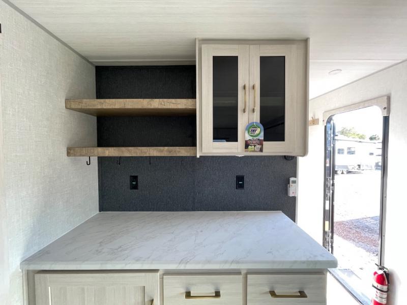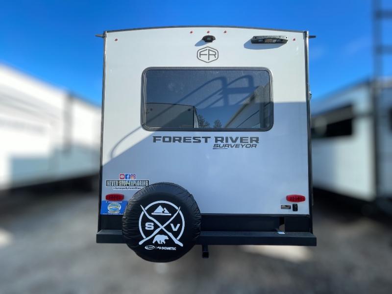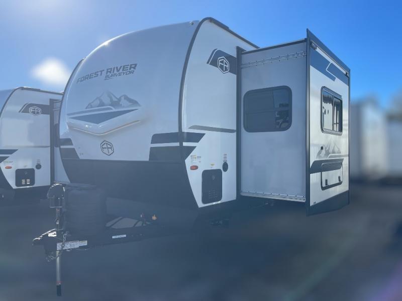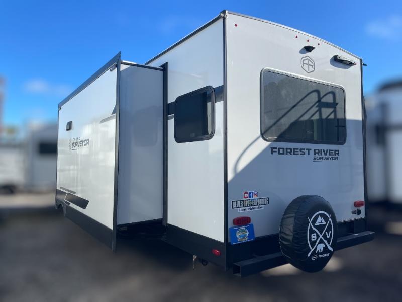 With any Grand Surveyor travel trailer by Forest River you will enjoy turn-key ready-to-go features and quality construction! Each model includes Azdel composite walls and a gel coated fiberglass front cap with an automotive style tinted windshield for a sleek look. There are friction hinge black glass entry door(s), an adjustable platform step with a night light, plus Goodyear tires and a power tongue jack for easy towing. The interior will have you feeling right at home with roller shades, residential faucets, sinks, and bathroom vanity, plus Surf(x) seamless countertops throughout. You can also plan for adventure with a 2" rear accessory and exterior spray port, and there are slam latch baggage doors throughout to keep all your gear secure. Other stand-out features include a central vacuum system, a 200 watt solar panel with a 30 amp controller, a tankless water heater, carpet-free interiors, and the list goes on!