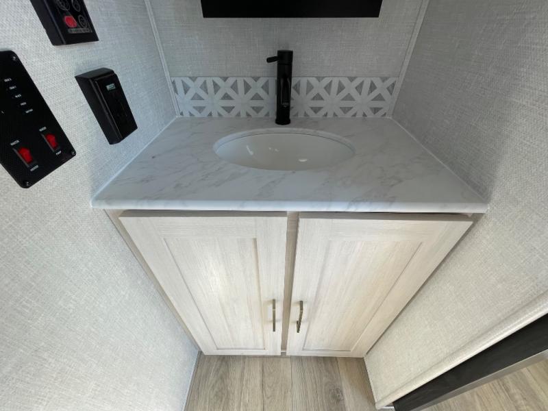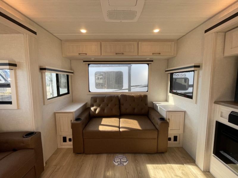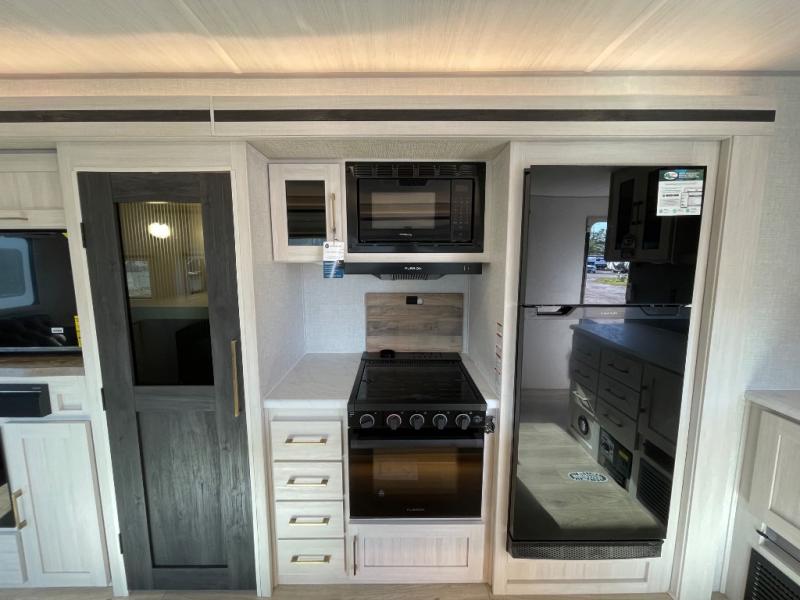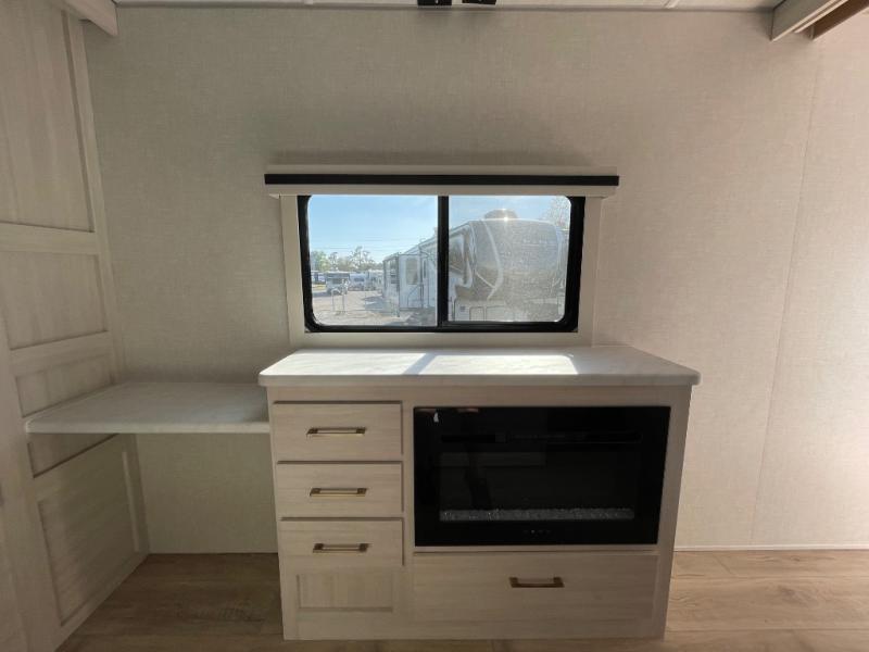 If luxury is what you're looking for, you won't have to search far with this travel trailer! There are triple slides, with dual opposing slides in the main living area for maximum space. The kitchen island gives a more residential feel to this space, plus there is a pantry, a hutch with shelves, a 10 cu. ft. 12V black glass refrigerator, and more kitchen features you are sure to love. The rear living area includes a tri-fold sofa to provide sleeping space for two overnight guests, and there is a theater seat across from the fireplace and HD TV. You'll also enjoy dining at the free-standing dinette with a multi-purpose ottoman! When it's time to call it a night, you can clean up in the spacious full bath, then head to the front master bedroom to retire. There is a custom king bed slide out here, along with a full-wall wardrobe in front, a dresser, a closet with washer and dryer prep, plus a bedroom fireplace!