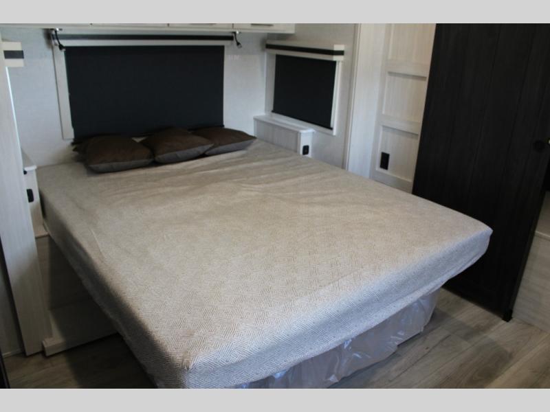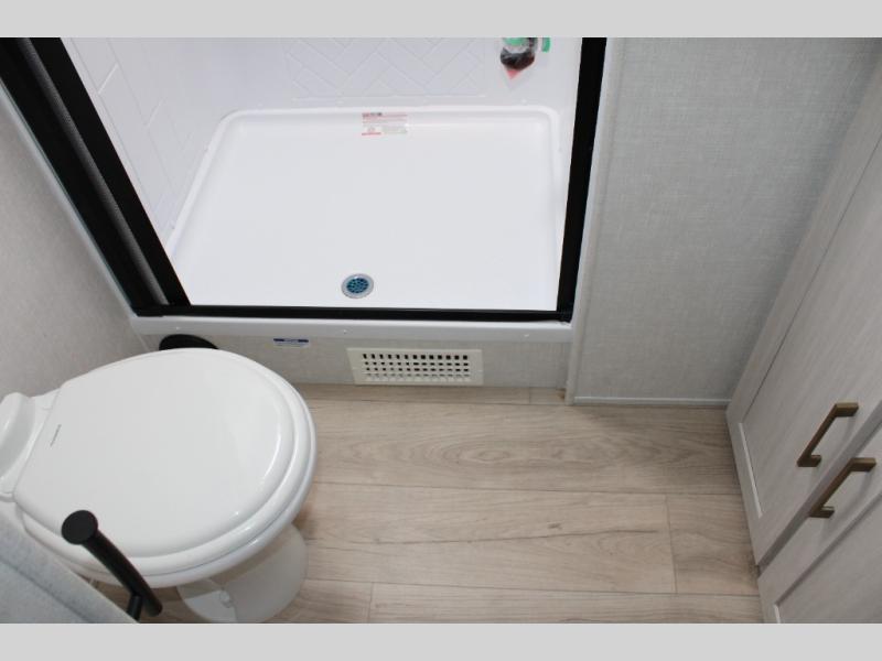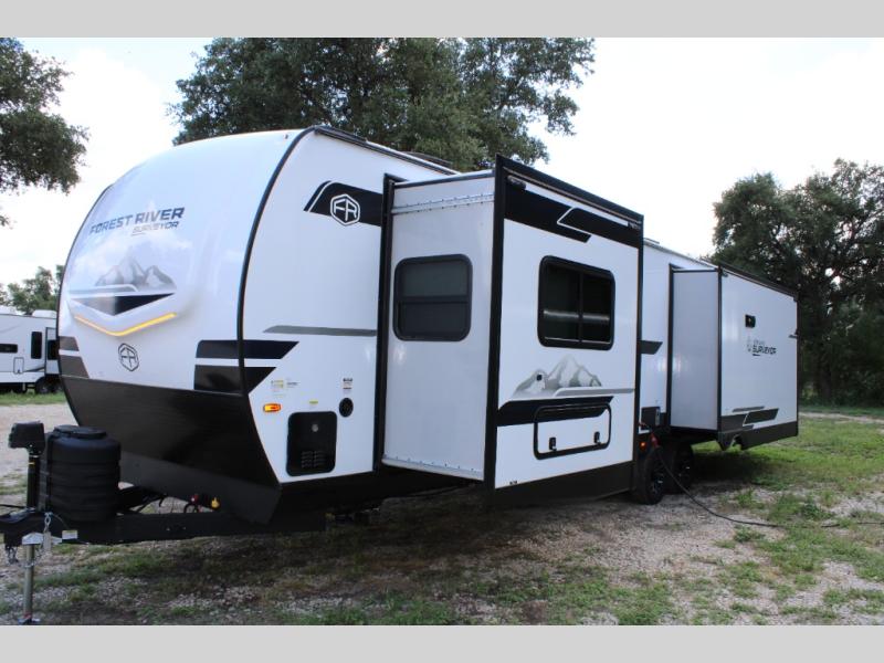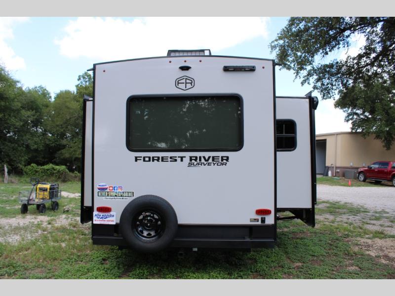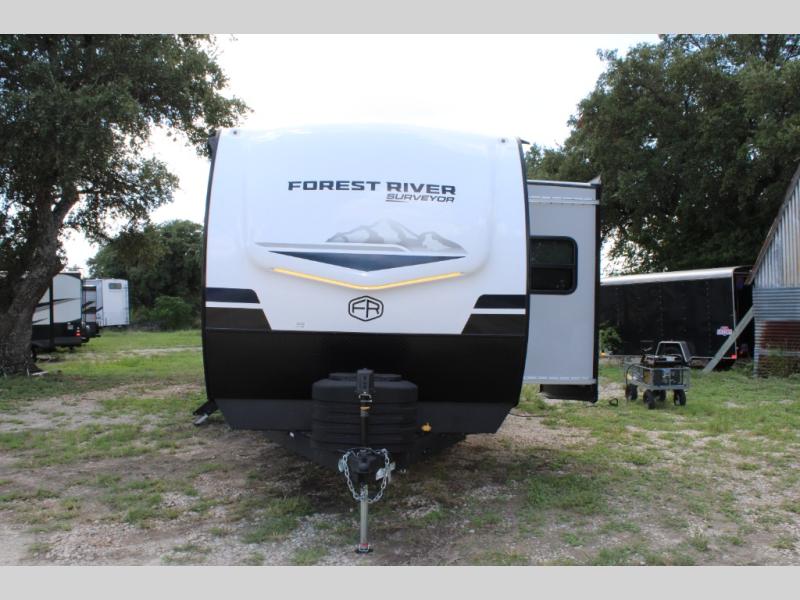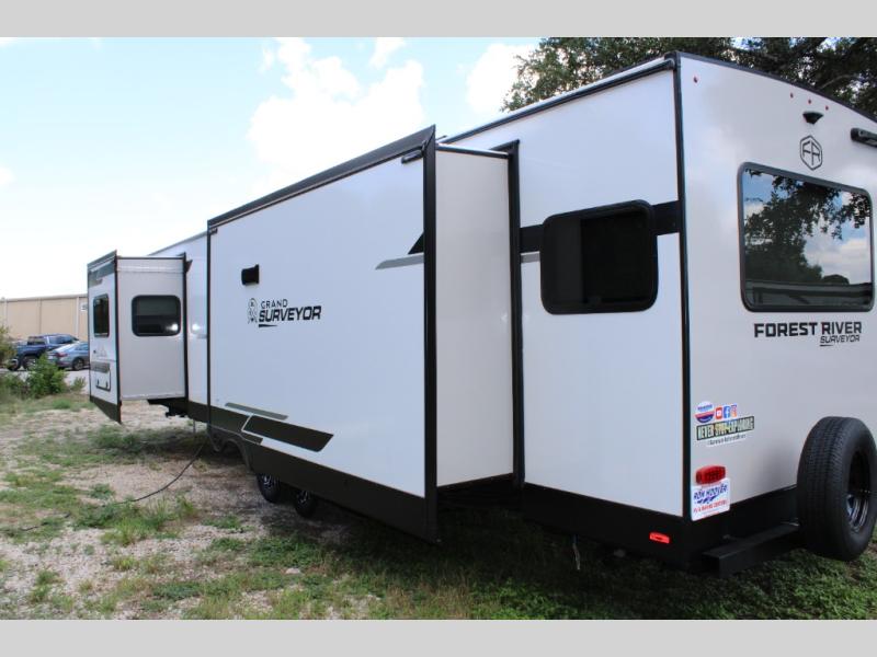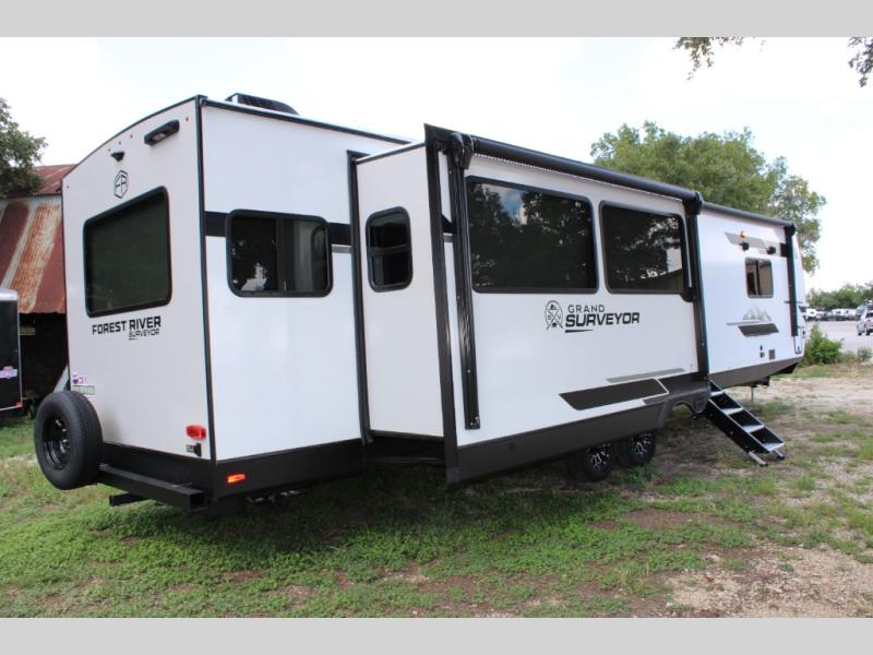 With any Grand Surveyor travel trailer by Forest River you will enjoy turn-key ready-to-go features and quality construction! Each model includes Azdel composite walls and a gel coated fiberglass front cap with an automotive style tinted windshield for a sleek look. There are friction hinge black glass entry door(s), an adjustable platform step with a night light, plus Goodyear tires and a power tongue jack for easy towing. The interior will have you feeling right at home with roller shades, residential faucets, sinks, and bathroom vanity, plus Surf(x) seamless countertops throughout. You can also plan for adventure with a 2" rear accessory and exterior spray port, and there are slam latch baggage doors throughout to keep all your gear secure. Other stand-out features include a central vacuum system, a 200 watt solar panel with a 30 amp controller, a tankless water heater, carpet-free interiors, and the list goes on!