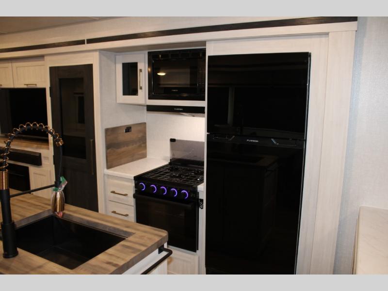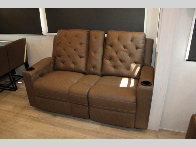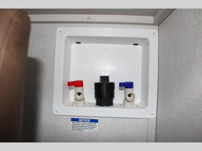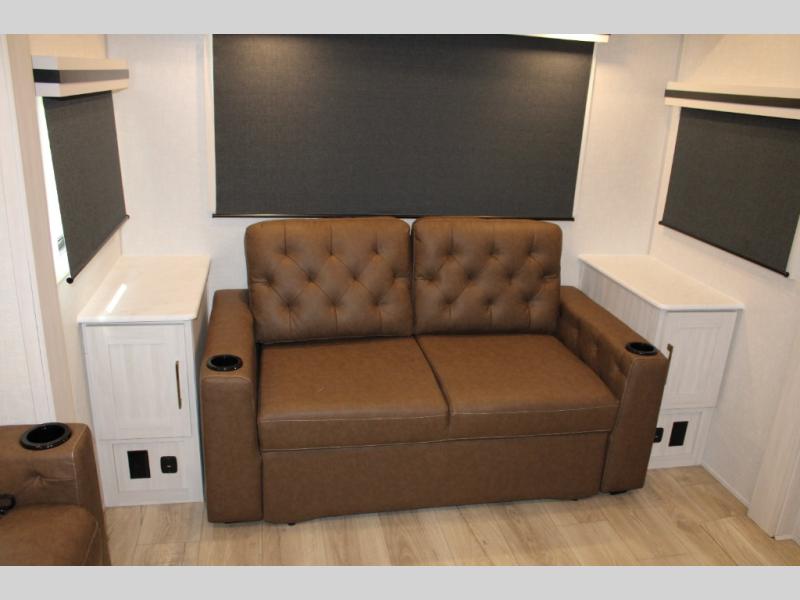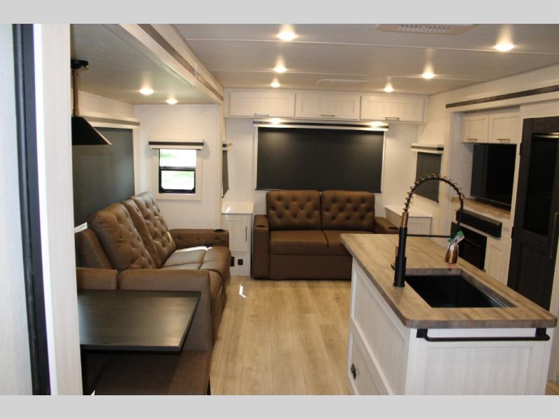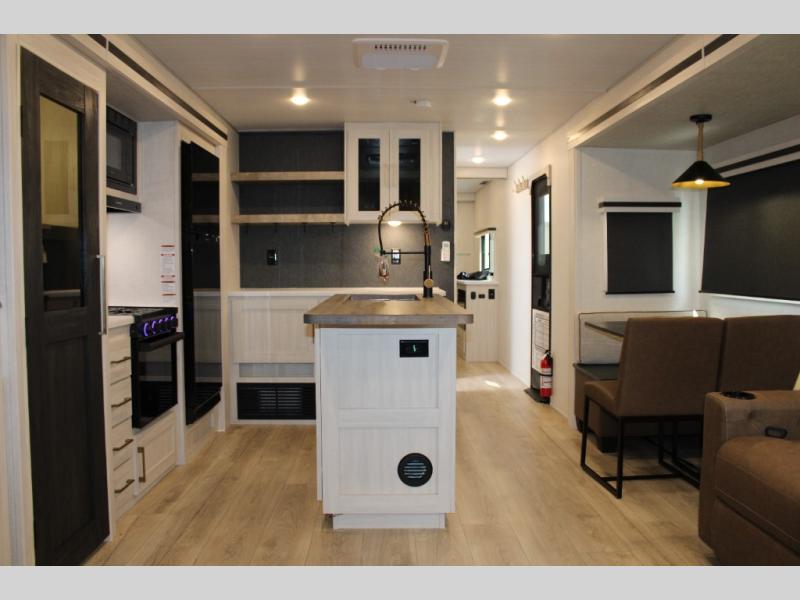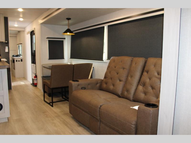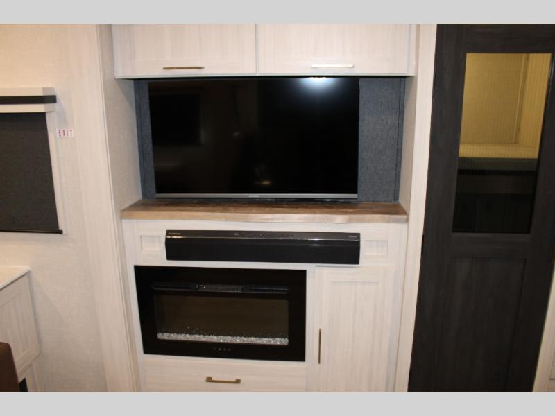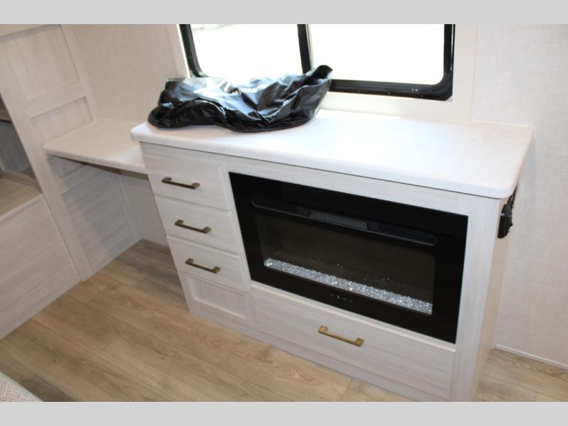 If luxury is what you're looking for, you won't have to search far with this travel trailer! There are triple slides, with dual opposing slides in the main living area for maximum space. The kitchen island gives a more residential feel to this space, plus there is a pantry, a hutch with shelves, a 10 cu. ft. 12V black glass refrigerator, and more kitchen features you are sure to love. The rear living area includes a tri-fold sofa to provide sleeping space for two overnight guests, and there is a theater seat across from the fireplace and HD TV. You'll also enjoy dining at the free-standing dinette with a multi-purpose ottoman! When it's time to call it a night, you can clean up in the spacious full bath, then head to the front master bedroom to retire. There is a custom king bed slide out here, along with a full-wall wardrobe in front, a dresser, a closet with washer and dryer prep, plus a bedroom fireplace!