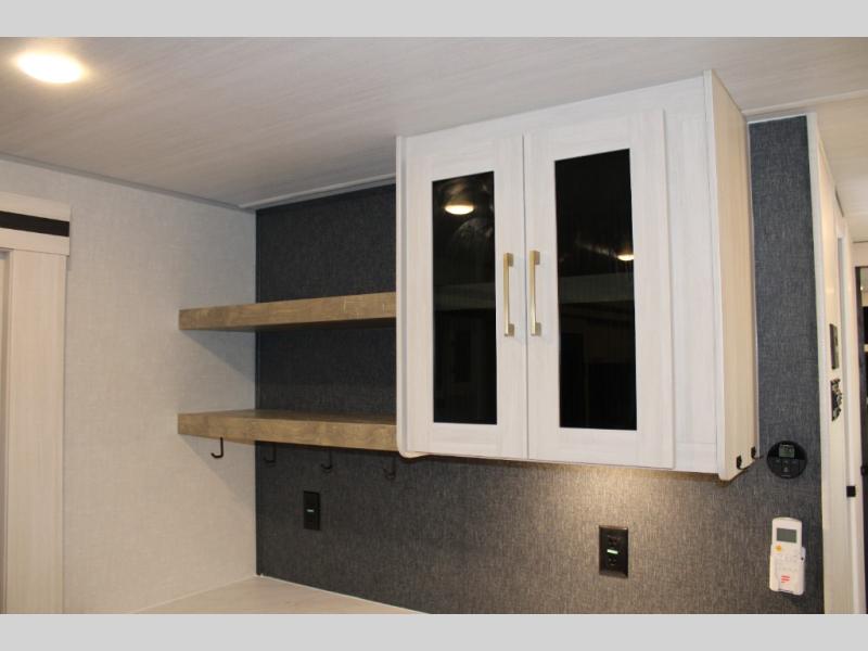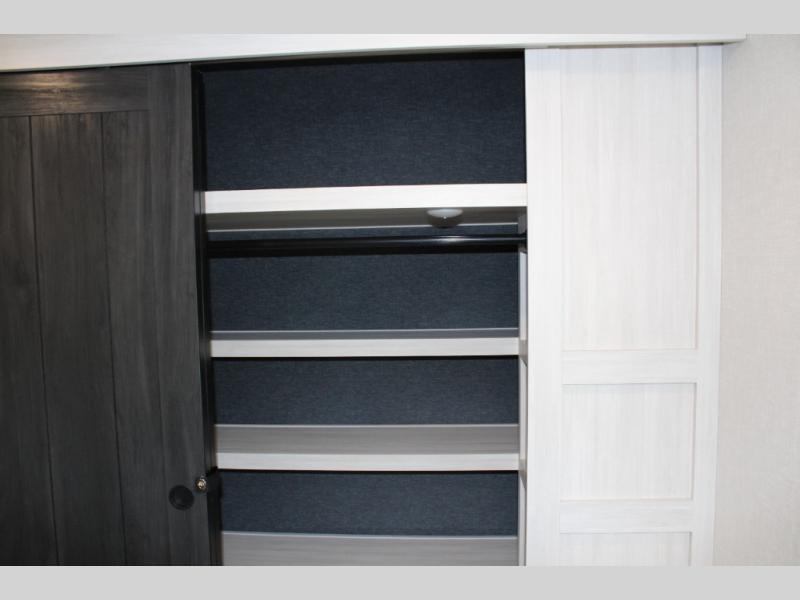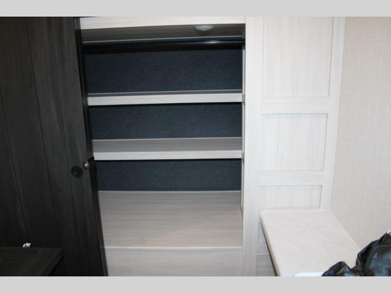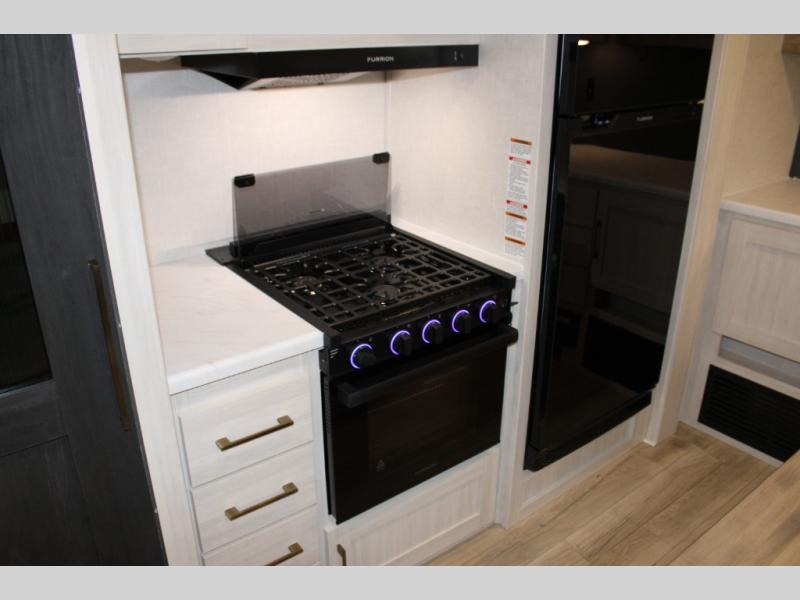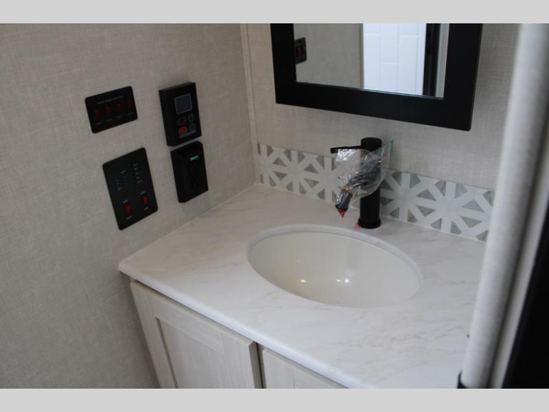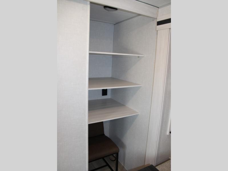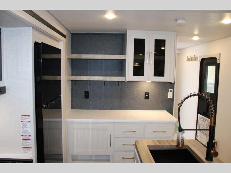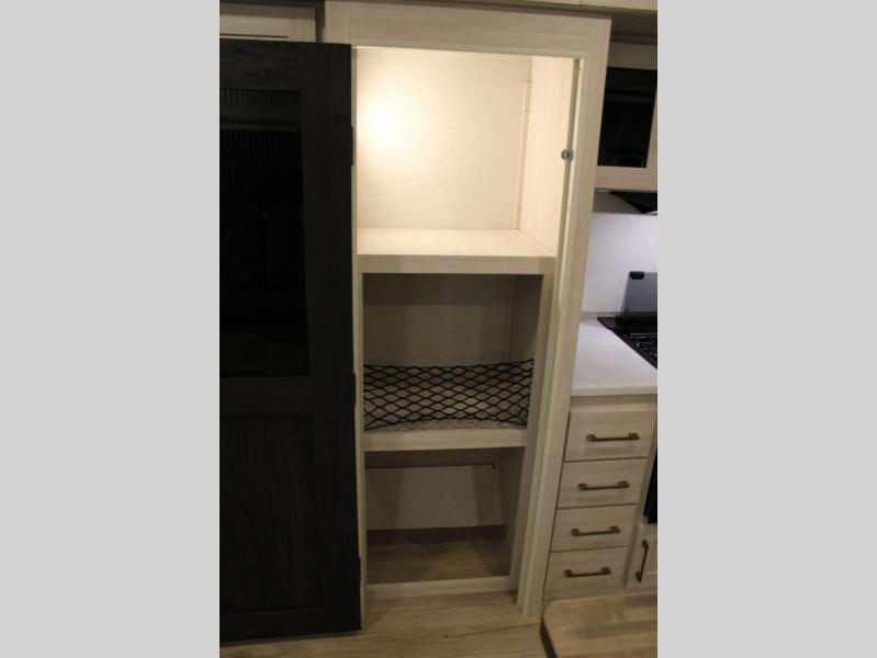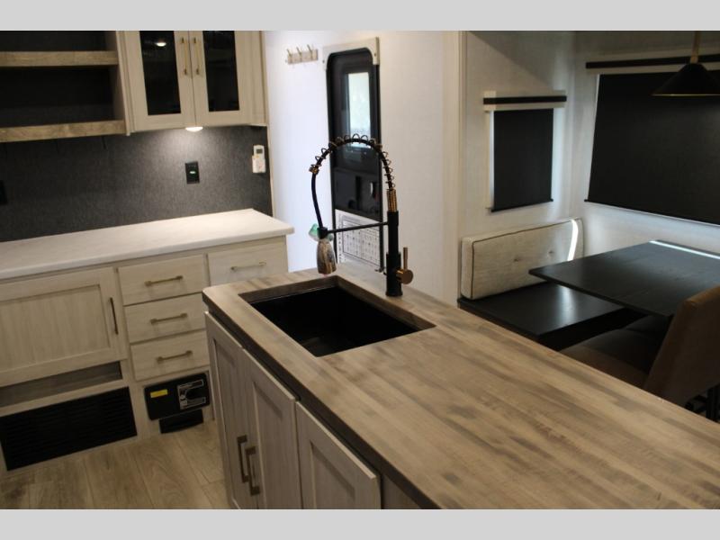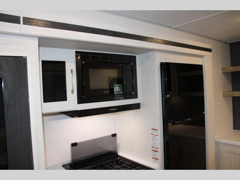 If luxury is what you're looking for, you won't have to search far with this travel trailer! There are triple slides, with dual opposing slides in the main living area for maximum space. The kitchen island gives a more residential feel to this space, plus there is a pantry, a hutch with shelves, a 10 cu. ft. 12V black glass refrigerator, and more kitchen features you are sure to love. The rear living area includes a tri-fold sofa to provide sleeping space for two overnight guests, and there is a theater seat across from the fireplace and HD TV. You'll also enjoy dining at the free-standing dinette with a multi-purpose ottoman! When it's time to call it a night, you can clean up in the spacious full bath, then head to the front master bedroom to retire. There is a custom king bed slide out here, along with a full-wall wardrobe in front, a dresser, a closet with washer and dryer prep, plus a bedroom fireplace!