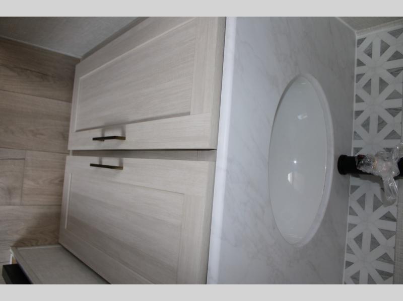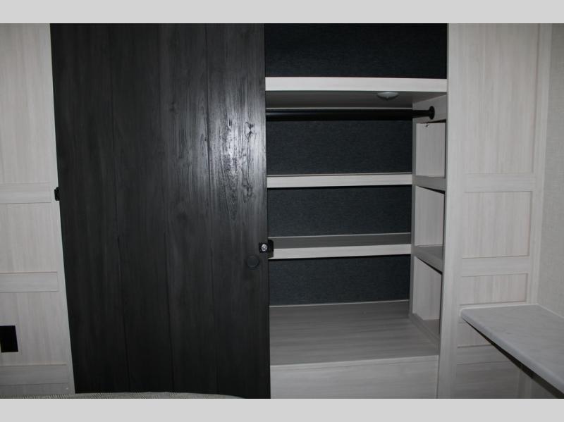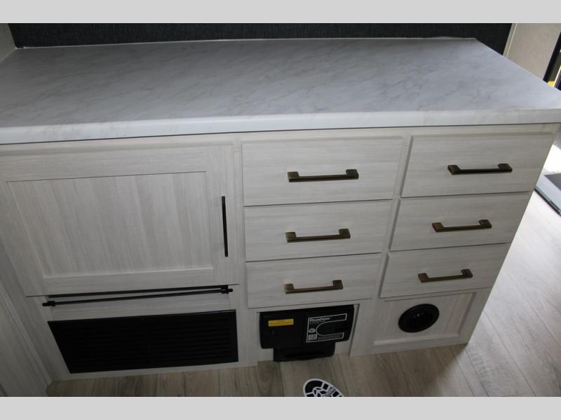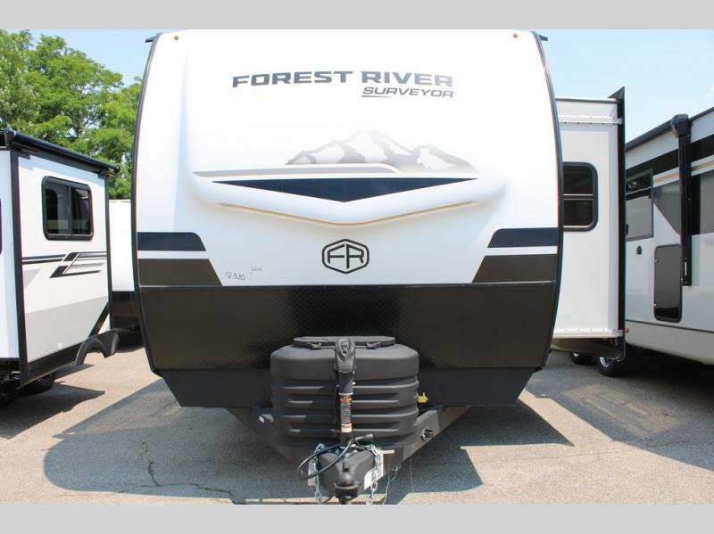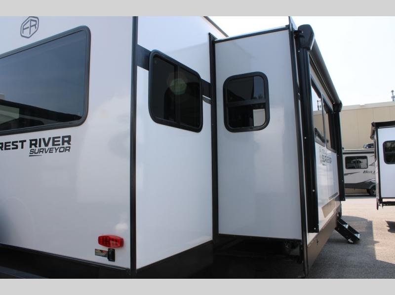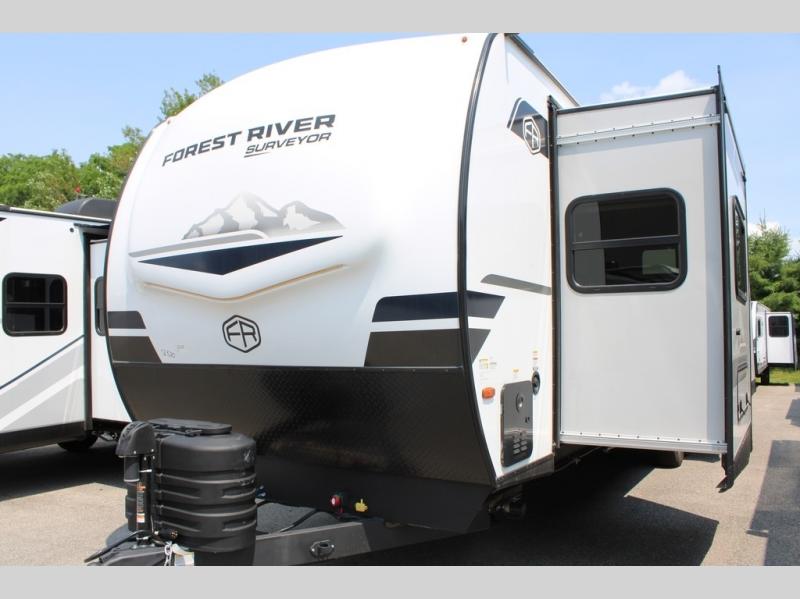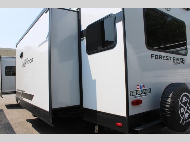 With any Grand Surveyor travel trailer by Forest River you will enjoy turn-key ready-to-go features and quality construction! Each model includes Azdel composite walls and a gel coated fiberglass front cap with an automotive style tinted windshield for a sleek look. There are friction hinge black glass entry door(s), an adjustable platform step with a night light, plus Goodyear tires and a power tongue jack for easy towing. The interior will have you feeling right at home with roller shades, residential faucets, sinks, and bathroom vanity, plus Surf(x) seamless countertops throughout. You can also plan for adventure with a 2" rear accessory and exterior spray port, and there are slam latch exterior baggage doors throughout to keep all your gear secure. Other stand-out features include a central vacuum system, a 200 watt solar panel with a 30 amp controller, a tankless water heater, carpet-free interiors, and the list goes on!