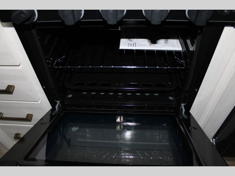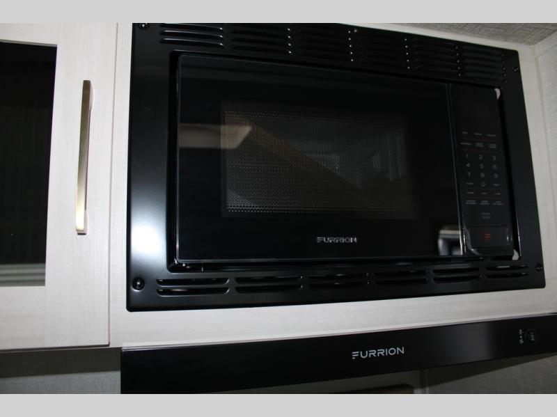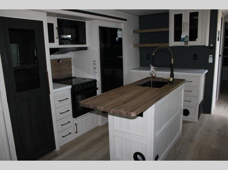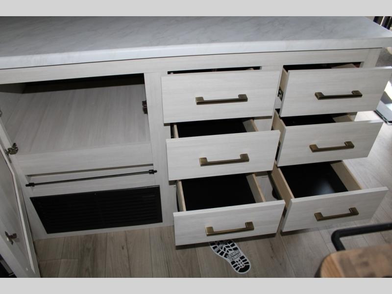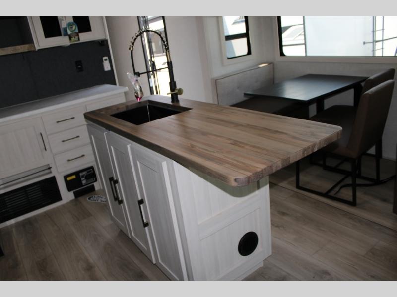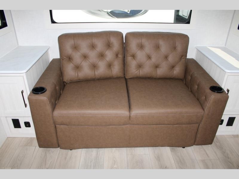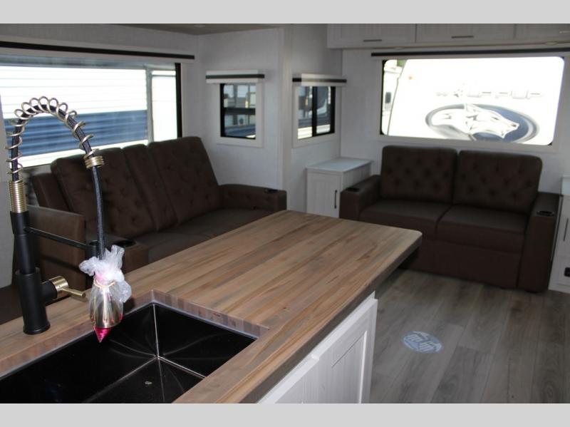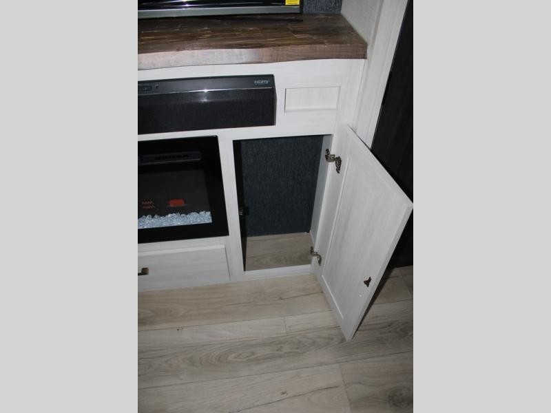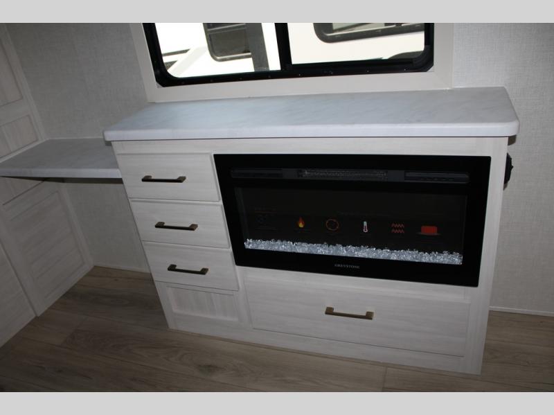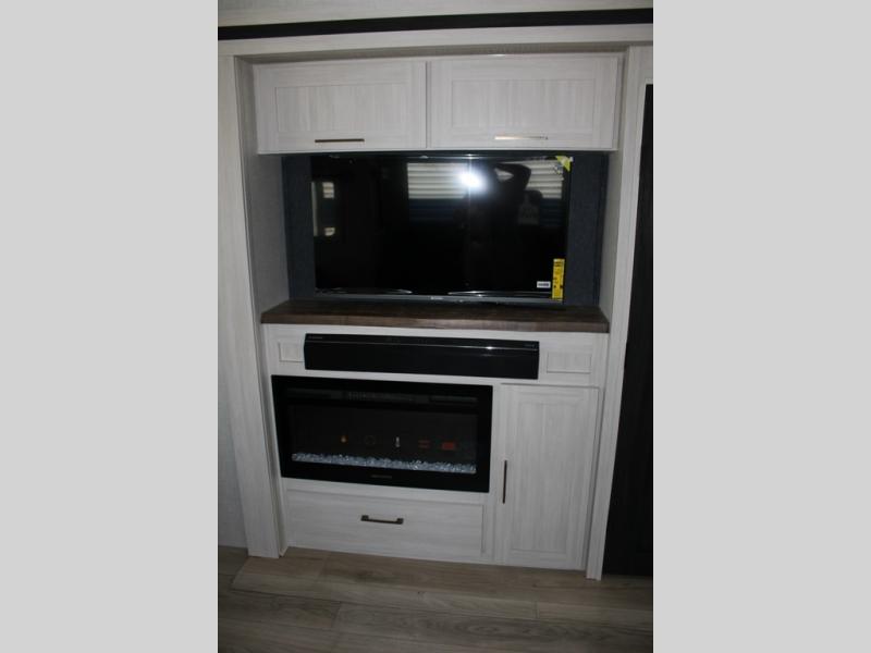 If luxury is what you're looking for, you won't have to search far with this travel trailer! There are triple slides, with dual opposing slides in the main living area for maximum space. The kitchen island gives a more residential feel to this space, plus there is a pantry, a hutch with shelves, a 10 cu. ft. 12V black glass refrigerator, and more kitchen features you are sure to love. The rear living area includes a tri-fold sofa to provide sleeping space for two overnight guests, and there is a theater seat across from the fireplace and HD TV. You'll also enjoy dining at the free-standing dinette with a multi-purpose ottoman! When it's time to call it a night, you can clean up in the spacious full bath, then head to the front master bedroom to retire. There is a custom king bed slide out here, along with a full-wall wardrobe in front, a dresser, a closet with washer and dryer prep, plus a bedroom fireplace!