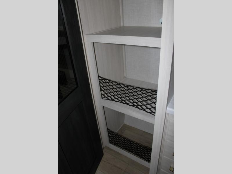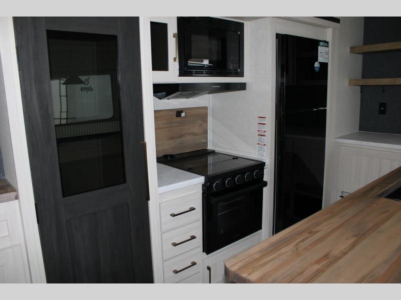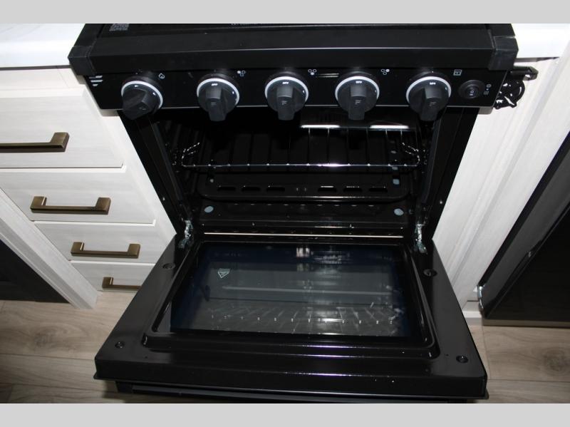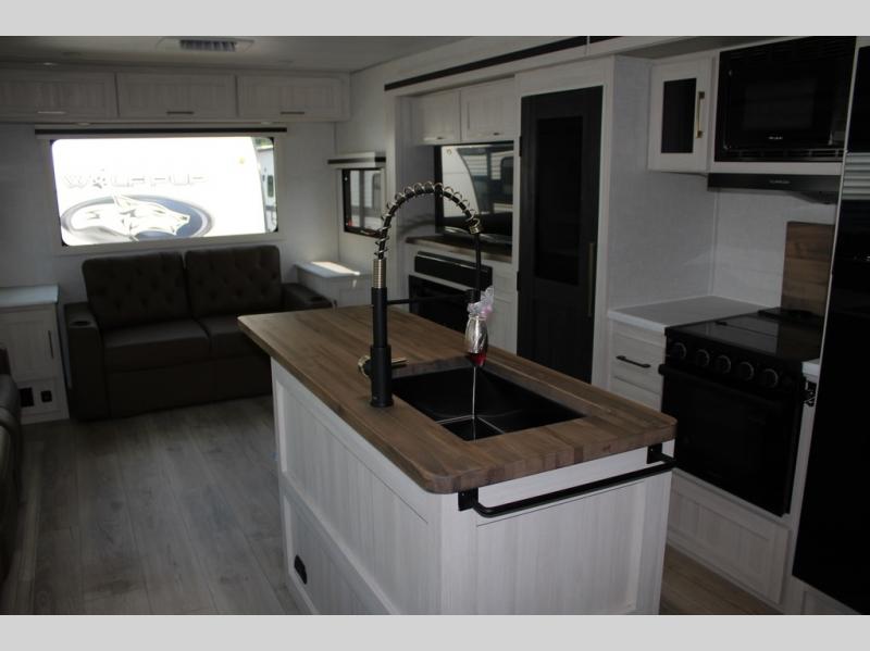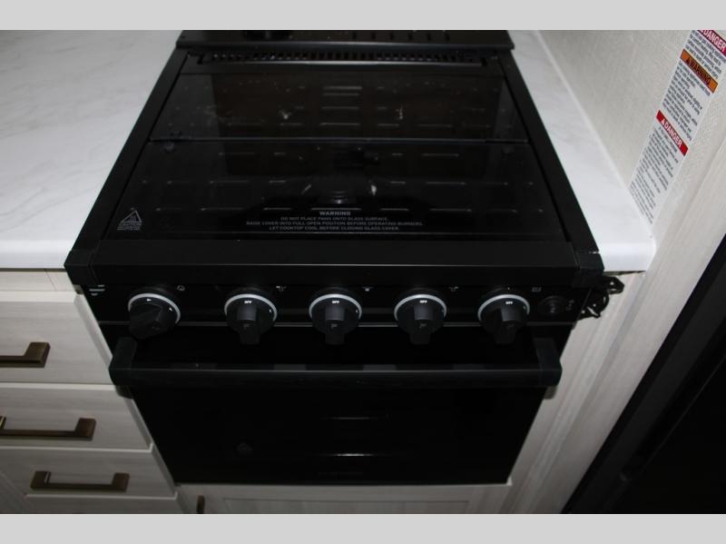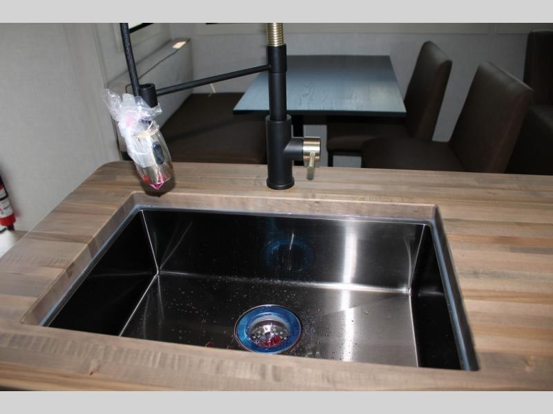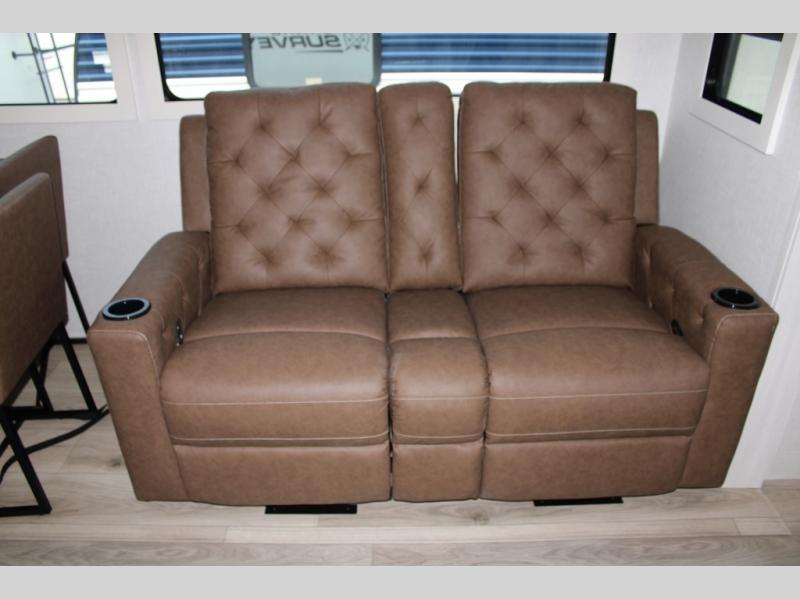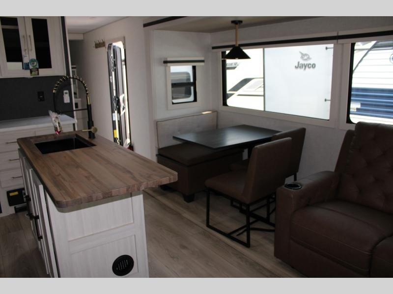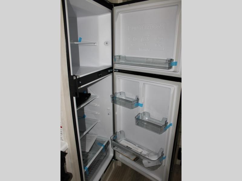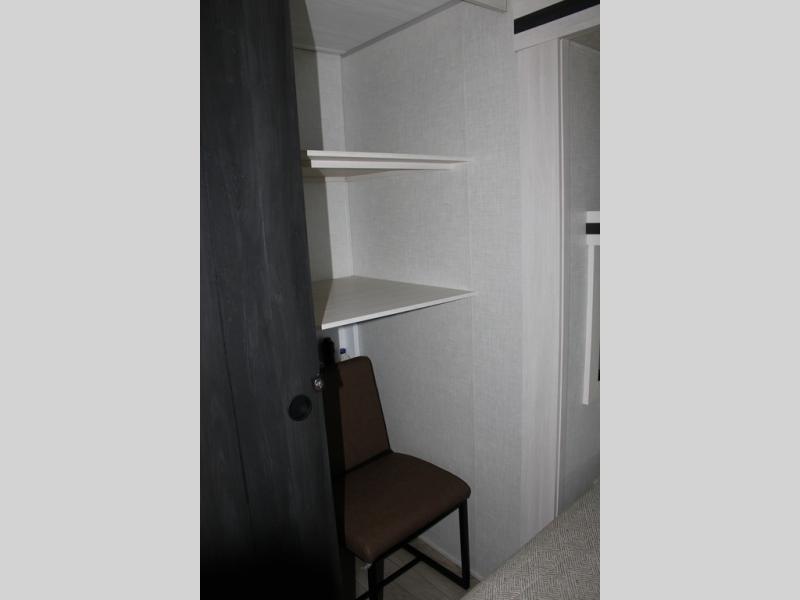 If luxury is what you're looking for, you won't have to search far with this travel trailer! There are triple slides, with dual opposing slides in the main living area for maximum space. The kitchen island gives a more residential feel to this space, plus there is a pantry, a hutch with shelves, a 10 cu. ft. 12V black glass refrigerator, and more kitchen features you are sure to love. The rear living area includes a tri-fold sofa to provide sleeping space for two overnight guests, and there is a theater seat across from the fireplace and HD TV. You'll also enjoy dining at the free-standing dinette with a multi-purpose ottoman! When it's time to call it a night, you can clean up in the spacious full bath, then head to the front master bedroom to retire. There is a custom king bed slide out here, along with a full-wall wardrobe in front, a dresser, a closet with washer and dryer prep, plus a bedroom fireplace!