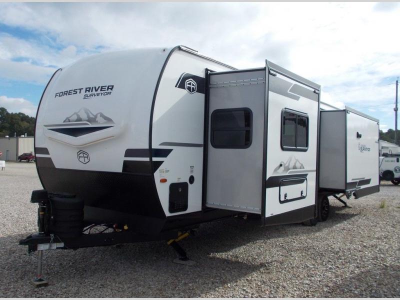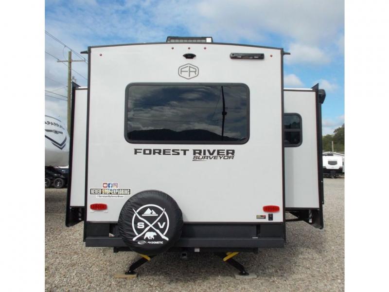 With any Grand Surveyor travel trailer by Forest River you will enjoy turn-key ready-to-go features and quality construction! Each model includes Azdel composite walls and a gel coated fiberglass front cap with an automotive style tinted windshield for a sleek look. There are friction hinge black glass entry door(s), an adjustable platform step with a night light, plus Goodyear tires and a power tongue jack for easy towing. The interior will have you feeling right at home with roller shades, residential faucets, sinks, and bathroom vanity, plus Surf(x) seamless countertops throughout. You can also plan for adventure with a 2" rear accessory and exterior spray port, and there are slam latch exterior baggage doors throughout to keep all your gear secure. Other stand-out features include a central vacuum system, Two (2) 200 watt solar panels with a 30 amp controller, a tankless water heater, carpet-free interiors, and the list goes on!