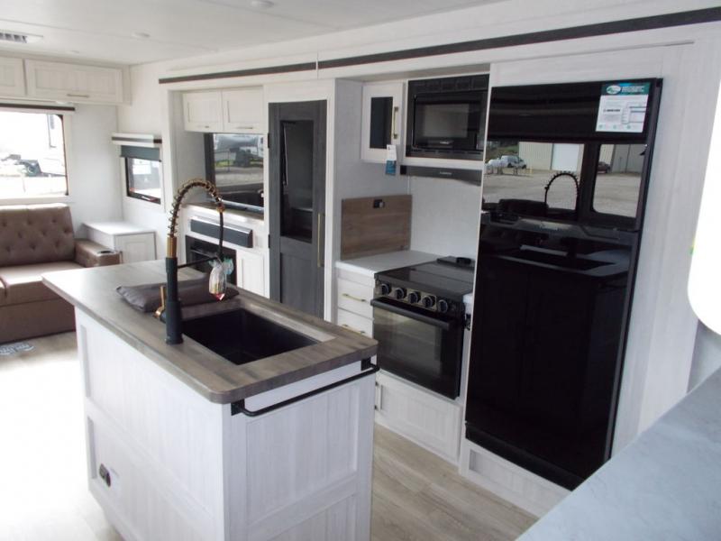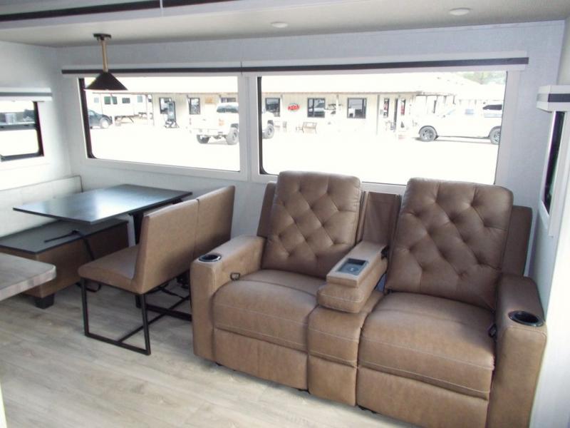 If luxury is what you're looking for, you won't have to search far with this travel trailer! There are triple slides, with dual opposing slides in the main living area for maximum space. The kitchen island gives a more residential feel to this space, plus there is a pantry, a hutch with shelves, a 10 cu. ft. 12V black glass refrigerator, and more kitchen features you are sure to love. The rear living area includes a tri-fold sofa to provide sleeping space for two overnight guests, and there is a theater seat across from the fireplace and HD TV. You'll also enjoy dining at the free-standing dinette with a multi-purpose ottoman! When it's time to call it a night, you can clean up in the spacious full bath, then head to the front master bedroom to retire. There is a custom king bed slide out here, along with a full-wall wardrobe in front, a dresser, a closet with washer and dryer prep, plus a bedroom fireplace!