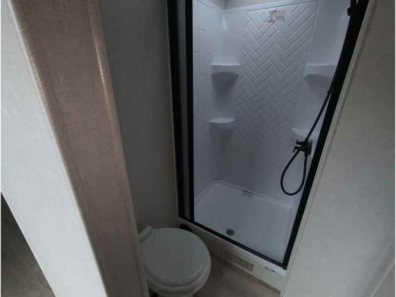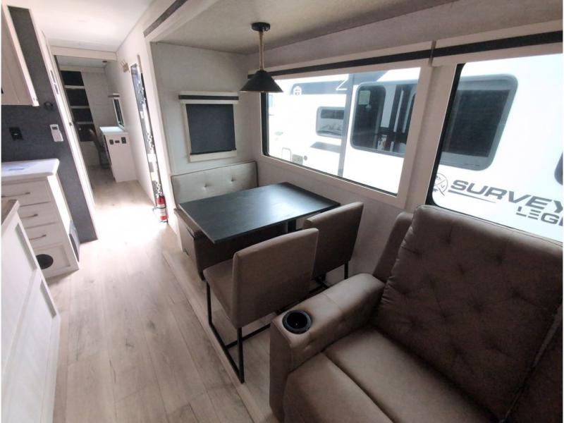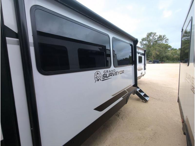 With any Grand Surveyor travel trailer by Forest River you will enjoy turn-key ready-to-go features and quality construction! Each model includes Azdel composite walls and a gel coated fiberglass front cap with an automotive style tinted windshield for a sleek look. There are friction hinge black glass entry door(s), an adjustable platform step with a night light, plus Goodyear tires and a power tongue jack for easy towing. The interior will have you feeling right at home with roller shades, residential faucets, sinks, and bathroom vanity, plus Surf(x) seamless countertops throughout. You can also plan for adventure with a 2" rear accessory and exterior spray port, and there are slam latch exterior baggage doors throughout to keep all your gear secure. Other stand-out features include a central vacuum system, a 200 watt solar panel with a 30 amp controller, a tankless water heater, carpet-free interiors, and the list goes on!