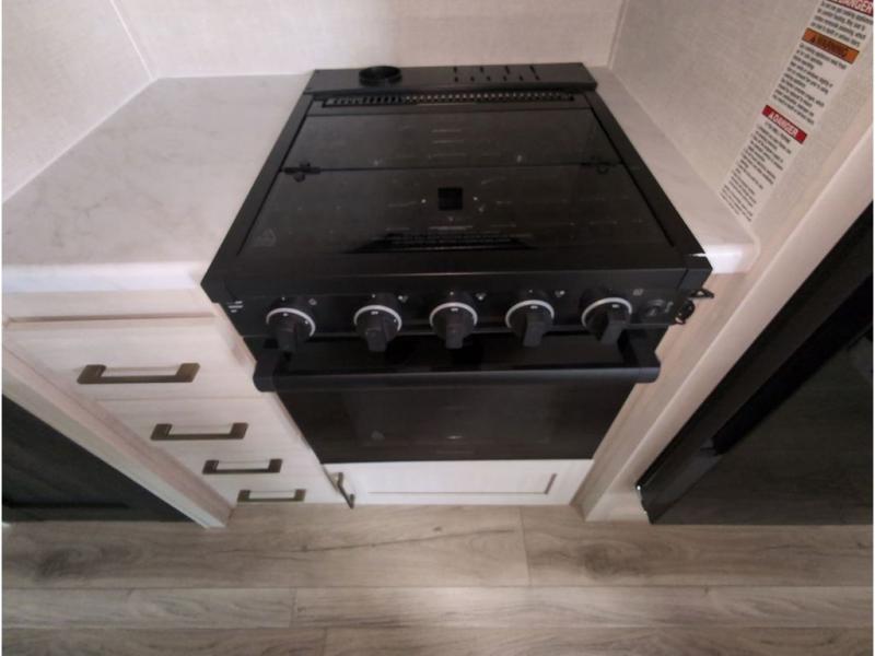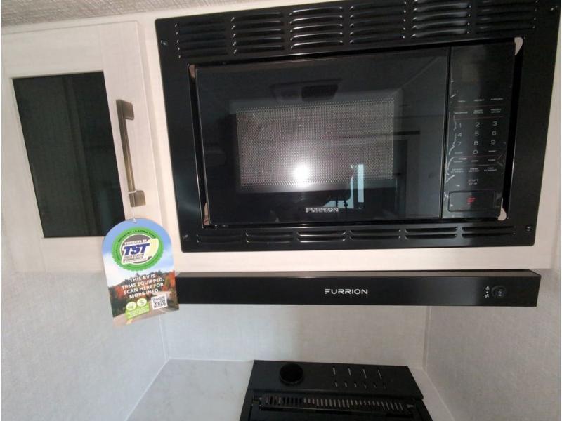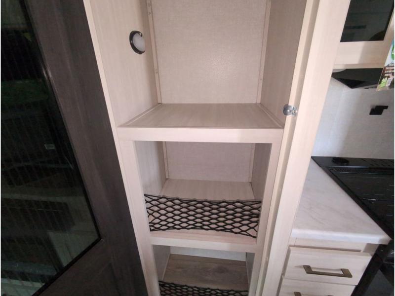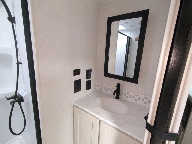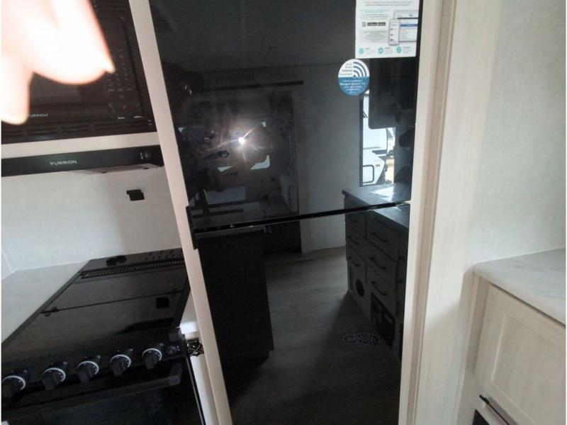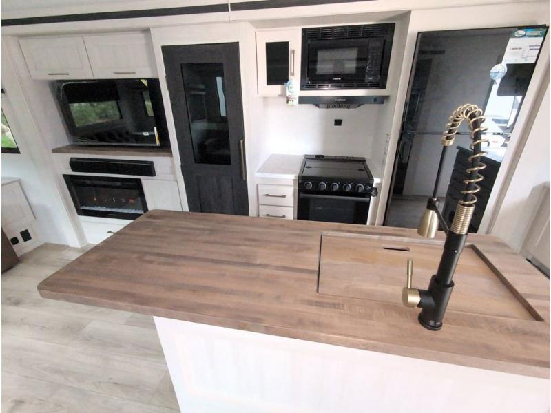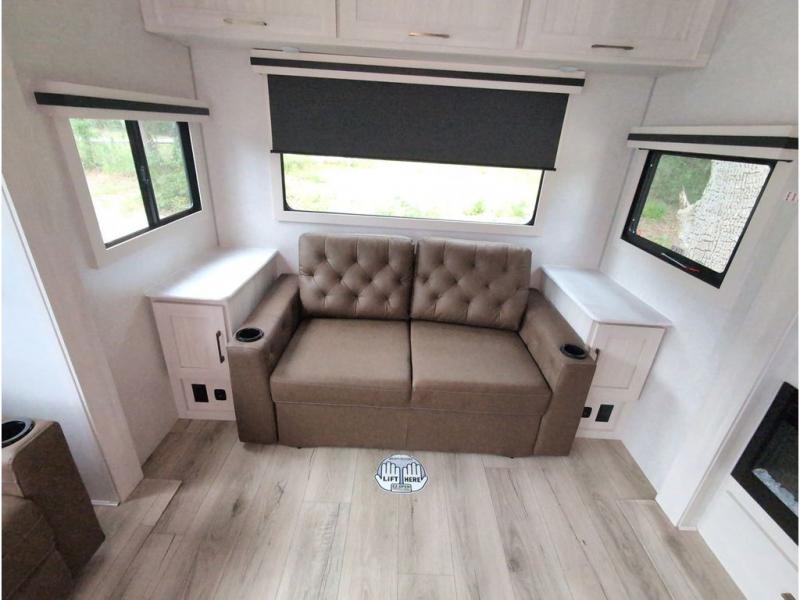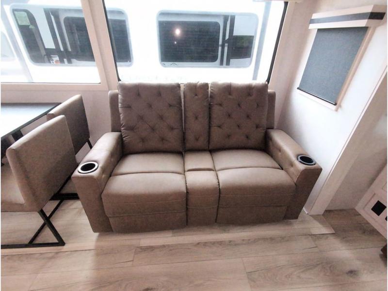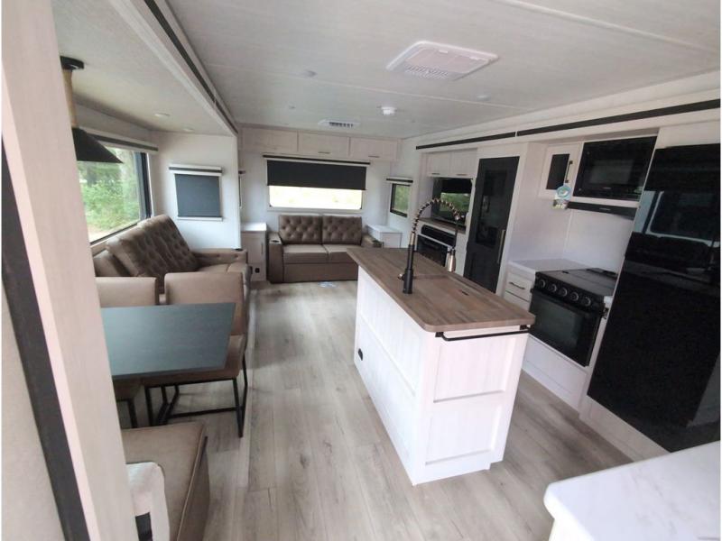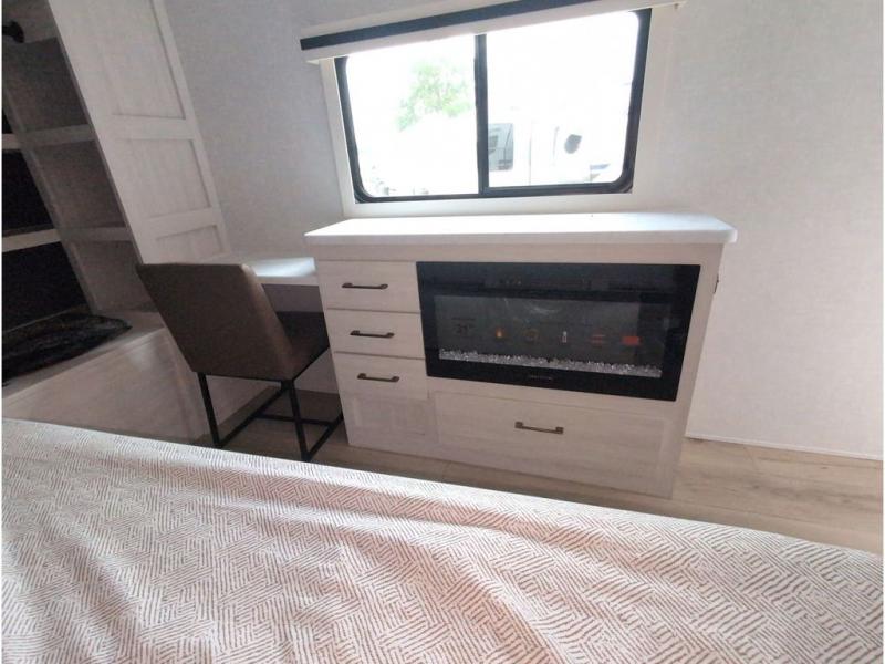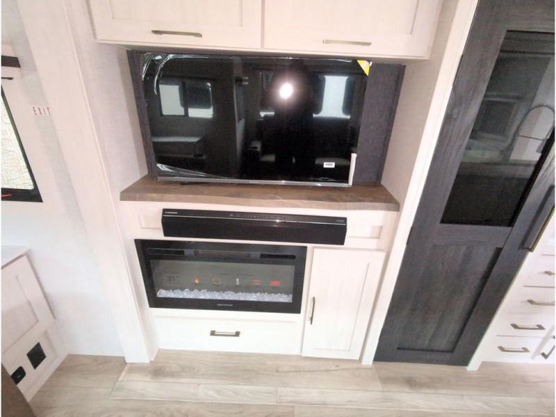 If luxury is what you're looking for, you won't have to search far with this travel trailer! There are triple slides, with dual opposing slides in the main living area for maximum space. The kitchen island gives a more residential feel to this space, plus there is a pantry, a hutch with shelves, a 10 cu. ft. 12V black glass refrigerator, and more kitchen features you are sure to love. The rear living area includes a tri-fold sofa to provide sleeping space for two overnight guests, and there is a theater seat across from the fireplace and HD TV. You'll also enjoy dining at the free-standing dinette with a multi-purpose ottoman! When it's time to call it a night, you can clean up in the spacious full bath, then head to the front master bedroom to retire. There is a custom king bed slide out here, along with a full-wall wardrobe in front, a dresser, a closet with washer and dryer prep, plus a bedroom fireplace!