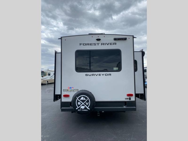 With any Grand Surveyor travel trailer by Forest River you will enjoy turn-key ready-to-go features and quality construction! Each model includes Azdel composite walls and a gel coated fiberglass front cap with an automotive style tinted windshield for a sleek look. There are friction hinge black glass entry door(s), an adjustable platform step with a night light, plus Goodyear tires and a power tongue jack for easy towing. The interior will have you feeling right at home with roller shades, residential faucets, sinks, and bathroom vanity, plus Surf(x) seamless countertops throughout. You can also plan for adventure with a 2" rear accessory and exterior spray port, and there are slam latch exterior baggage doors throughout to keep all your gear secure. Other stand-out features include a central vacuum system, a 200 watt solar panel with a 30 amp controller, a tankless water heater, carpet-free interiors, and the list goes on!