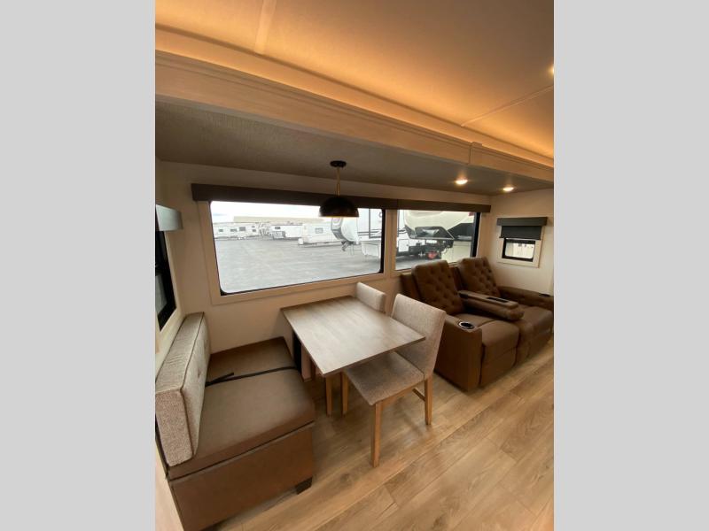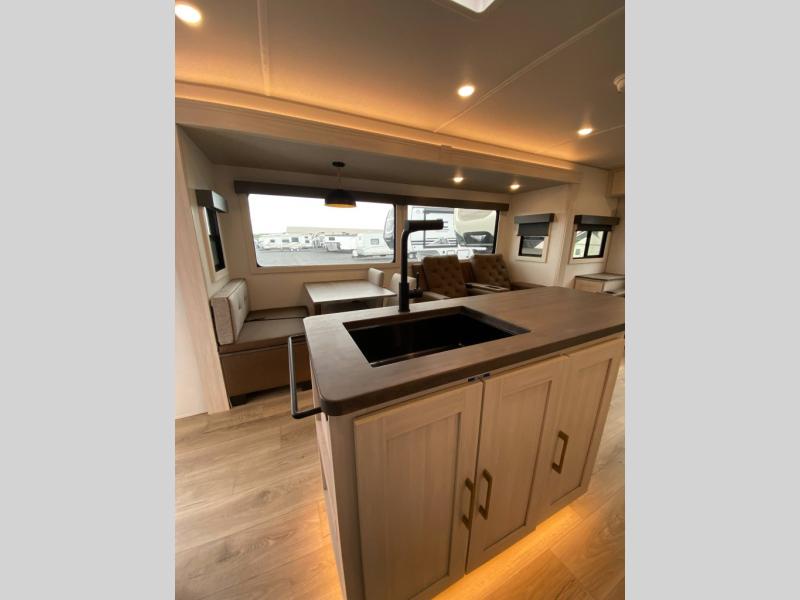 If luxury is what you're looking for, you won't have to search far with this travel trailer! There are triple slides, with dual opposing slides in the main living area for maximum space. The kitchen island gives a more residential feel to this space, plus there is a pantry, a hutch with shelves, a 10 cu. ft. 12V black glass refrigerator, and more kitchen features you are sure to love. The rear living area includes a tri-fold sofa to provide sleeping space for two overnight guests, and there is a theater seat across from the fireplace and HD TV. You'll also enjoy dining at the free-standing dinette with a multi-purpose ottoman! When it's time to call it a night, you can clean up in the spacious full bath, then head to the front master bedroom to retire. There is a custom king bed slide out here, along with a full-wall wardrobe in front, a dresser, a closet with washer and dryer prep, plus a bedroom fireplace!