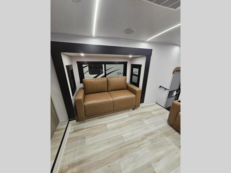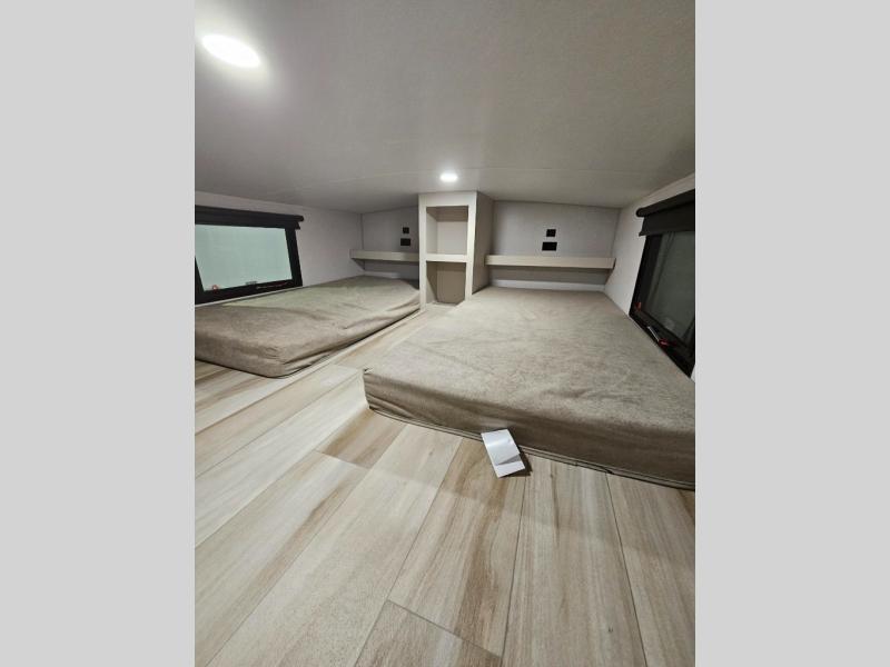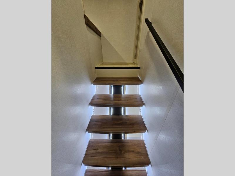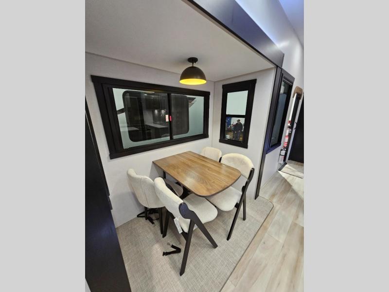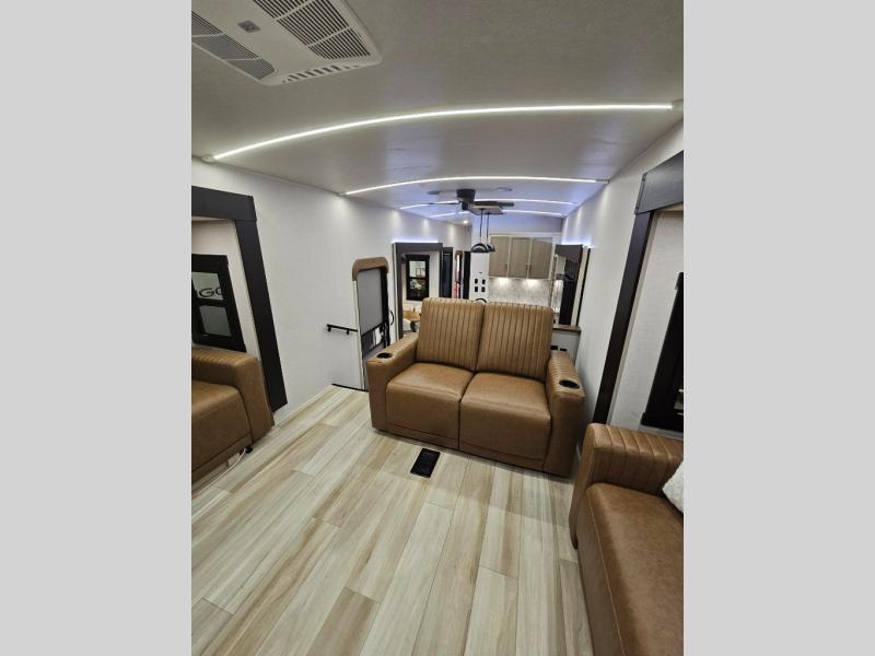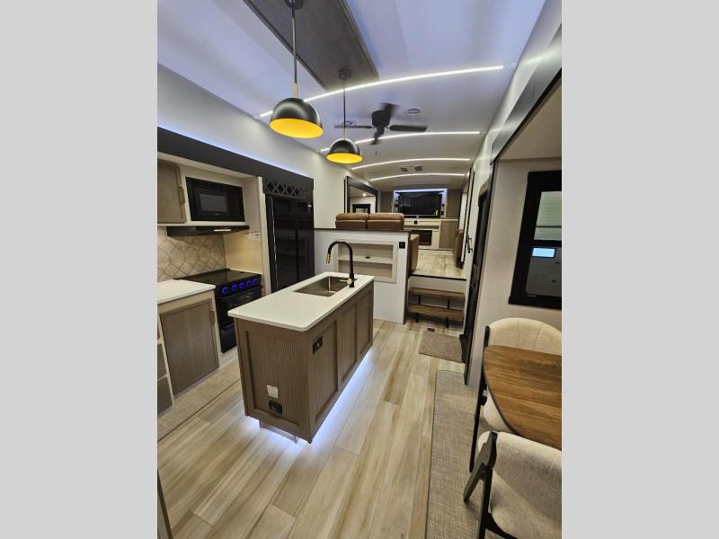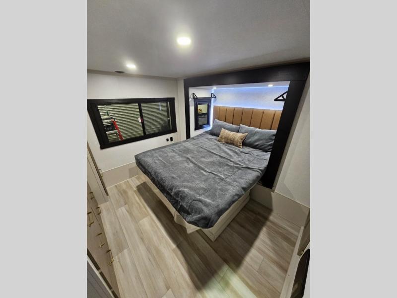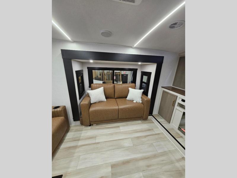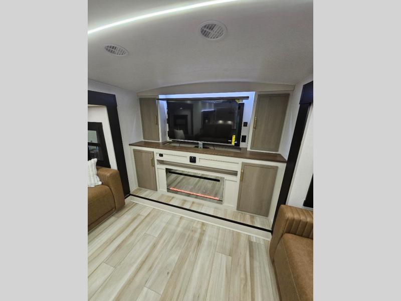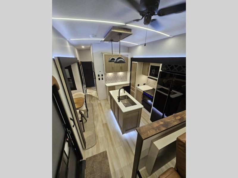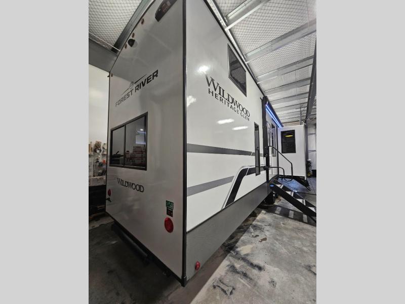 If you are looking for plenty of space, great views, and a place to call home, you have found it with this Wildwood Heritage Glen fifth wheel! The living area is separate from the kitchen and includes dual opposing tri-fold sofas with panoramic windows, theater seating with cupholders, and a 50" LED TV with a fireplace and storage along the front wall. The separate kitchen also offers lots of space with dual slides, a kitchen island, a free-standing table and chairs, and a hutch. You will find the loft stairs beside the full bathroom with a walk-in shower, and the rear private bedroom has a custom king bed slide for endless nights of rest and rejuvenation. There is so much more to enjoy from the loft above the bedroom, the pantry for lots of snack storage as well as the panoramic window in the kitchen and the residential walk-in shower in the full bathroom to mention a few.