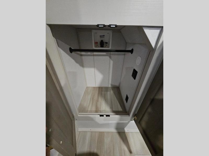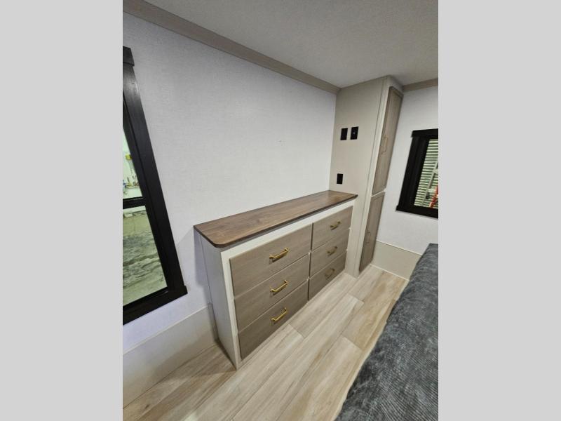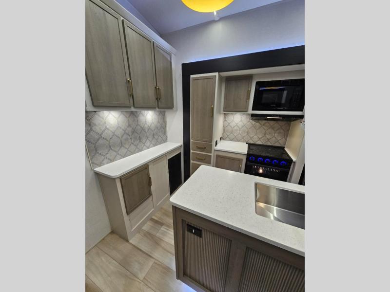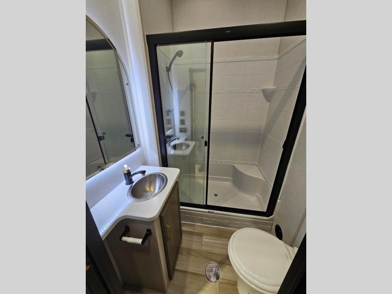 With any Wildwood Heritage Glen fifth wheel by Forest River, the quality construction, attention to detail and design along with a bright and welcoming interior allows you to relax in comfort with conveniences while exploring outdoors. The Summer Wind colored horizontal plank linoleum flooring is unique, beautiful and durable, and there are gold-accented faucets with stainless steel sinks in the bathrooms for added luxury. The Accessibelly underbelly with 12V tank heaters on all holding tanks allows you to camp anytime of year, and the power stabilizer jacks and landing gear will make set-up a breeze. More features that provide convenience include the high-end solid surface countertops, an RV Airflow System that provides at least 25% better airflow, and solar prep for off-grid capabilities.