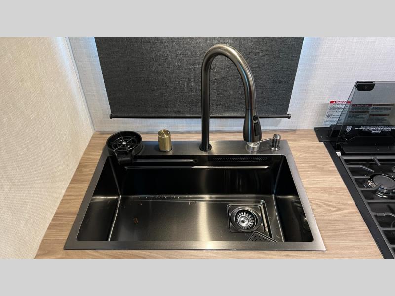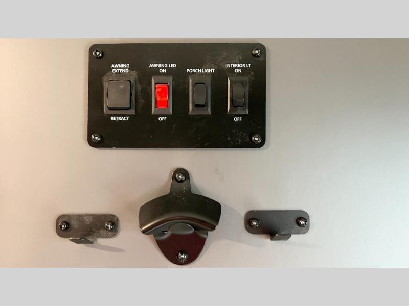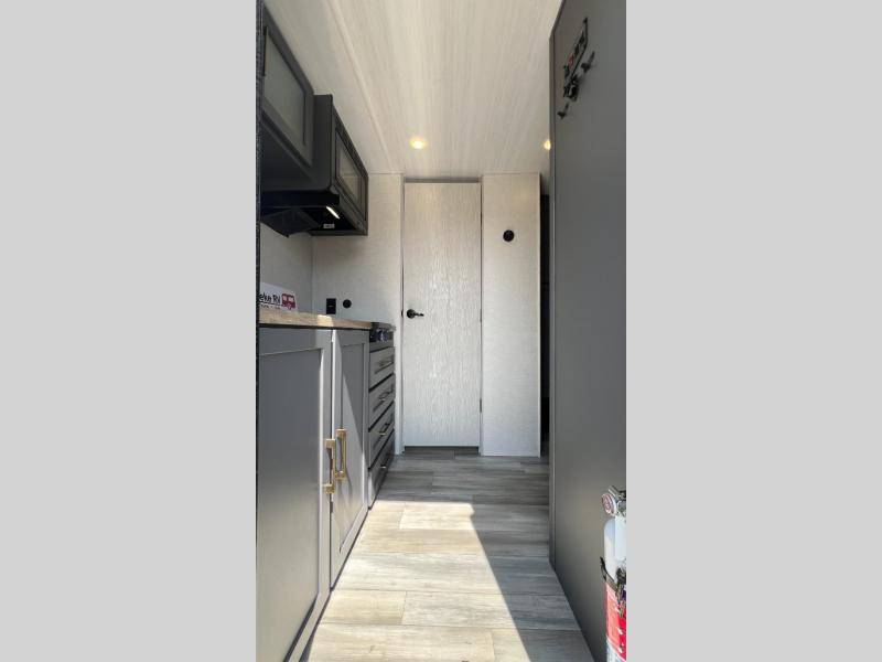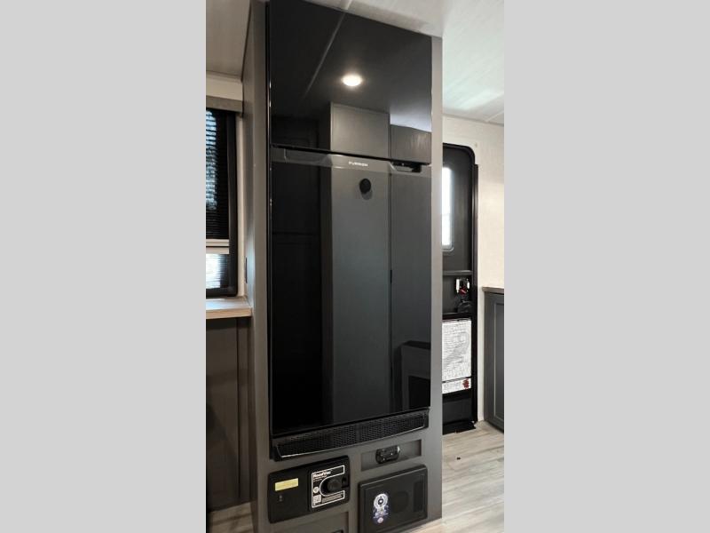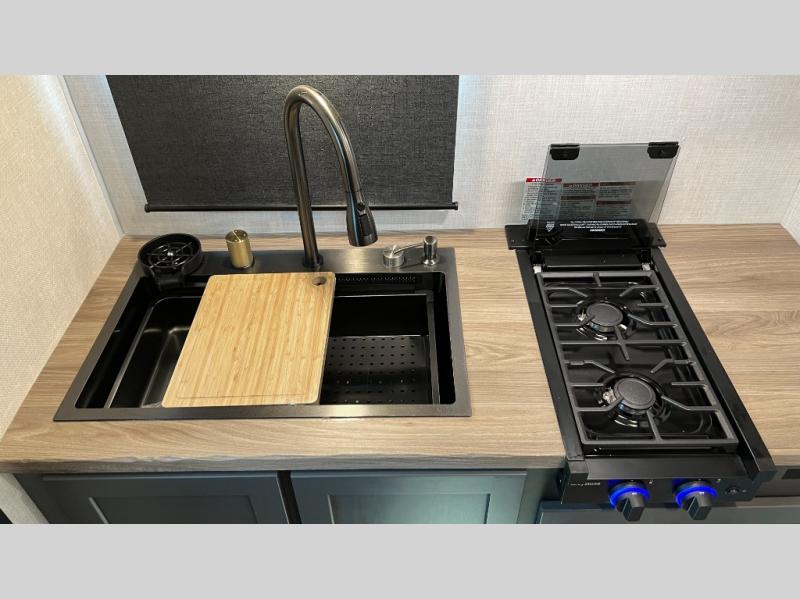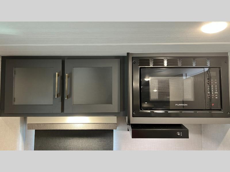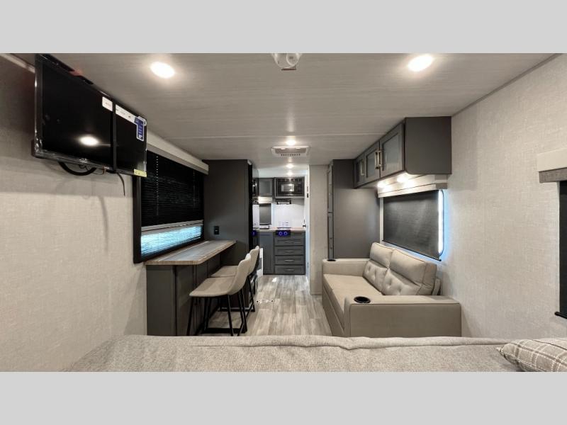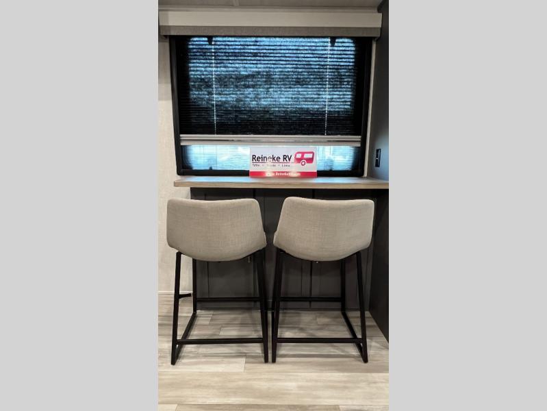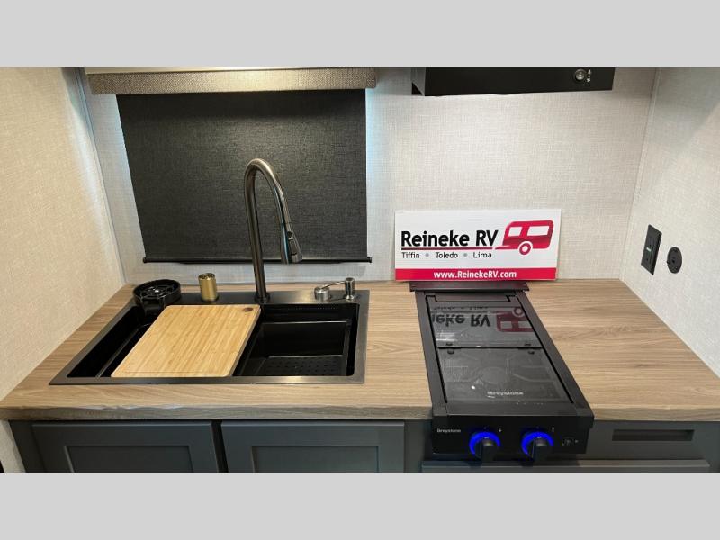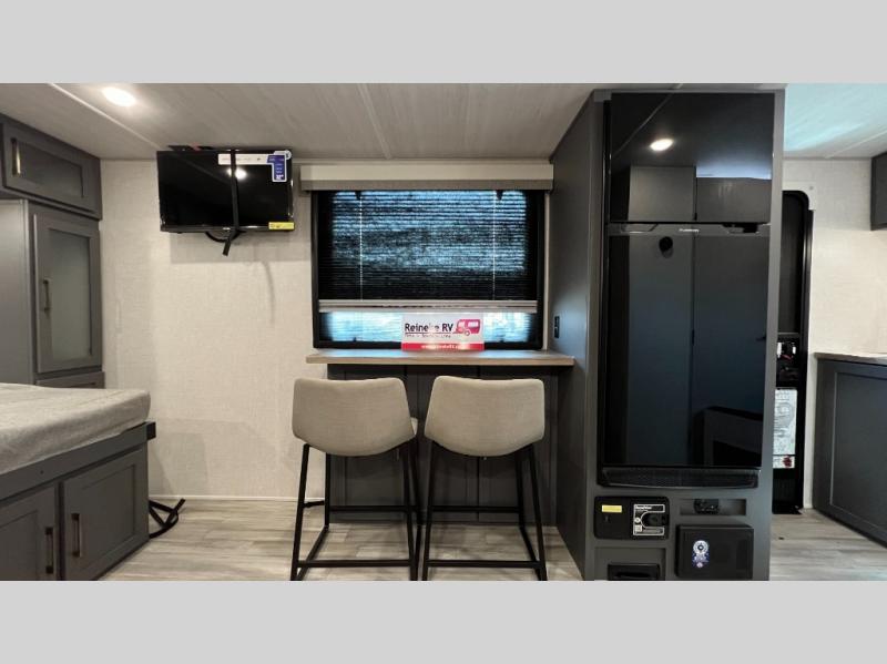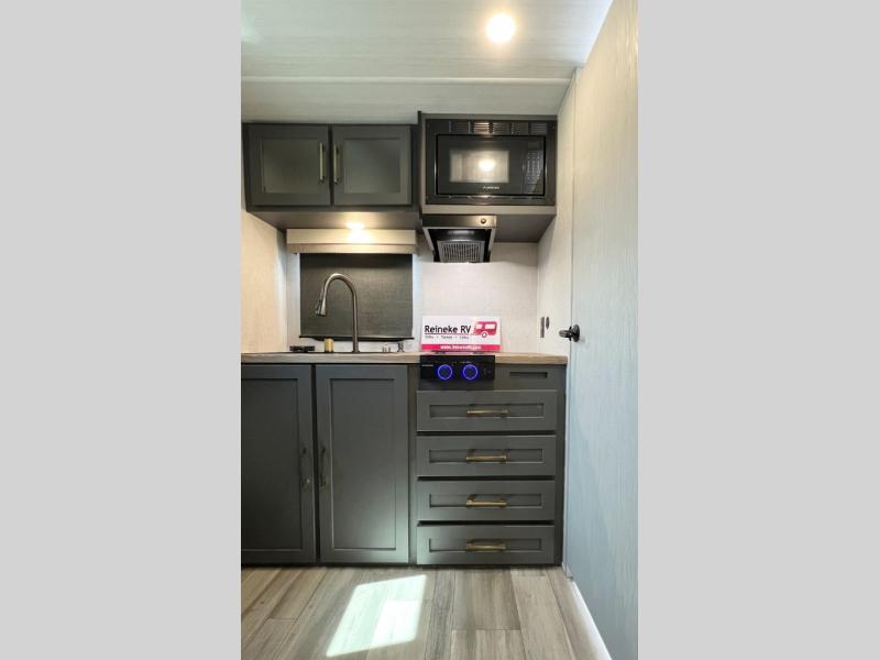 Grab your hiking gear and hit the road in this no-slide travel trailer! The front queen bed will provide a comfortable place to rest your head each night, and the rear corner full bath will let you freshen up without having to use the camp's facilities. The full kitchen includes an all-in-one microwave and air fryer plus a refrigerator to keep food stocked. You'll find comfortable seating space on the jackknife sofa, and you can enjoy your morning coffee at the counter with two stools and a flip-up window! This unit also includes an outside kitchen with a grill to keep the fish fry odors outside!