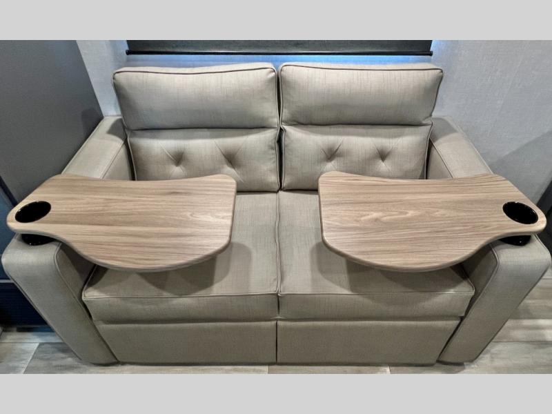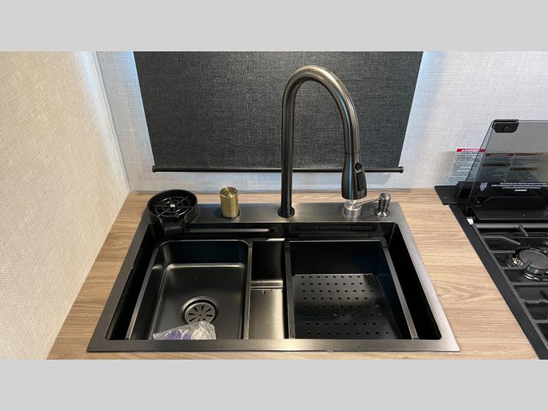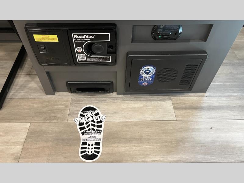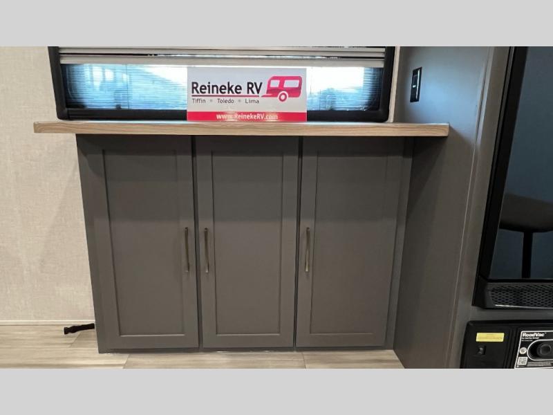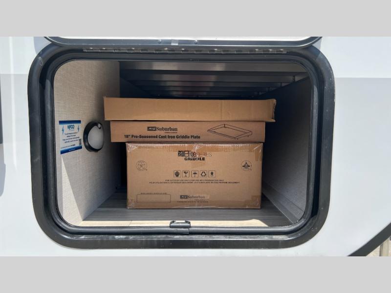 With 200W Solar Package, Central Vac System, Window Counter w/ Two Stools, Jackknife Sofa w/ Trays, Kitchen Pantry, Outdoor Griddle, Enclosed Under Belly, Cold Weather Package and Rugged Tire / Wheel Package.