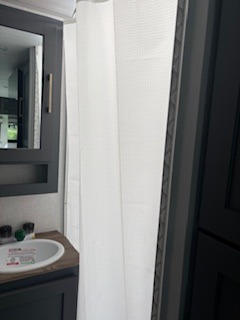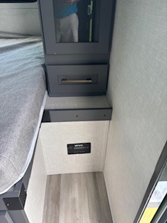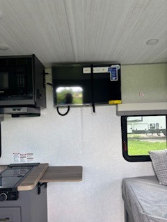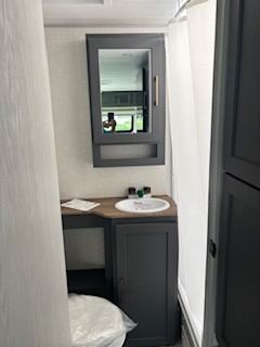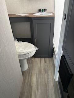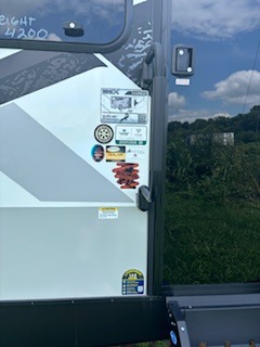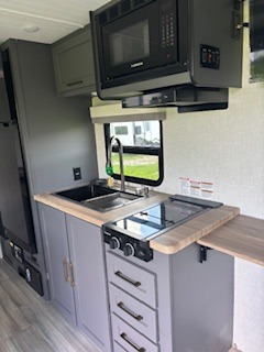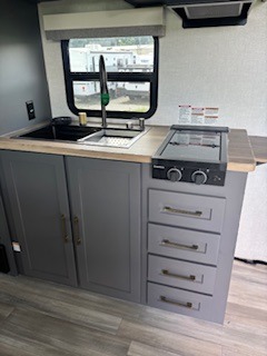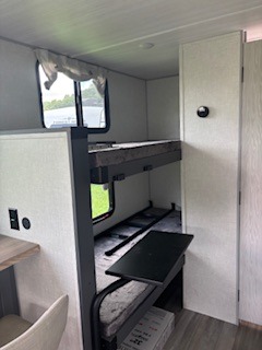 Grab your hiking gear and hit the road in this no-slide travel trailer! The front queen bed will provide a comfortable place to rest your head each night, and the rear corner full bath will let you freshen up without having to use the camp's facilities. There are also 30" x 74" bunk beds for the little ones or your guests to sleep on. The full kitchen includes an all-in-one microwave and air fryer plus a refrigerator to keep food stocked, although you might just find yourselves using the outside kitchen with a grill more! There is also a patio awning outside, along with slam latch cargo doors with pass-thru lighting!
