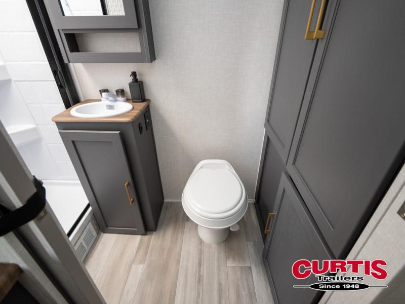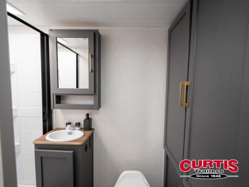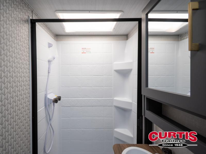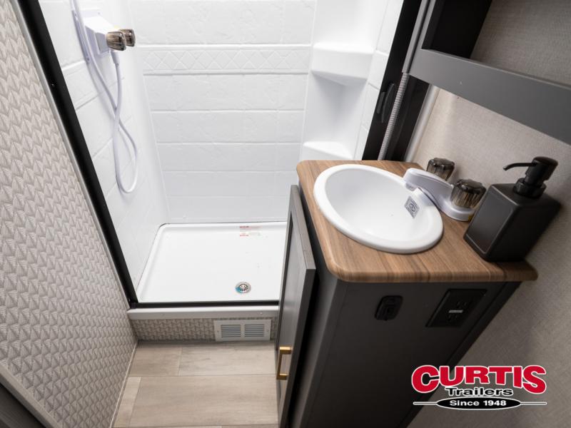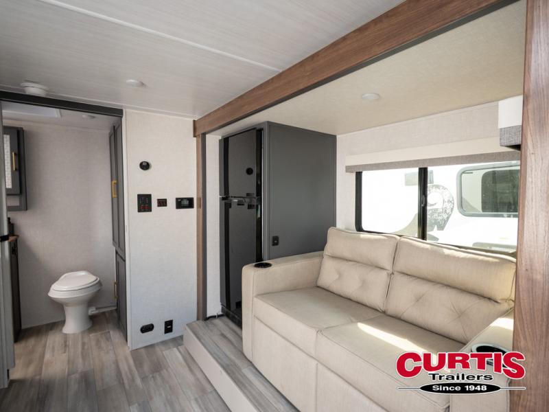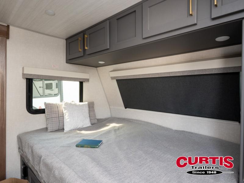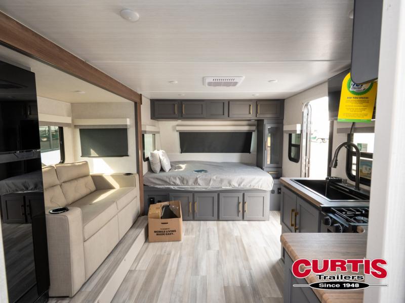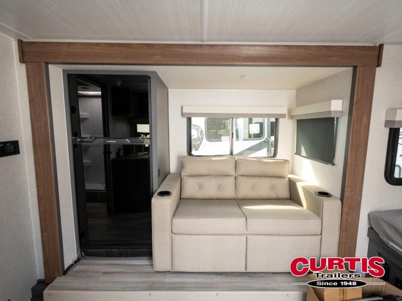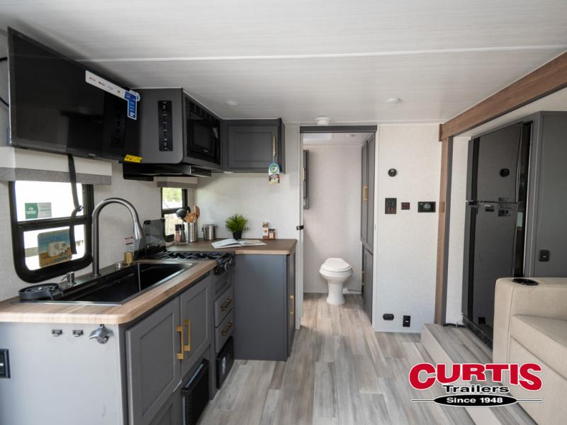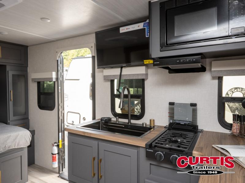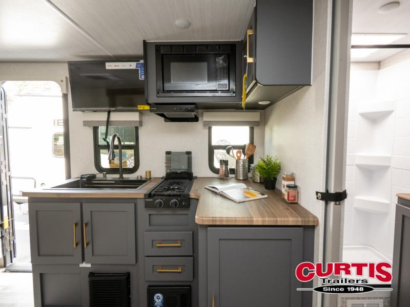 Grab your hiking gear and hit the road in this single slide out travel trailer! The front queen bed will provide a comfortable place to rest your head each night, and the full rear bath will let you freshen up without having to use the camp's facilities. The full kitchen includes an all-in-one microwave and air fryer plus a refrigerator to keep food stocked. You'll be able to relax on the sofa slide out that sits across from the entertainment center, and when you're ready for bed, the front queen bed will be waiting for you. There is also a wardrobe and overhead cabinet to keep your things tidy!