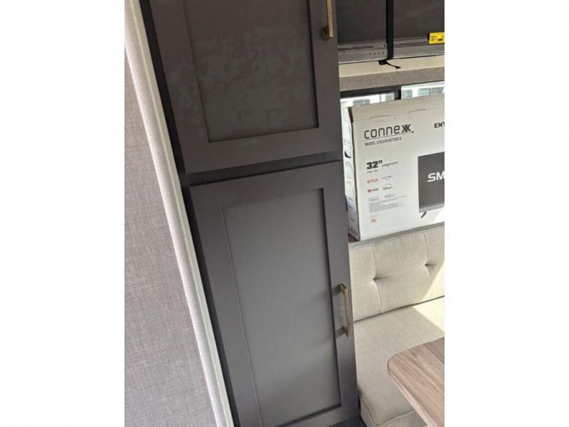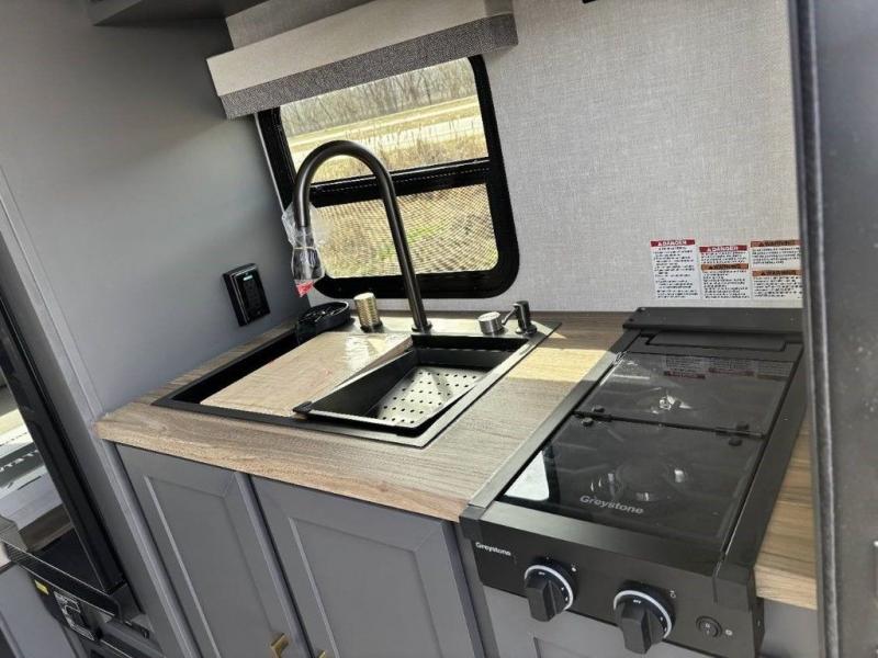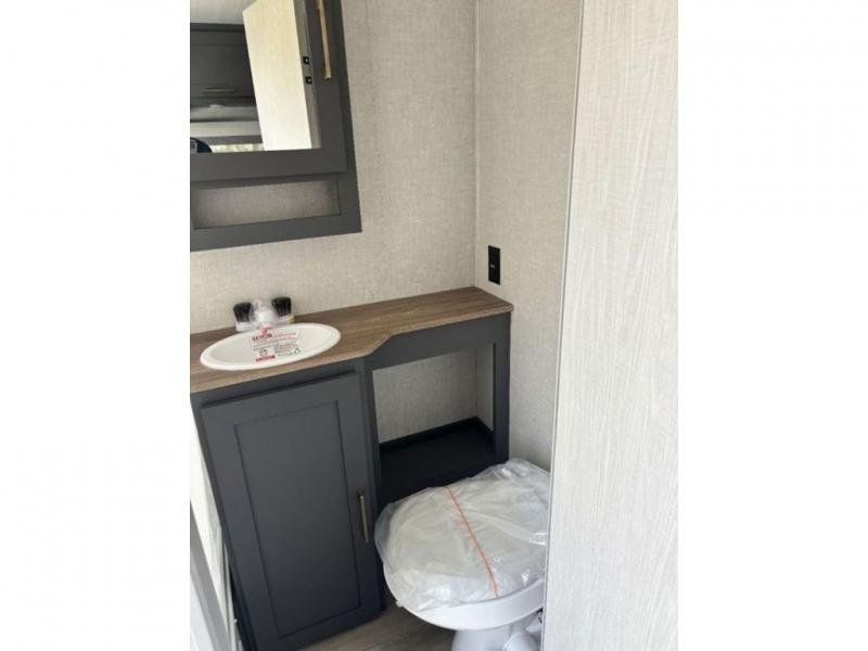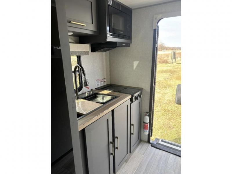 Grab your hiking gear and hit the road in this no-slide travel trailer! The front queen-size bed with a U-shaped dinette below provides versatile seating and sleeping space, and the rear corner full bath will let you freshen up without having to use the camp's facilities. The full kitchen includes an all-in-one microwave and air fryer plus a refrigerator to keep food stocked. This unit also includes an outside kitchen with a grill to keep the fish fry odors outside!