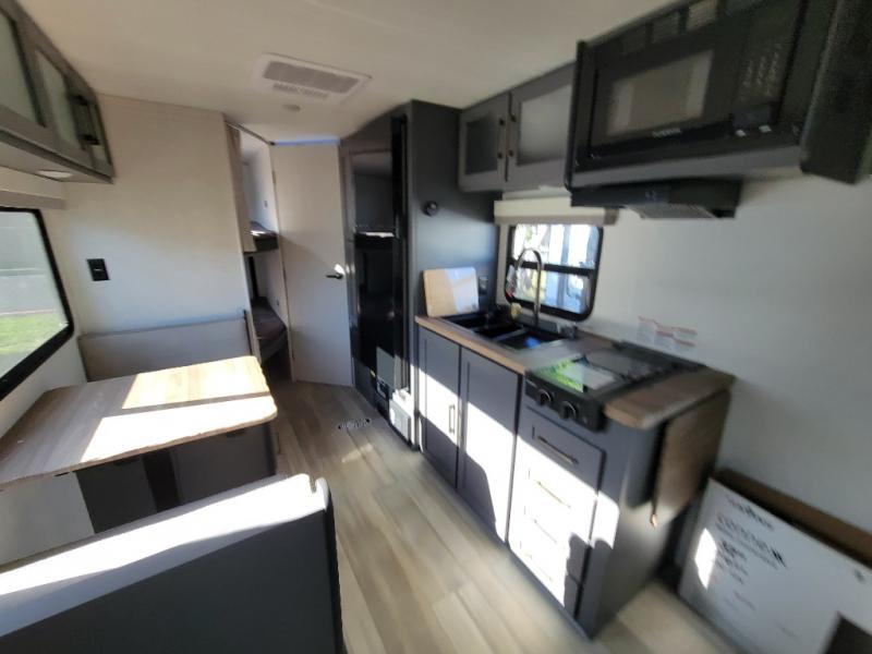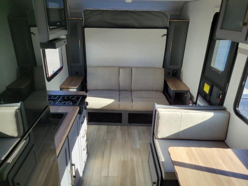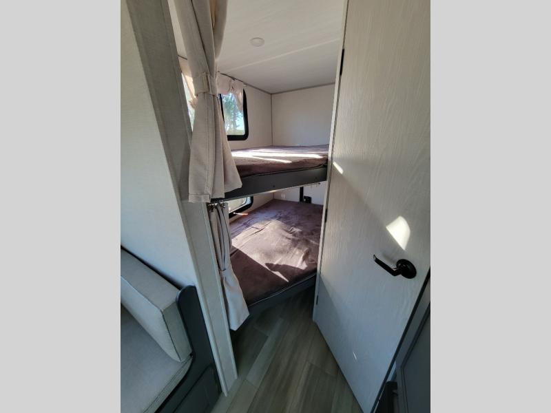 Start camping every chance you get with this easy-to-tow trailer! Once at camp, you can head out to explore to return to a versatile front area that offers a sofa during the daytime and a Murphy bed at night. There is a dinette for two to dine at as well as one to sleep on if needed, plus the galley kitchen provides the cook everything they need to feed one to several. There is a pantry for storage as well. The 44" x 74" double-size bunks will sleep two and maybe four kiddos, and the full bathroom will keep everyone refreshed. There is a pass-through compartment for the larger items like fishing poles and outdoor tables and a patio awning for some sun protection.