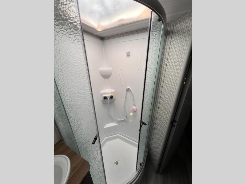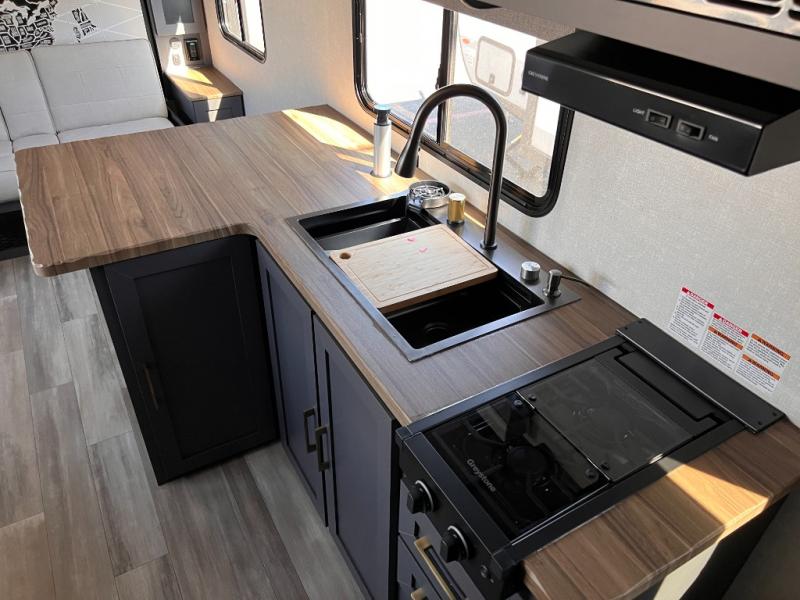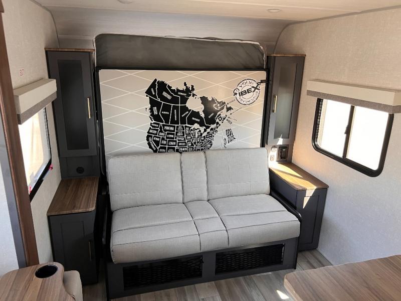 This Ibex travel trailer is incredibly versatile! With two sofas, there's plenty of room to relax inside, or set up outdoors under the 16' awning. There's a 60" x 80" Murphy bed where you'll be able to sleep comfortably, and you can dine in style at the L-shaped countertop with bar stool seats and chat with the cook in the kitchen. At the rear you'll find a full bath with a radius shower, a toilet, and a sink with a medicine cabinet above it.